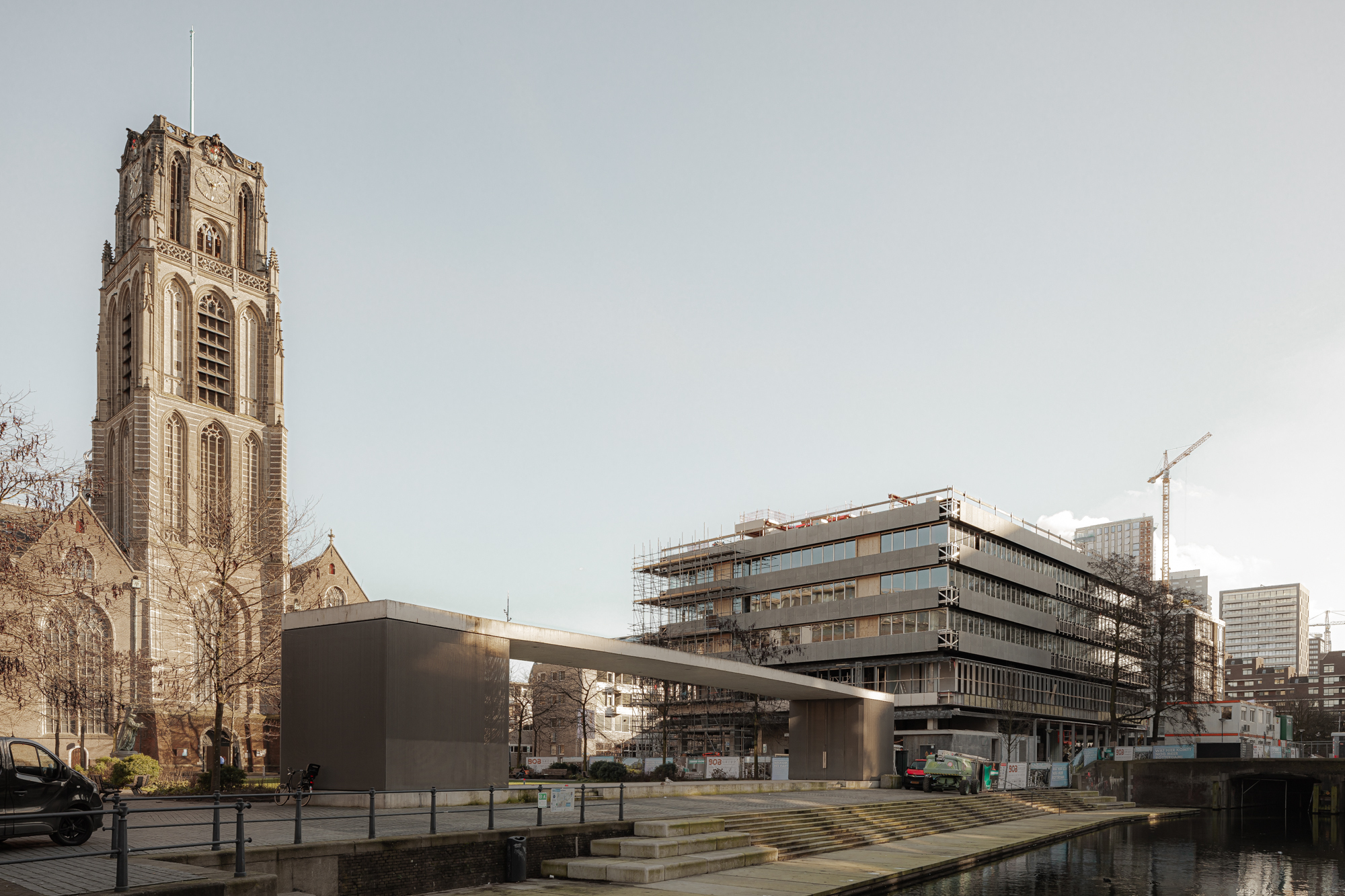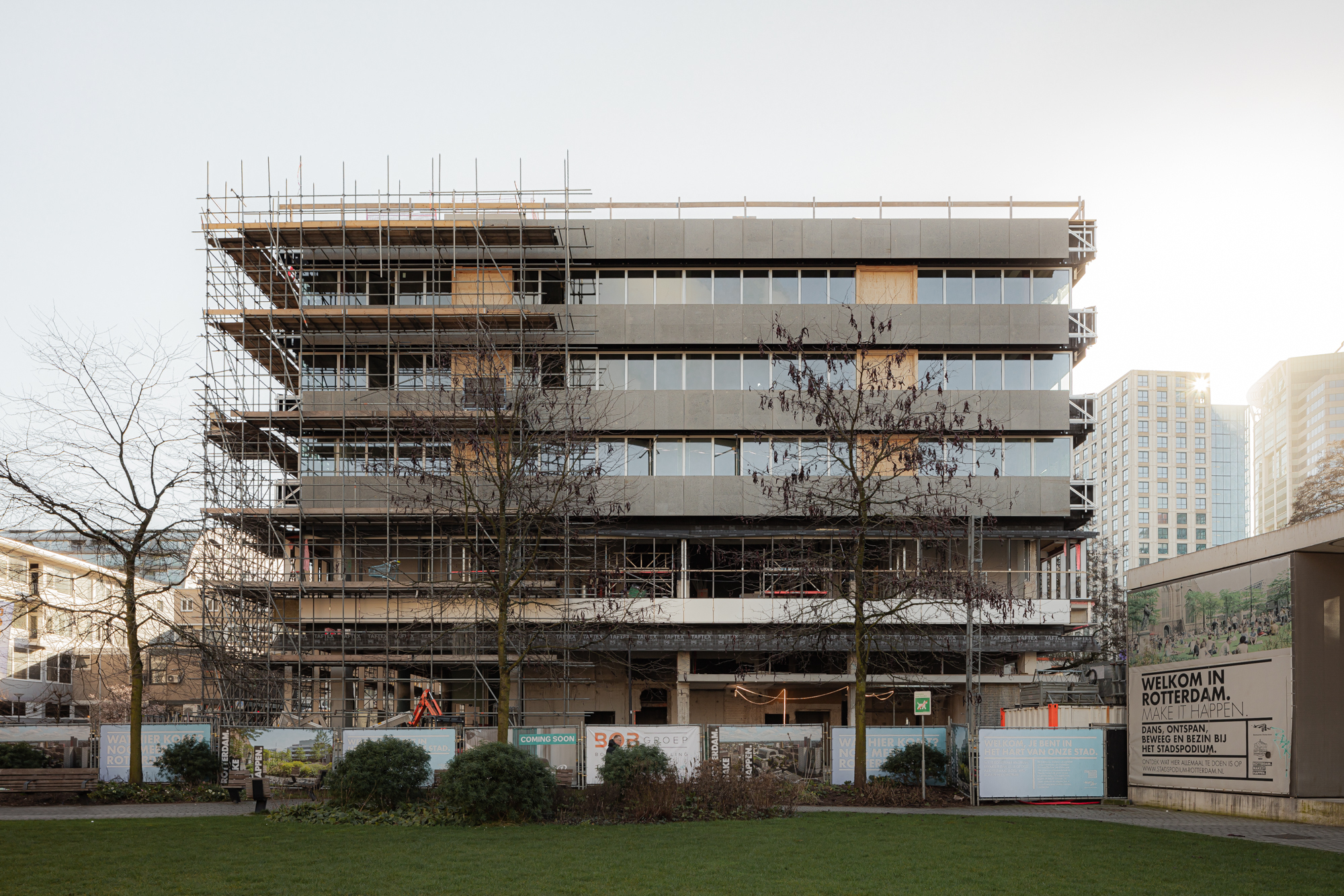 Above the plinth, a glass box and natural stone volumes follow in a horizontal alignment. Few carefully chosen materials manifest in a natural yet elegant ensemble. Inside the building, a patio will bring light into the hotel. On top of the 5th floor, a terrace and a pavilion will be surrounded by a green roof looking out over the city centre of Rotterdam. Photographs by Sebastian van Damme.