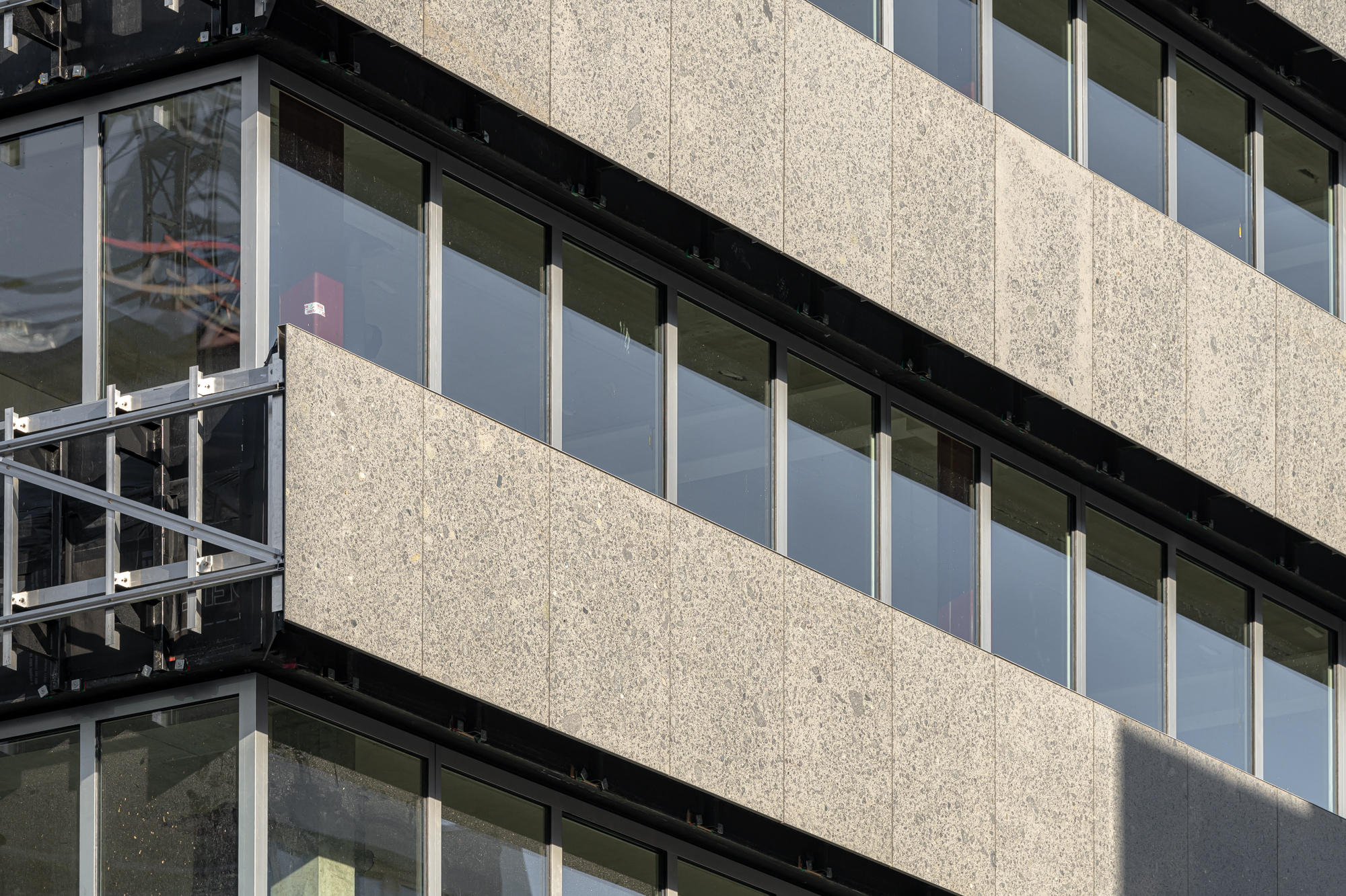 Strong volumes with deep setbacks in a horizontal composition and sharp canopies are original qualities reinterpreted and translated into a contemporary building. The façade design is equivalent on all sides of the building with a transparent plinth of big glass panels resembling the rhythm of the original façade.