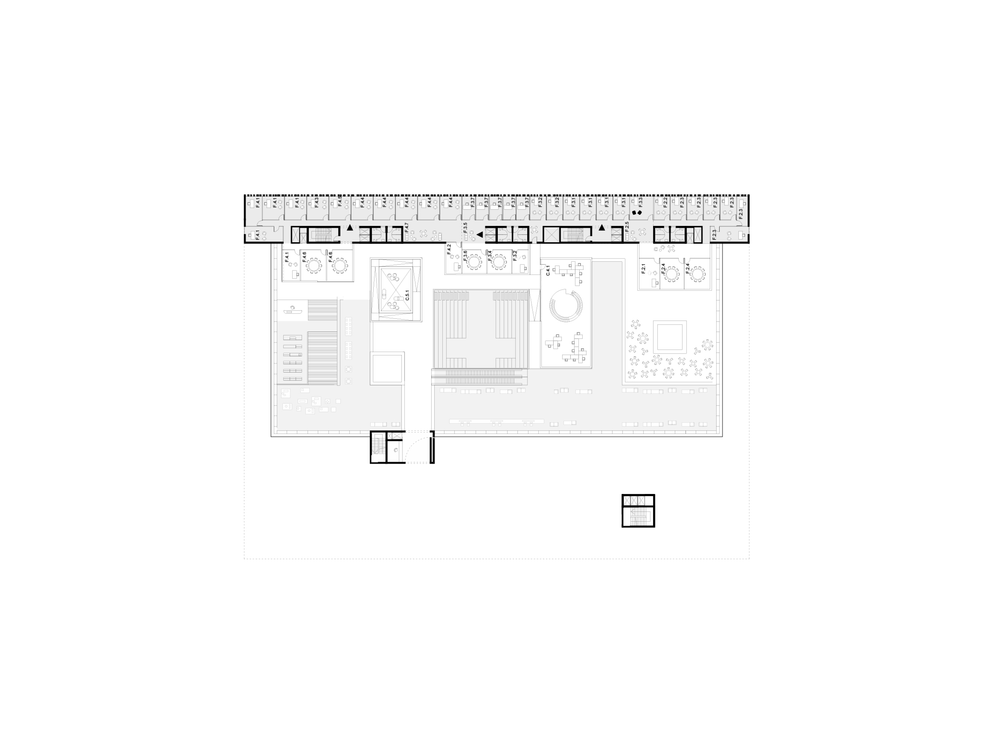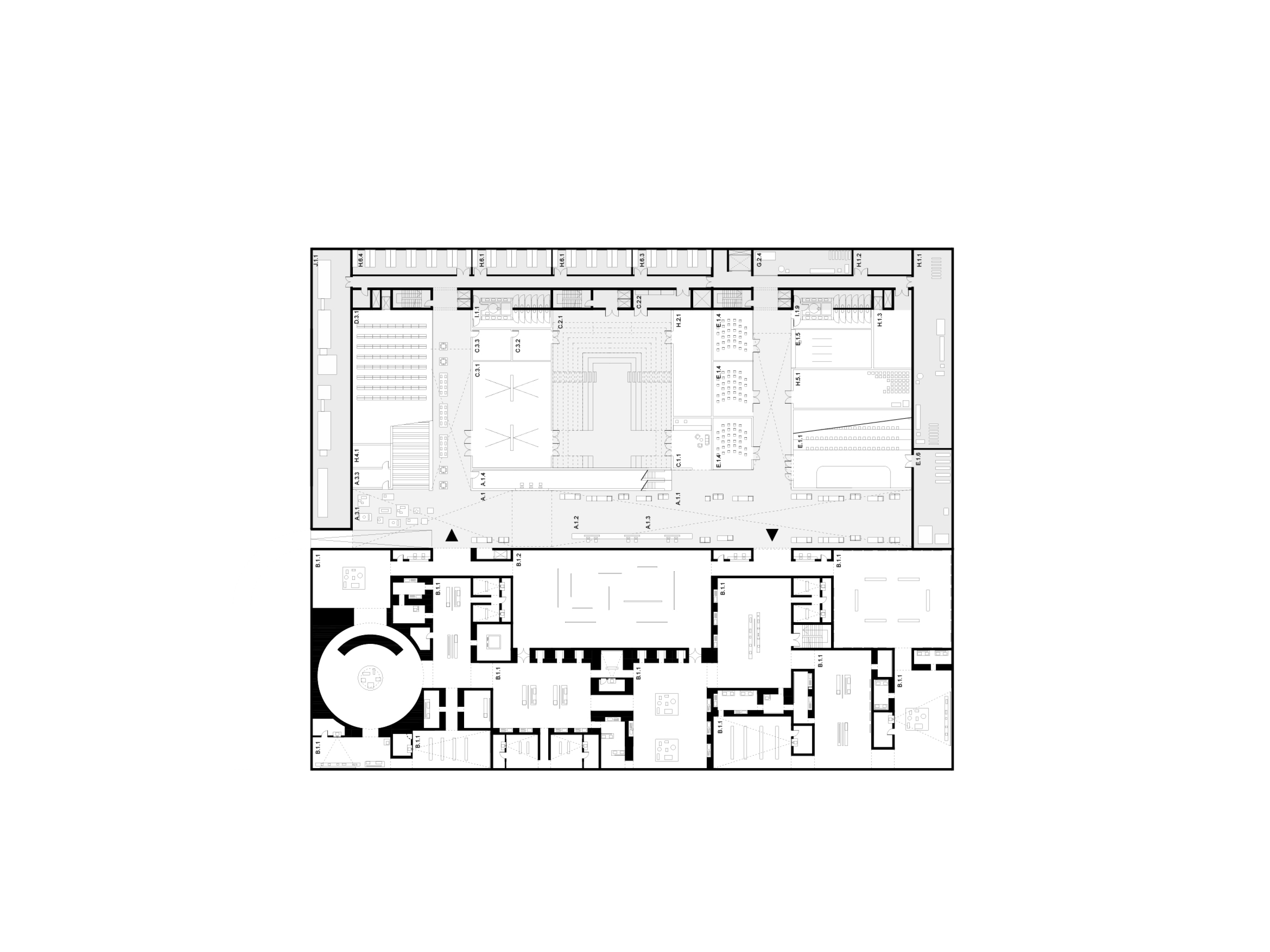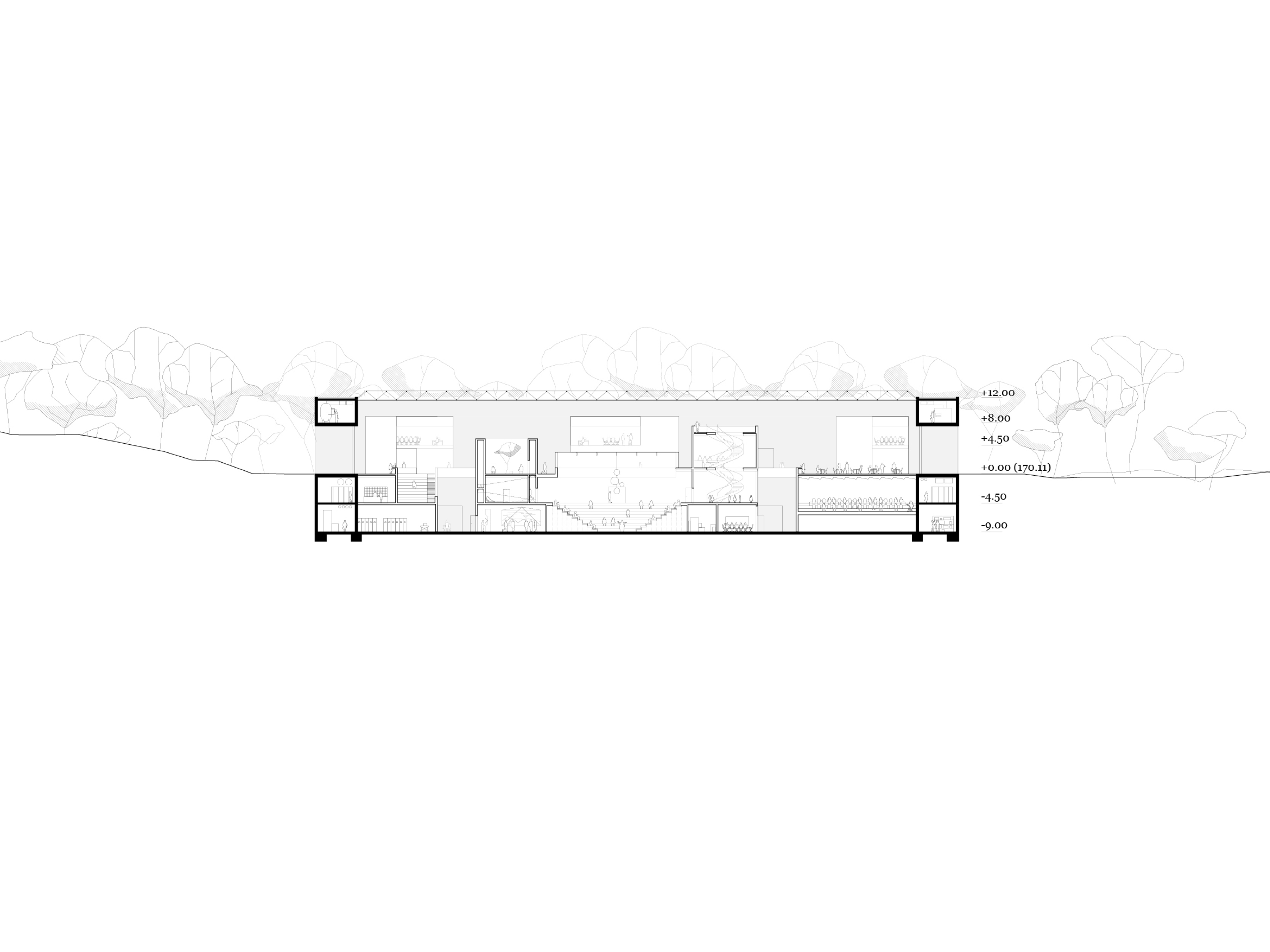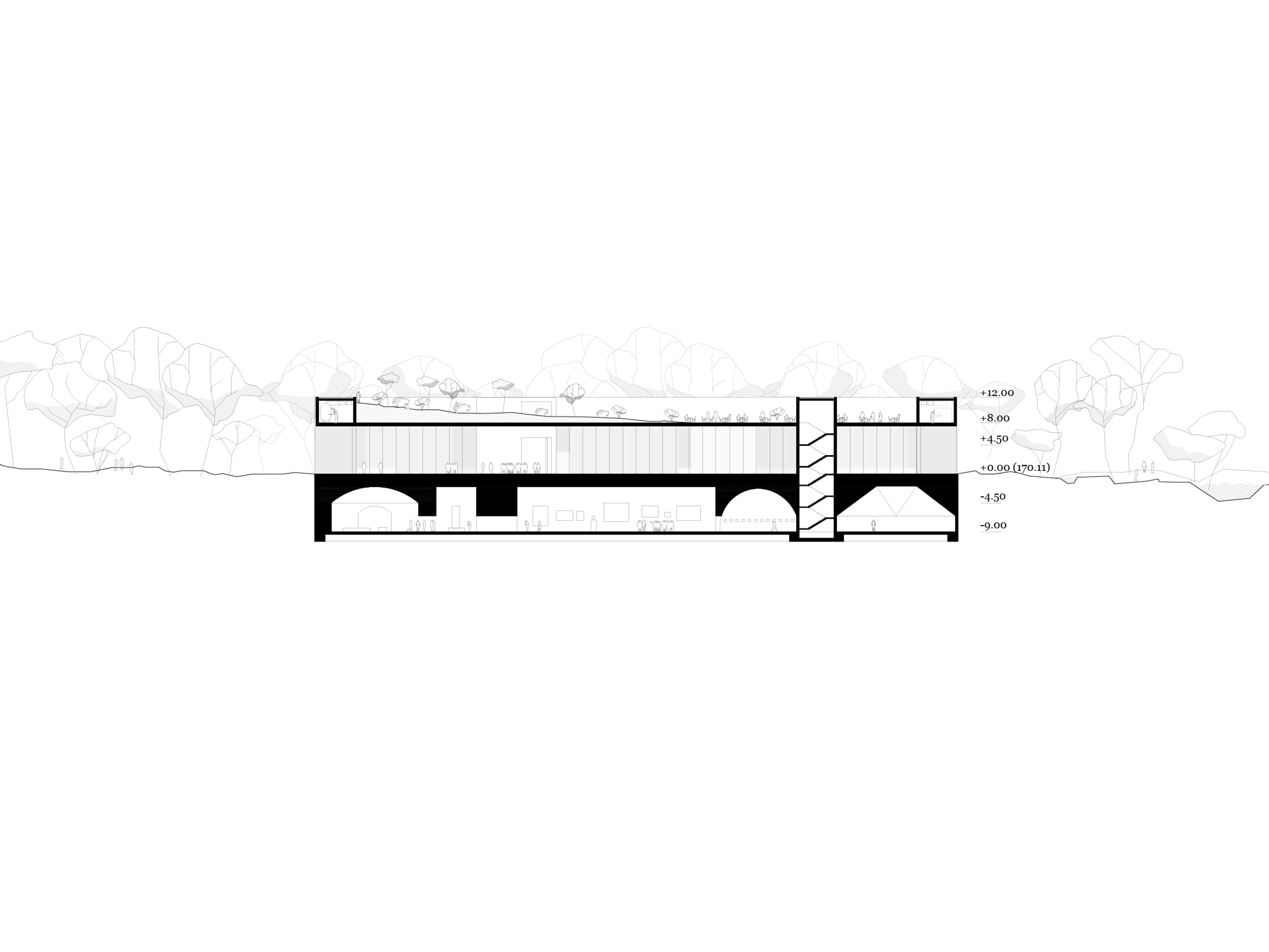 Within the main volume, a sloping landscape of light houses spaces for the production of knowledge. The foyer, placed in the ravine, connects all the functions of the Memorial Centre and creates an active place of encounters, connecting the past and future of the site. It is flanked by exhibition spaces dedicated to the past, and research and learning spaces focused on the future and designed for unearthing, collecting, and sharing new knowledge in the hopes of preserving peace.