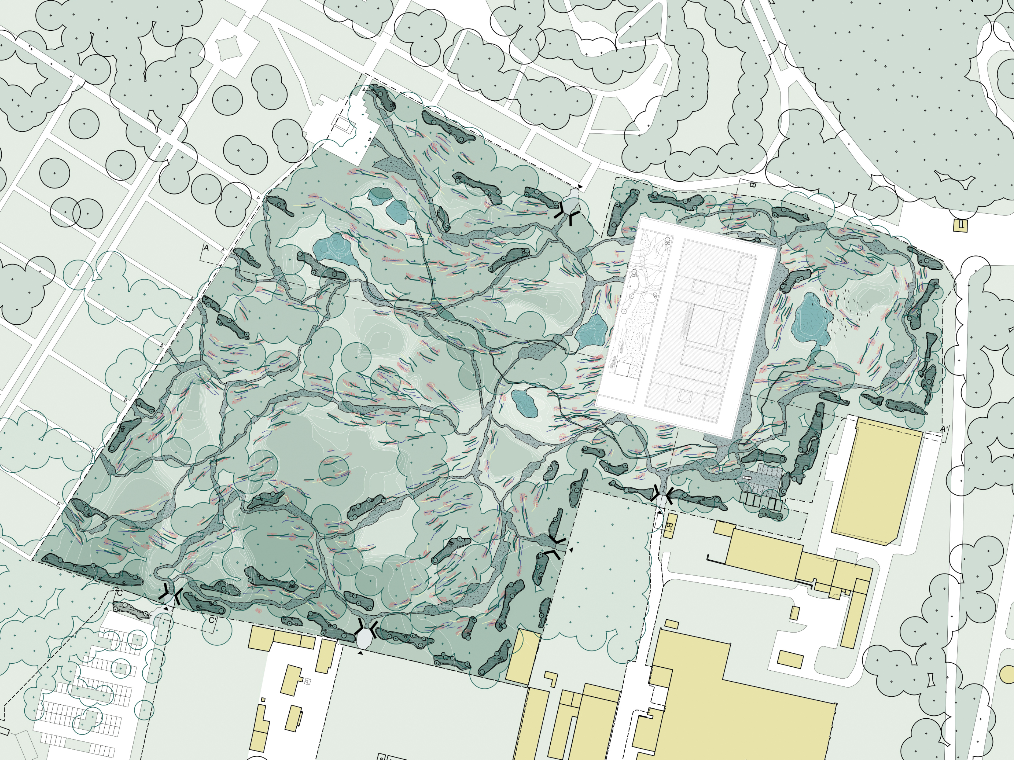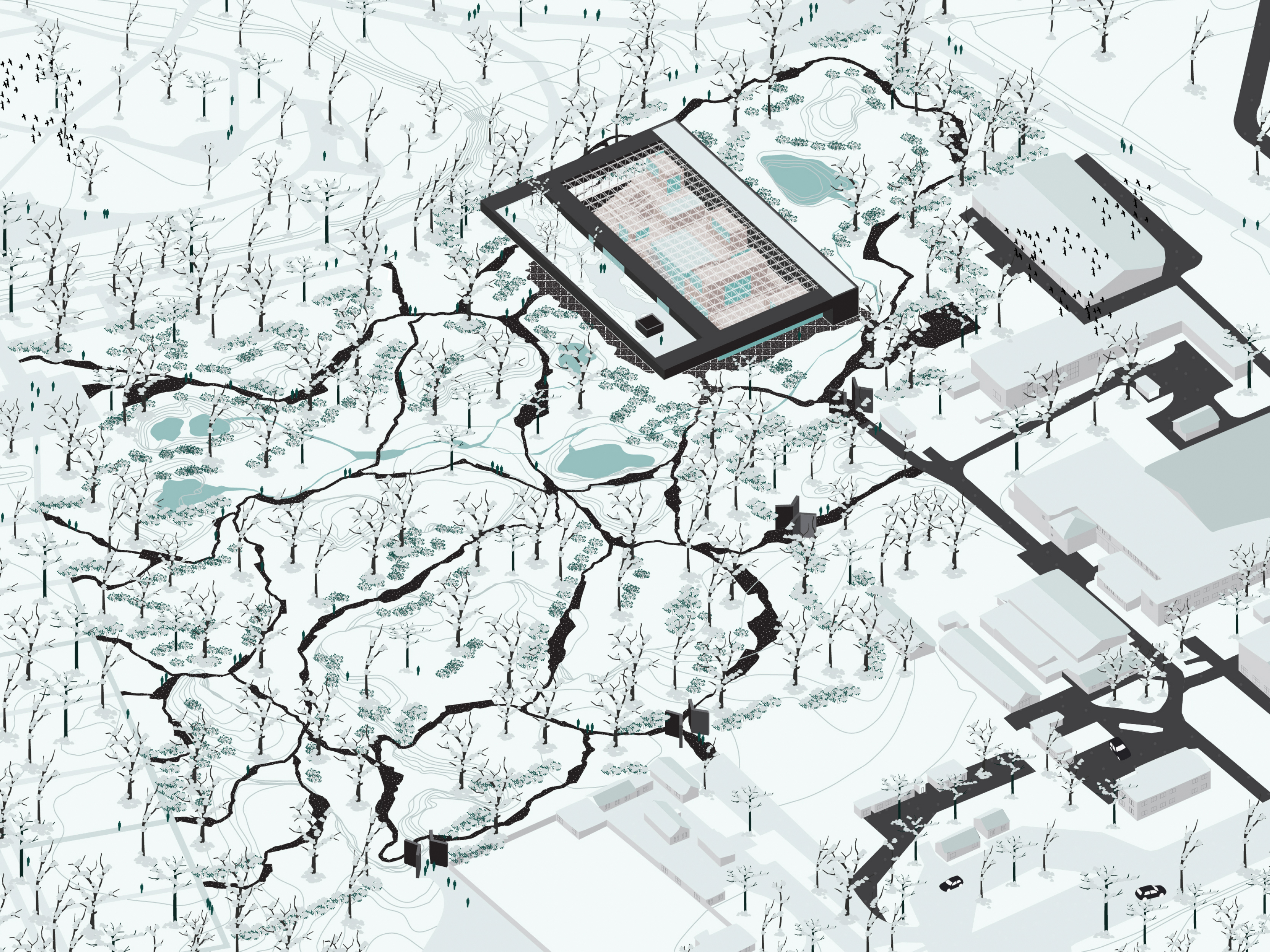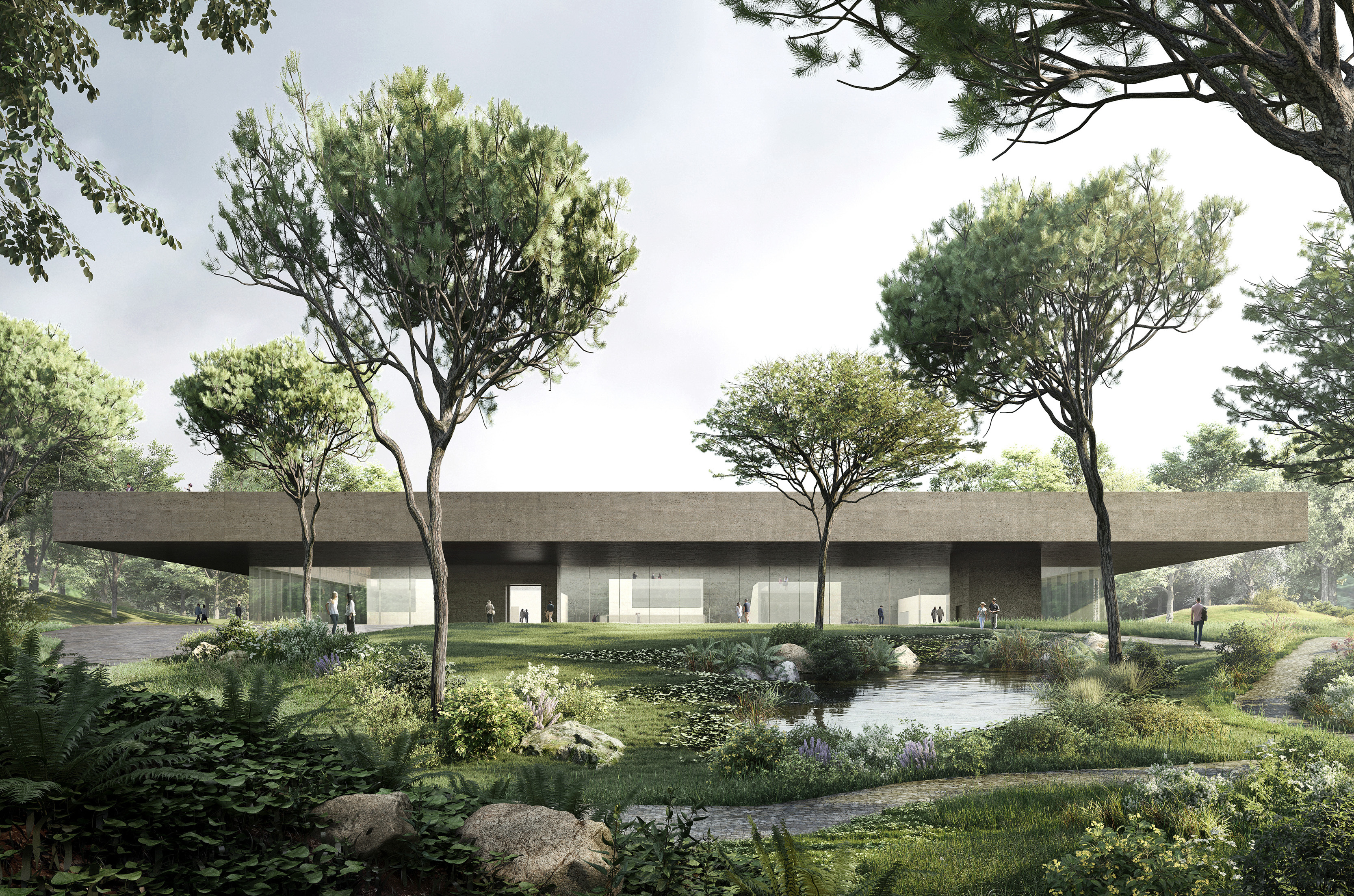 The Babyn Yar Holocaust Memorial Centre is located in Kyiv, near the ravine where the mass shootings occurred in 1941. The layers of history were covered by layers of earth, and the ravine is now a memorial park. The site immerses the visitor in the natural scenography of the woodland, which offers space for reflection on the past and provides a view into the future through the sunlight penetrating the forest. The mass of the building is formed out of a large, solid, and dark volume which sinks into the layers of the historical landscape.