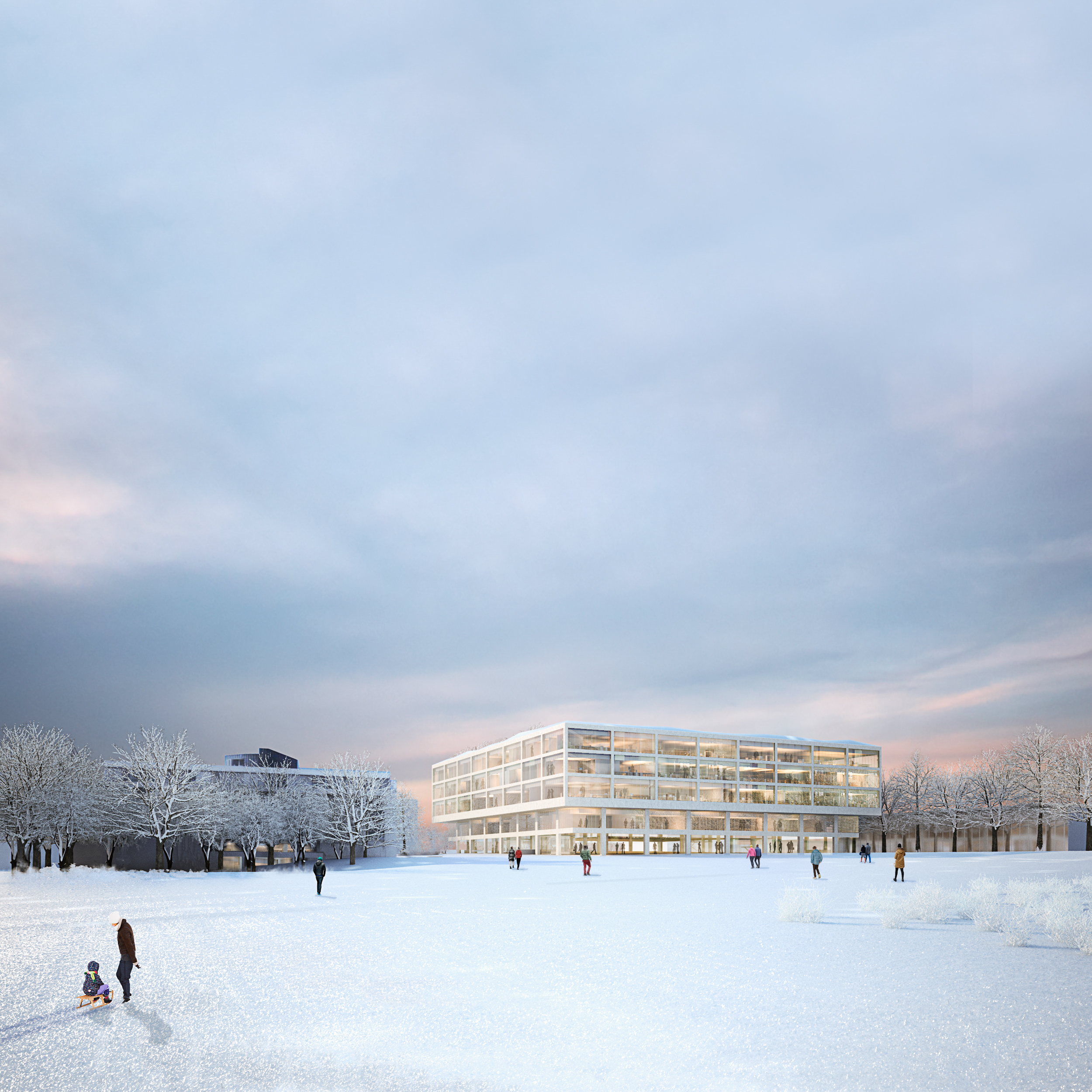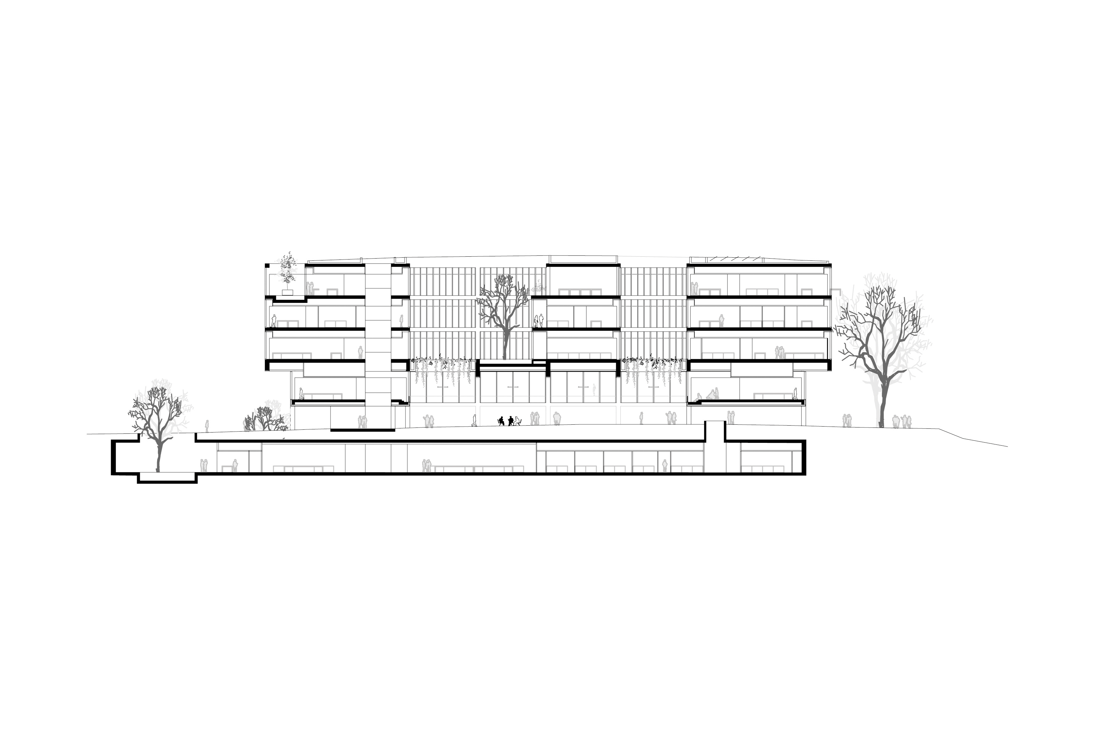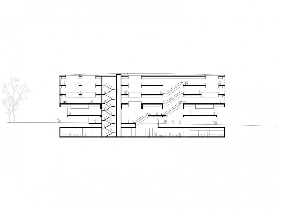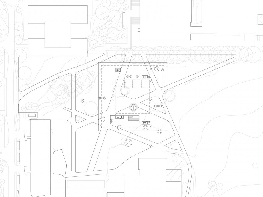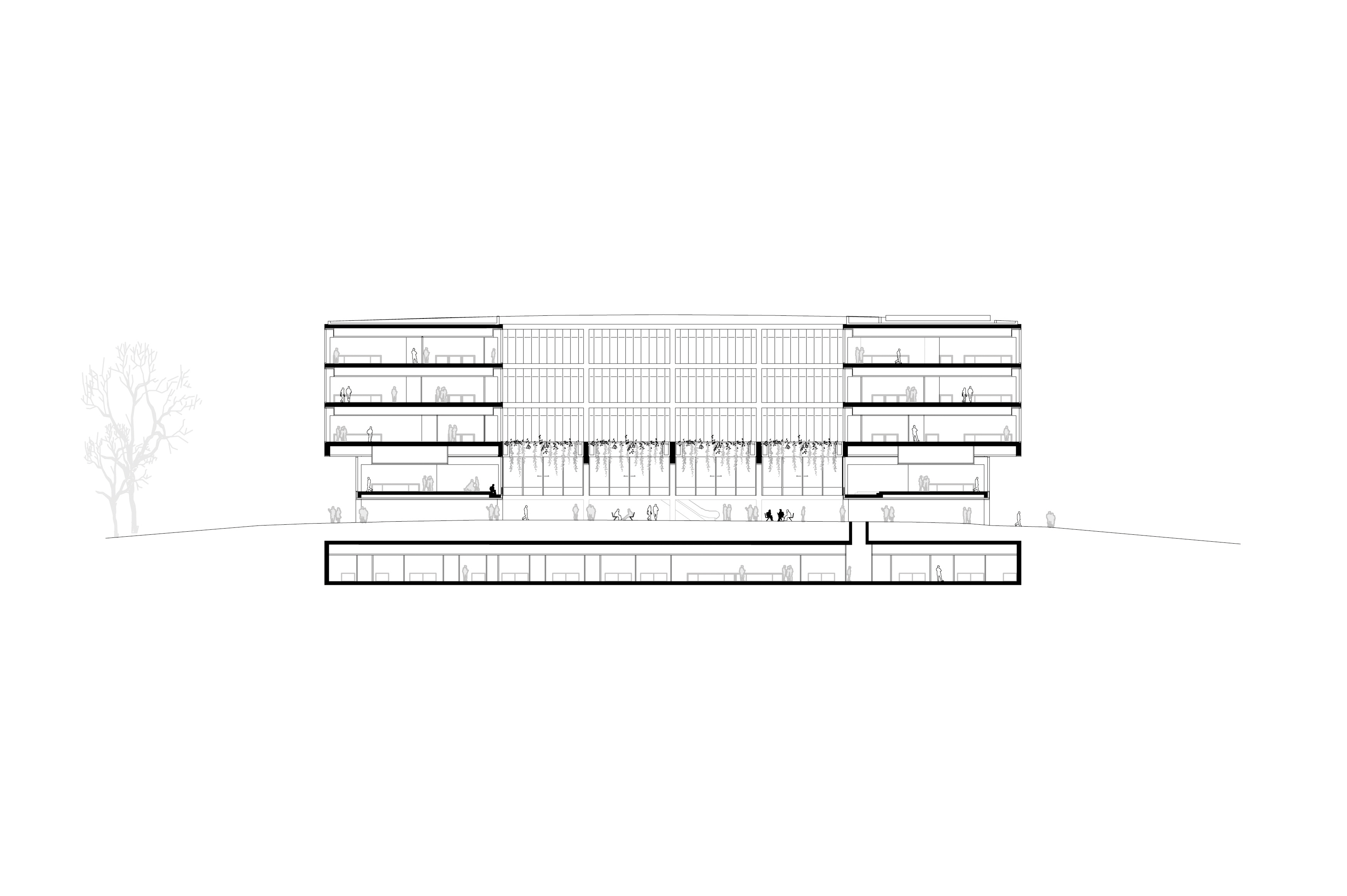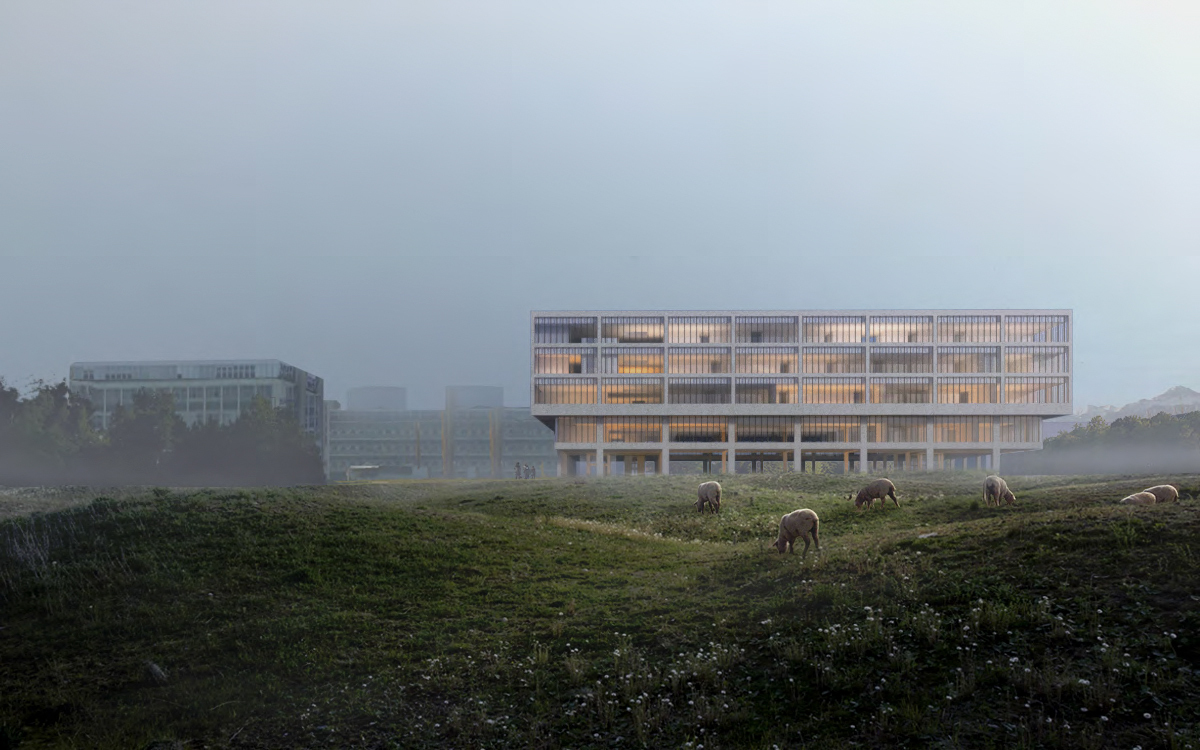 The proposal for the new Life Sciences building for the University of Lausanne situates the building on the highest point of the university campus. The building is elevated and allows for the creation of la Chambre: a new outside ‘room’ for public use with plenty of green coverage at the very heart of the building. La Chambre forms the central meeting space for students, researchers, staff and visitors.