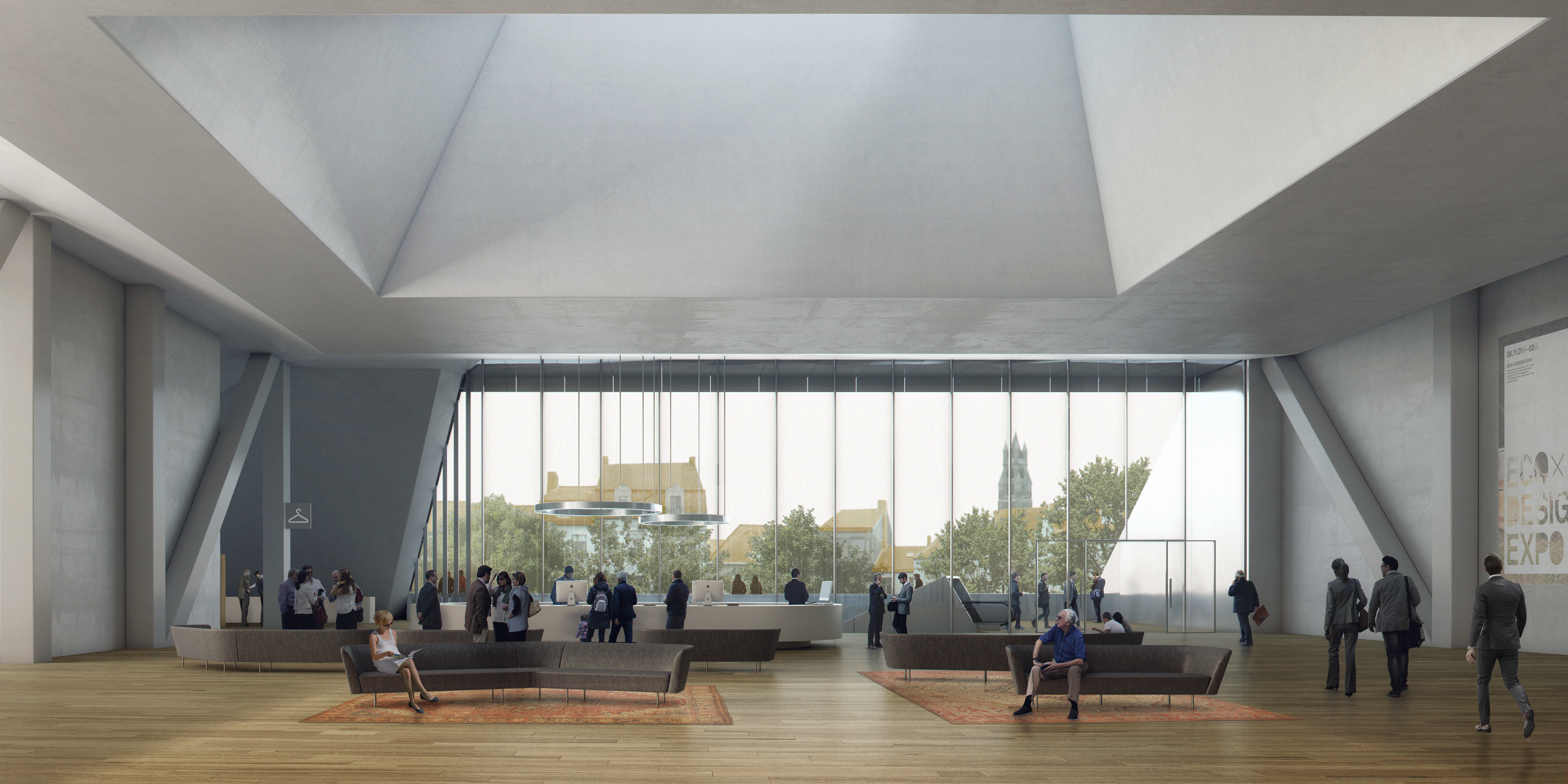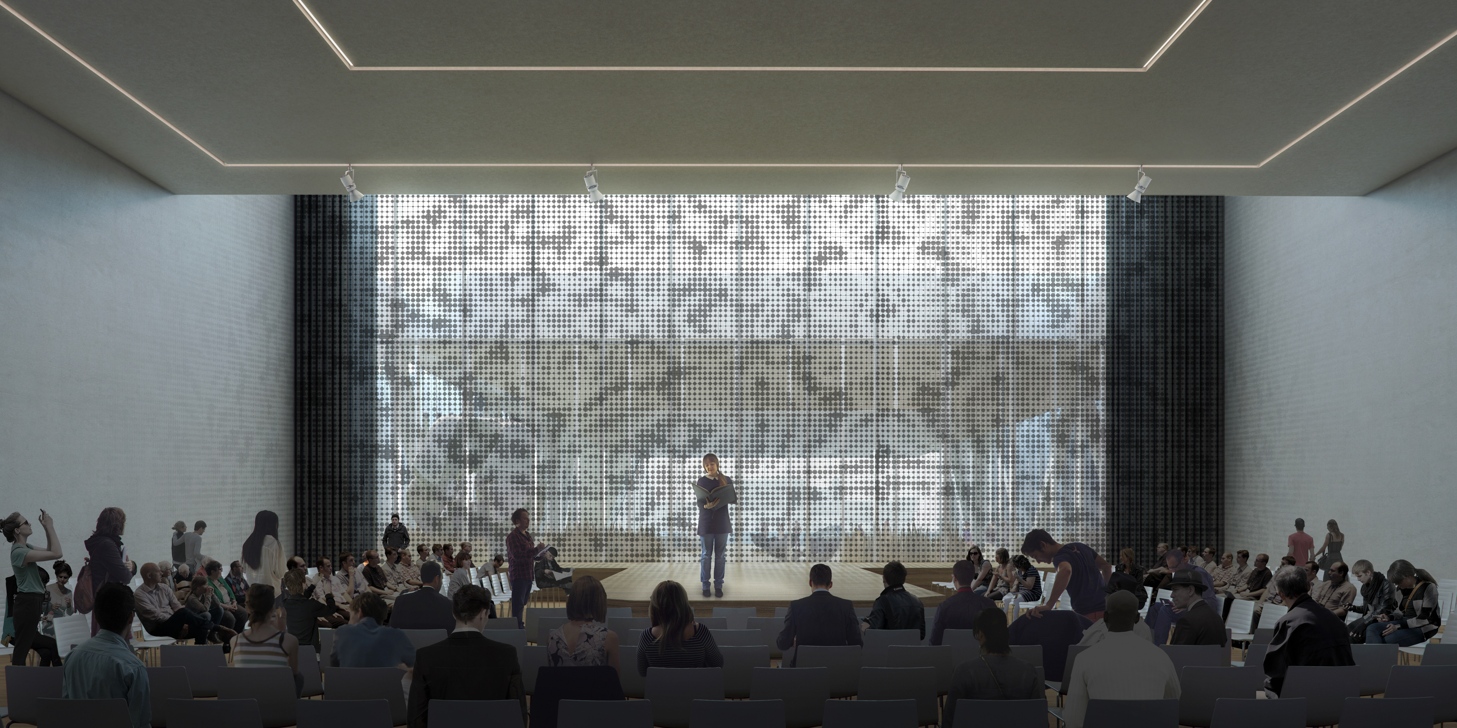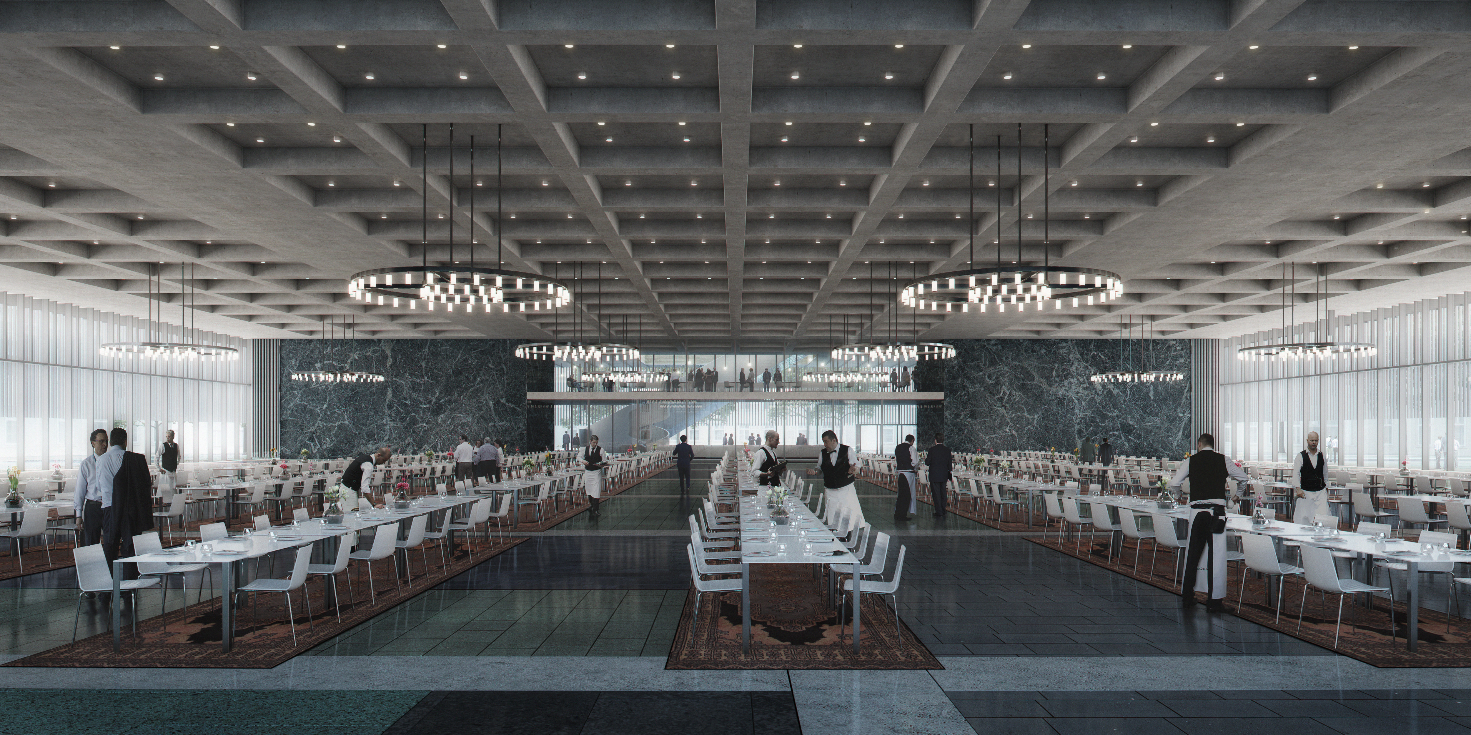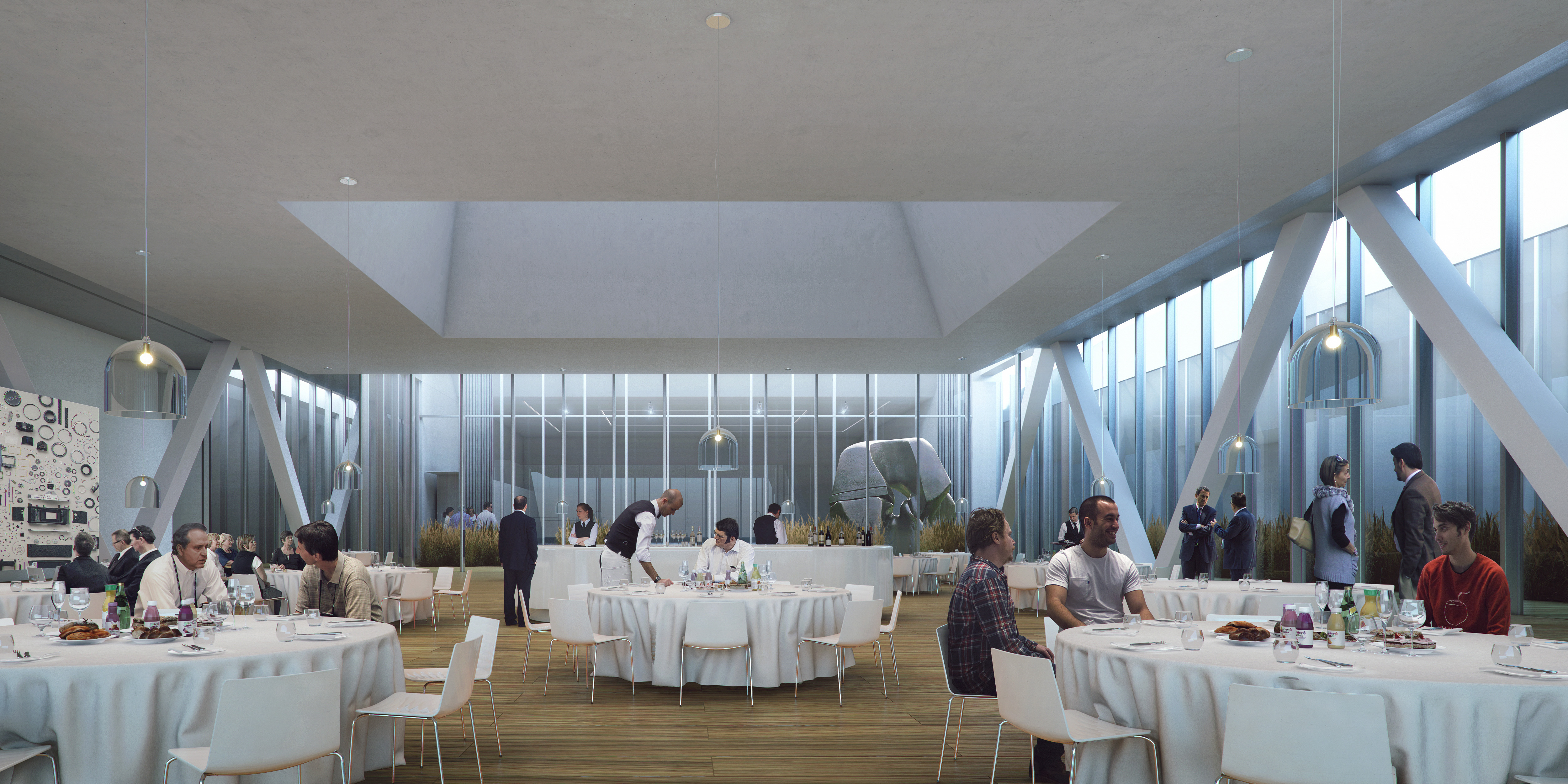 Supported by the legs, the large volume houses a 4000m2 conference centre, sculpted to resemble the scale and shape of the inner city. The building’s presence is further dematerialized through its anodized aluminium cladding. Visitors enter underneath the generous overhang, then move up through the space via an enclosed escalator, arriving on the conference level’s balcony overlooking the city. The sculptural roof creates patios and spatial variety, creating a diverse space with interactive interior and exterior views.
