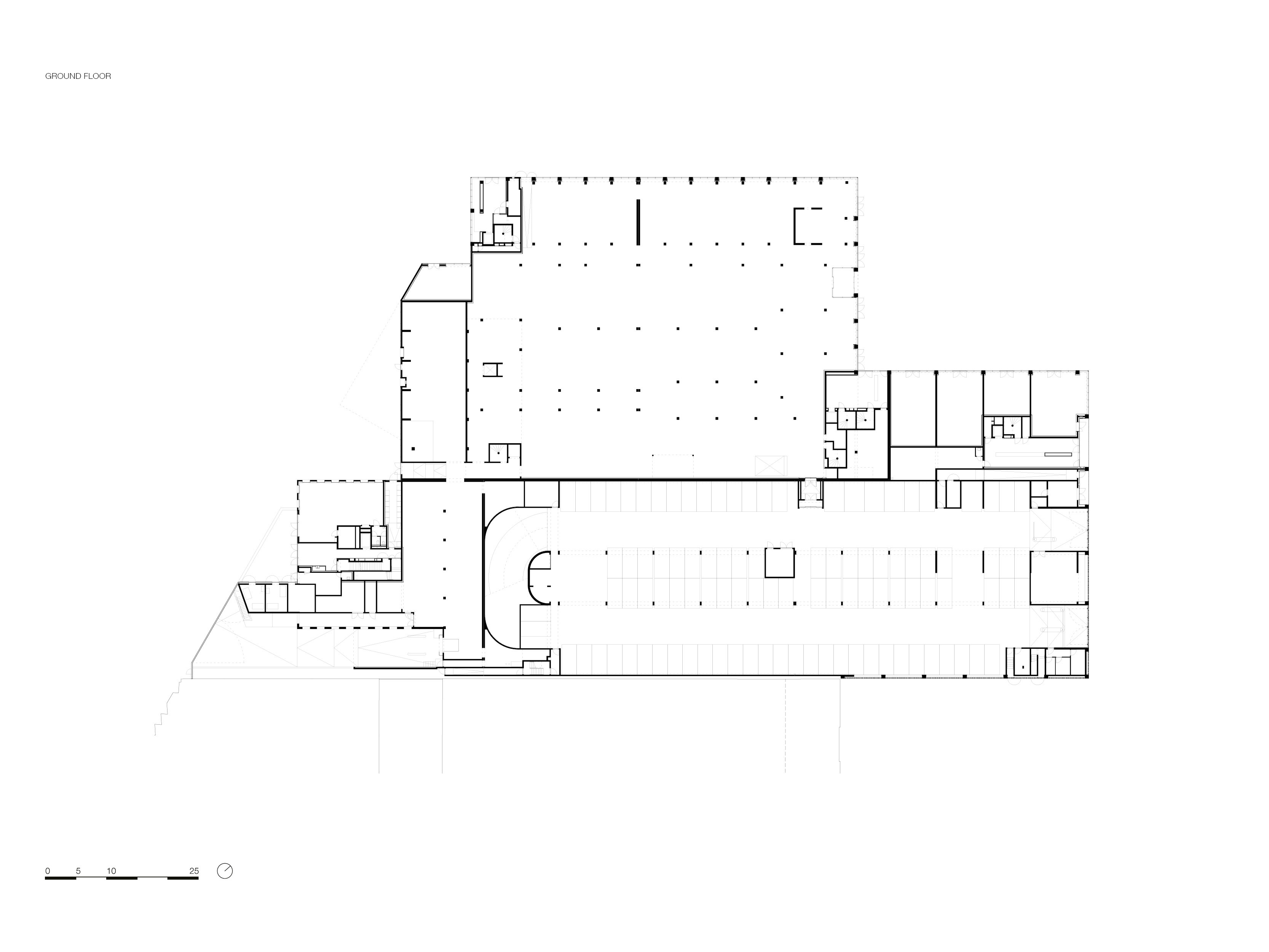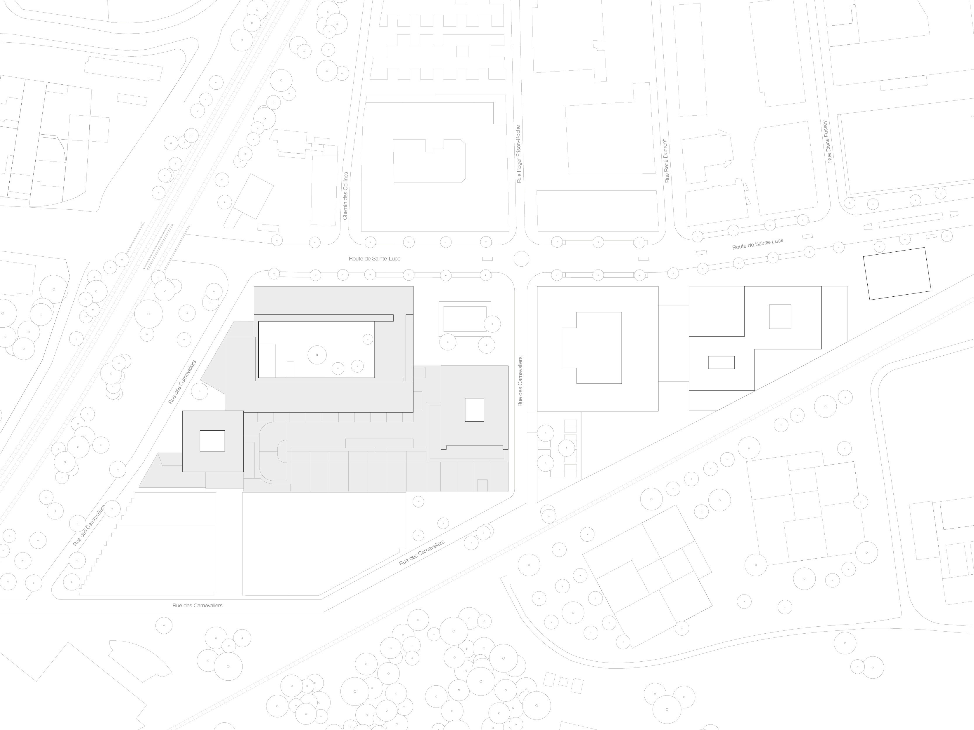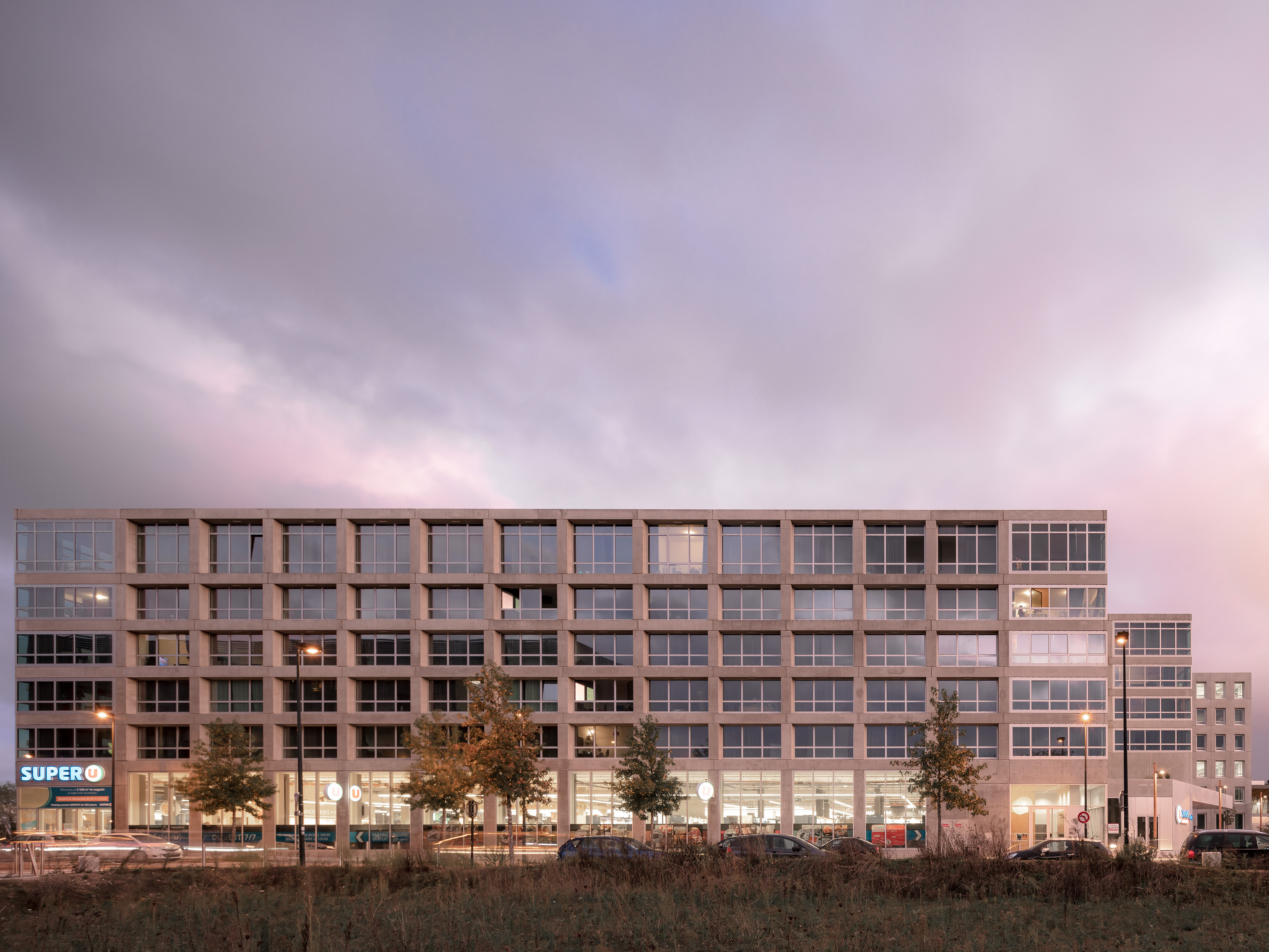 Bottière Chénaie is a compact mixed-use building nestled within the eponymous district in the north-eastern Nantes, encircled by major traffic infrastructures. The project proposes a balanced composition of volumes with simple massing, enriched by concrete post-and-beam facades that generate large openings and fully glazed corners. The building structure features a multifunctional plinth, composed of commercial spaces, a supermarket and a car park. Above this base rise two 5-storey residential blocks containing 172 apartments.
