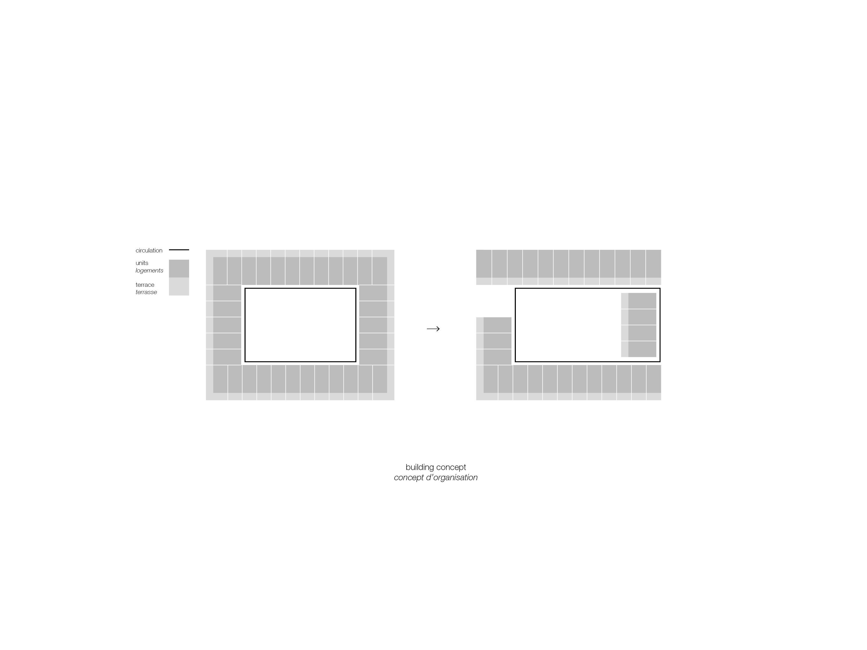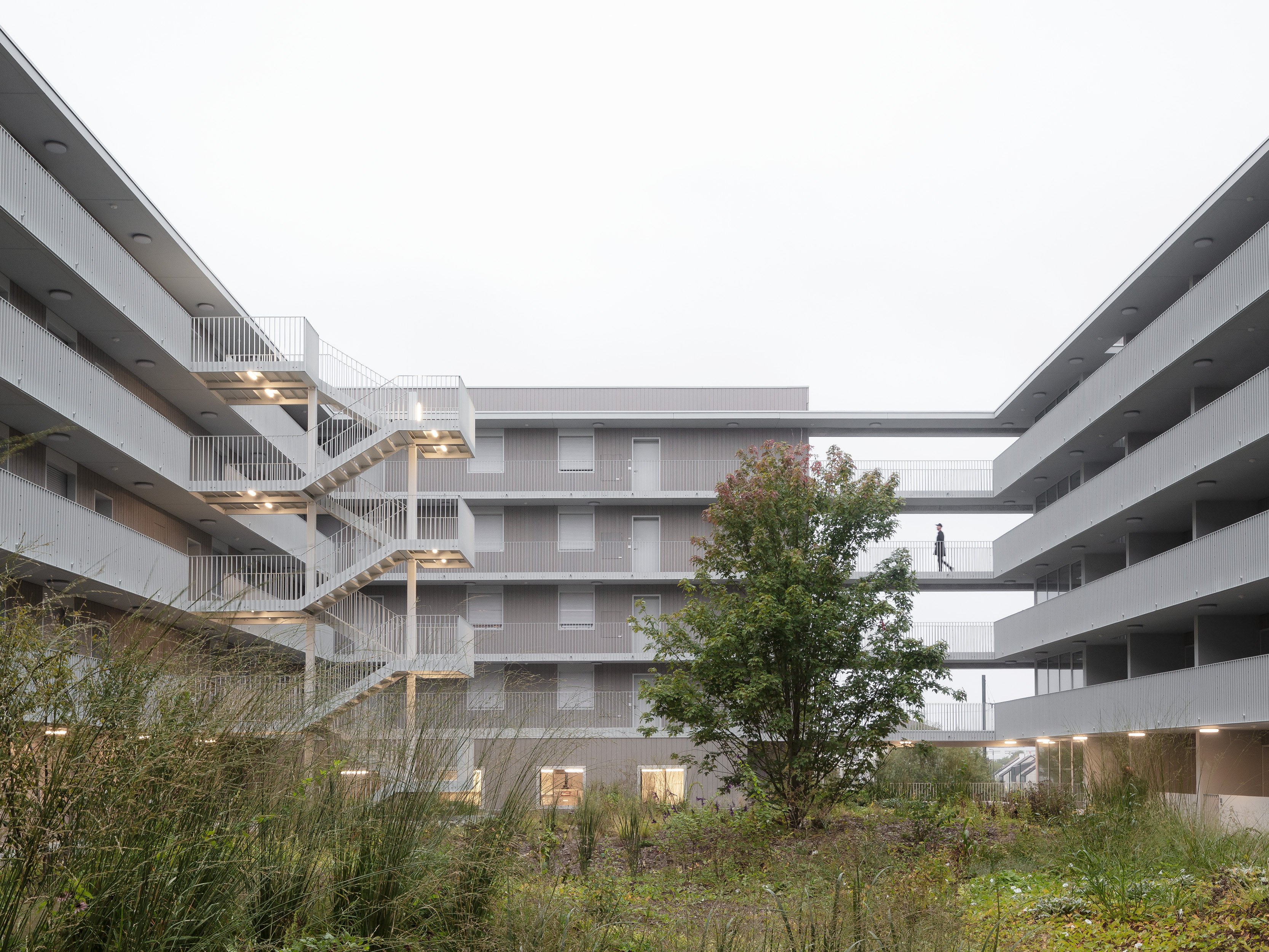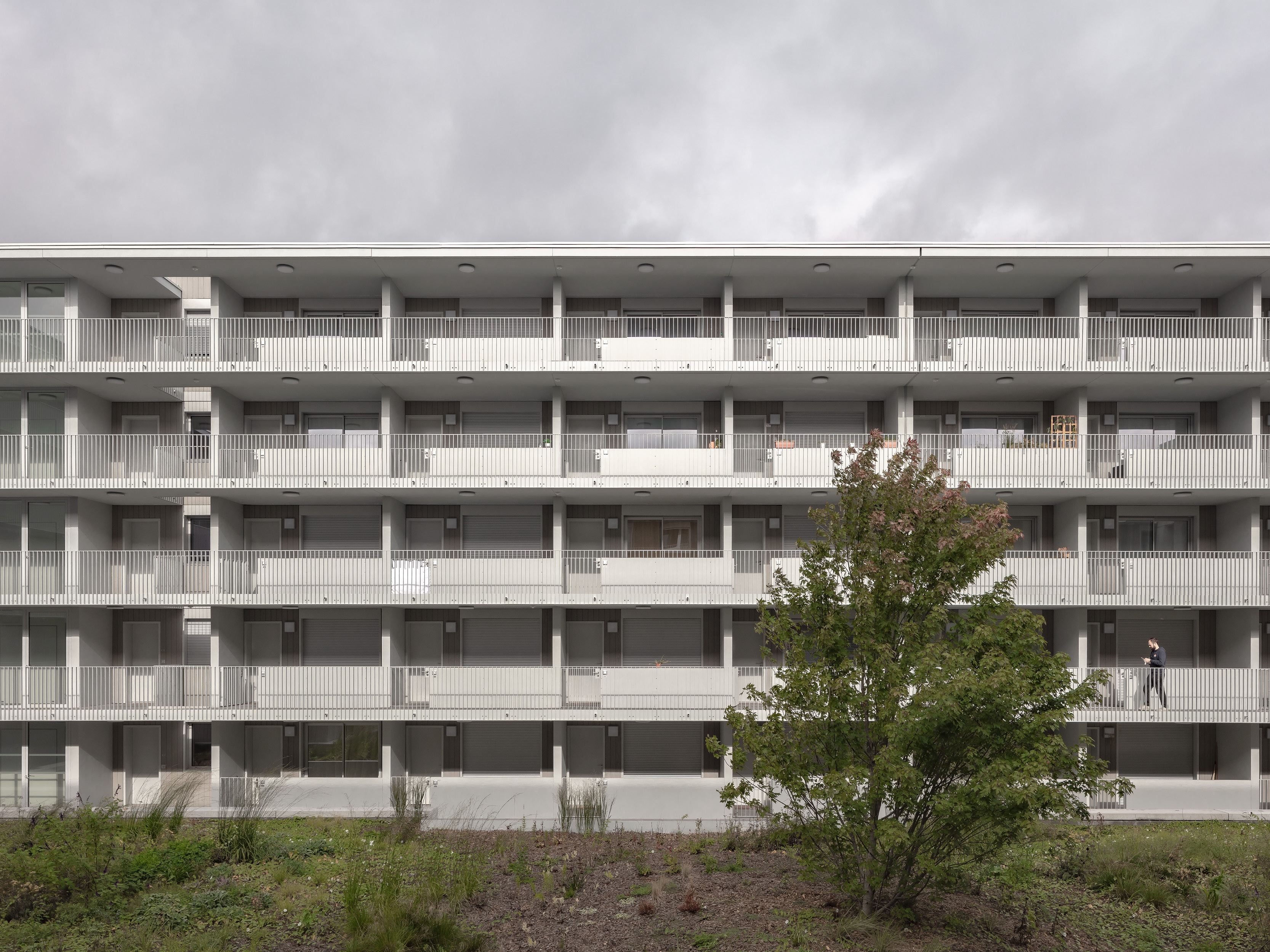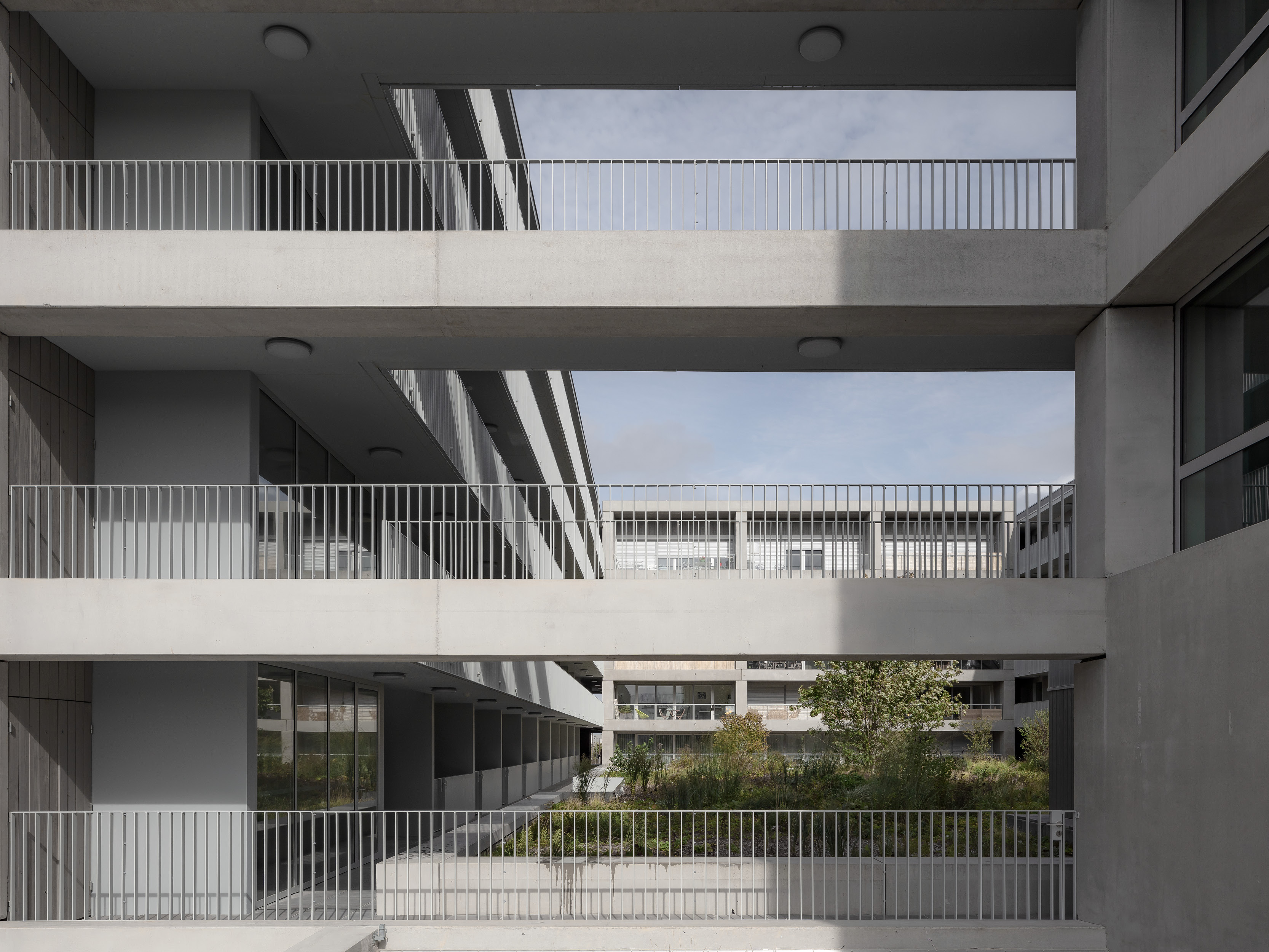 The larger housing volume, dedicated to market-rate housing, unfolds around a spacious courtyard planted with trees, where external walkways overlooking the green surroundings provide access to the dual aspect apartments. The second volume is dedicated to social housing apartments, positioned to benefit from a double orientation: a different typology of loggias and look outs towards the city. Lastly, to the south-west, the office block, organized around a central core, reinforces the volume juxtaposition and completes the new urban landscape.
