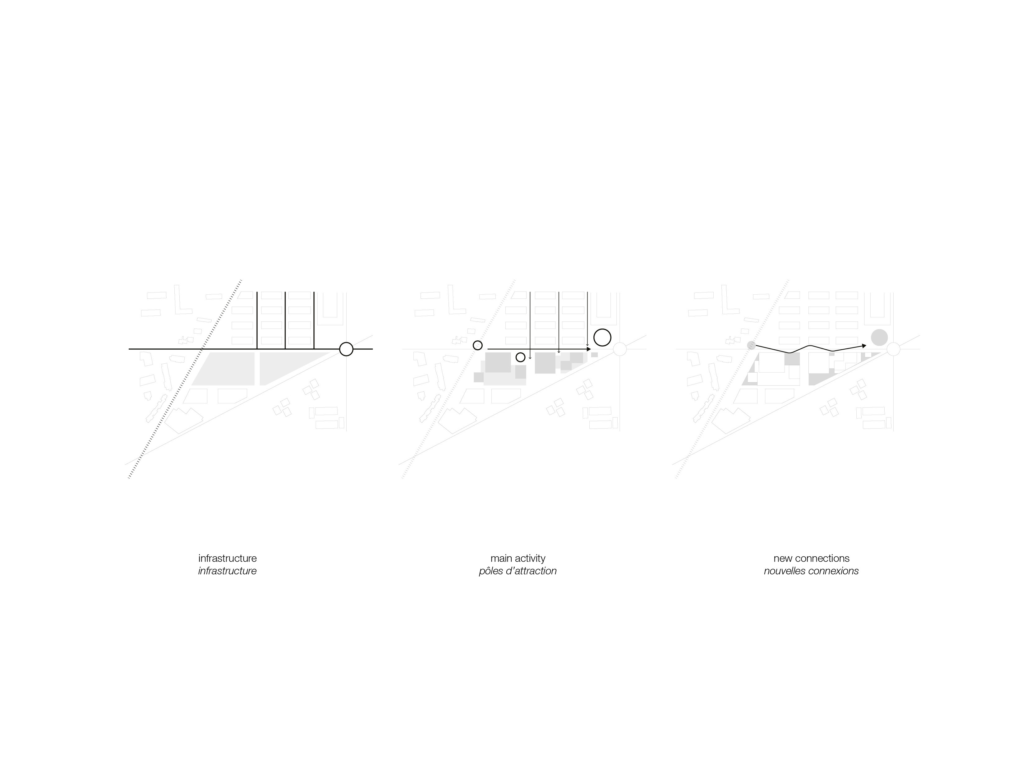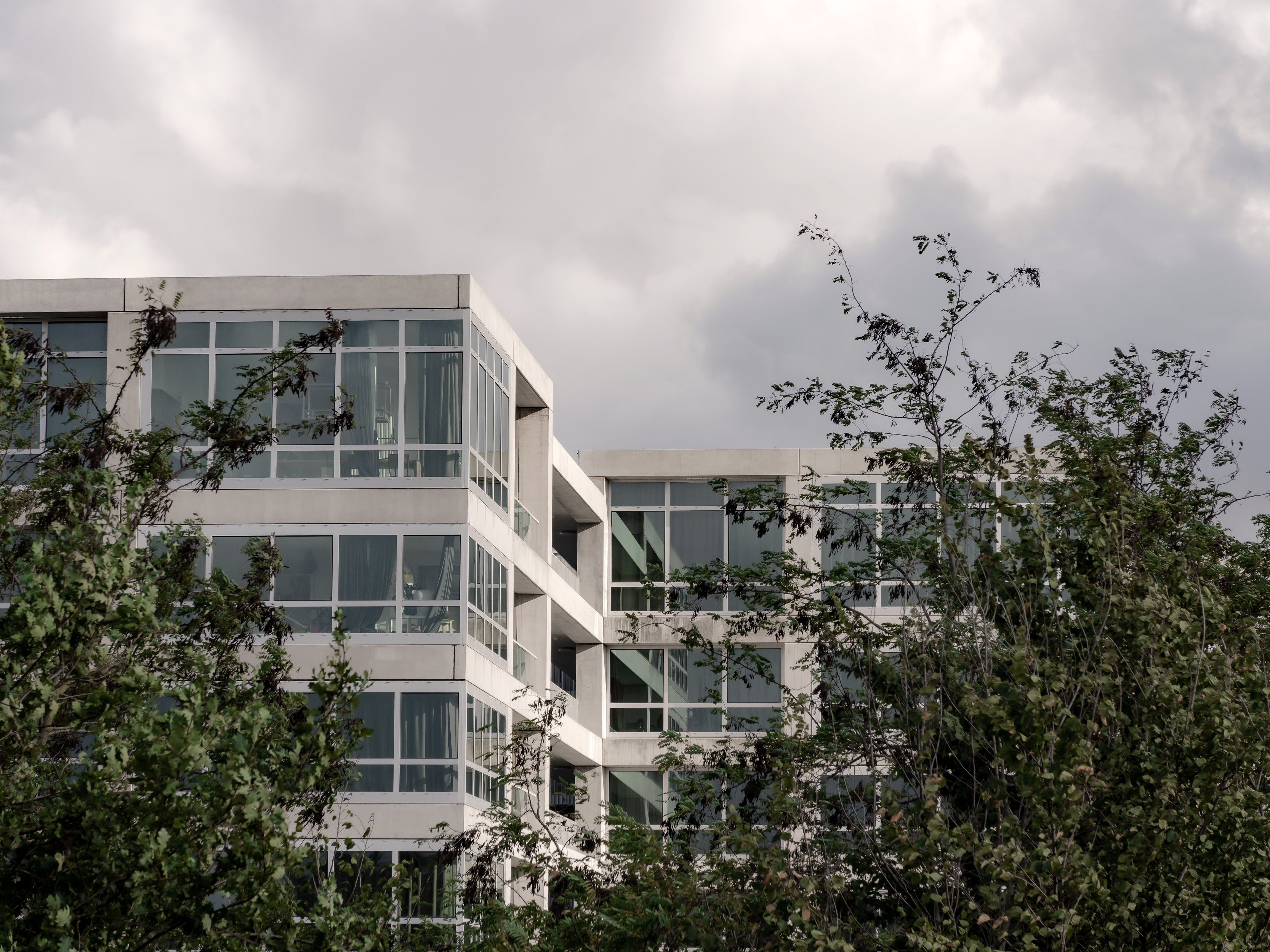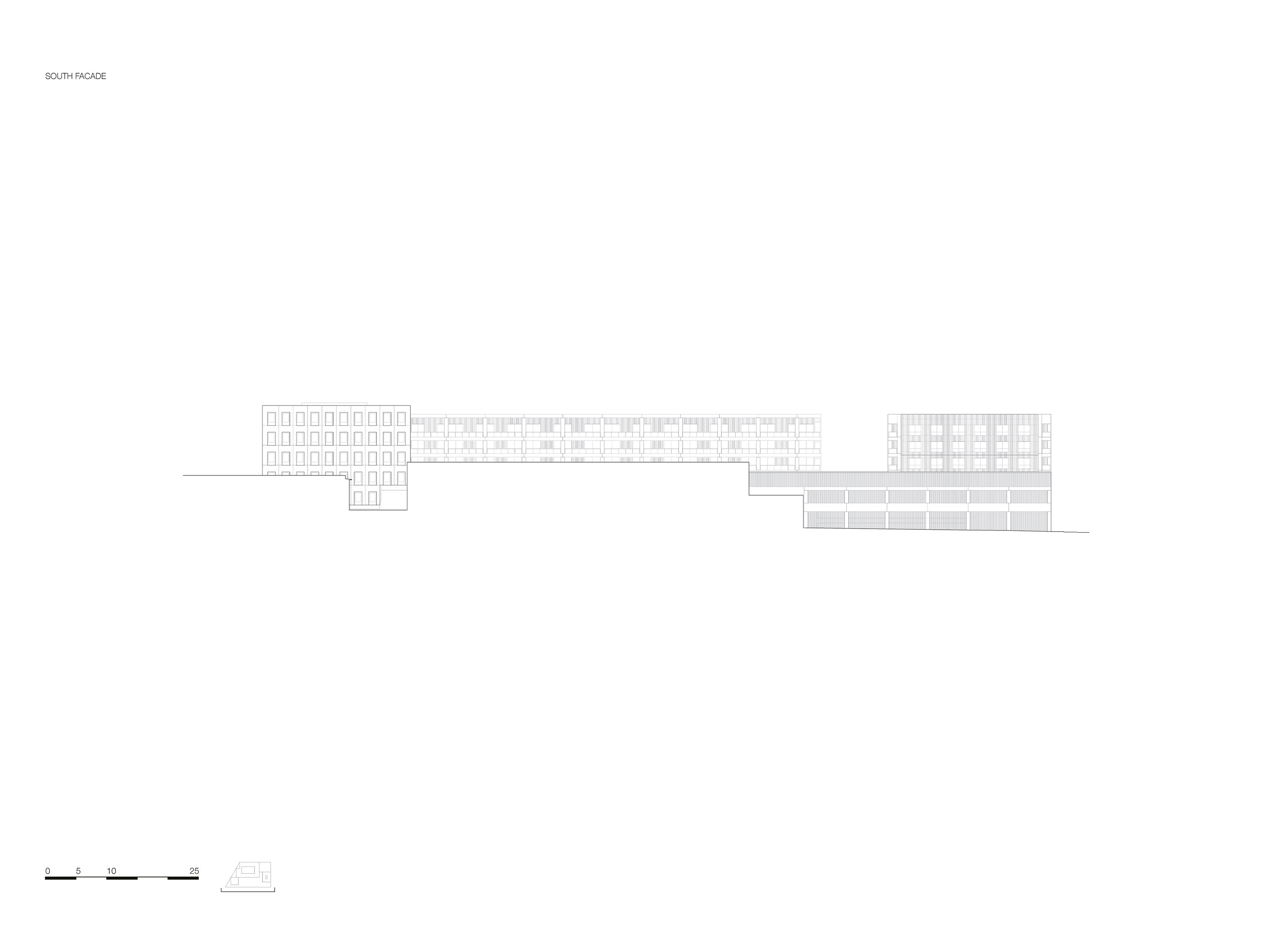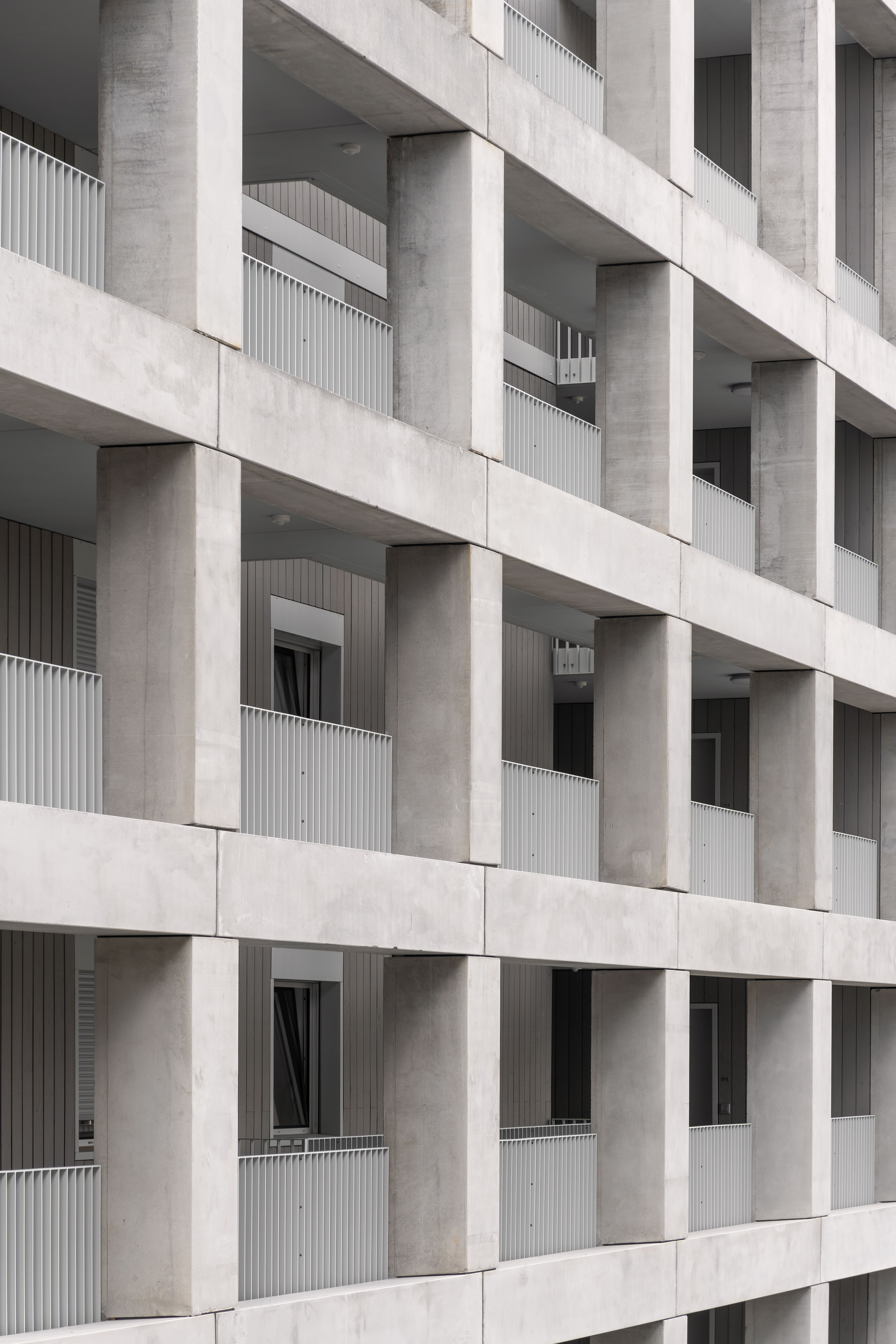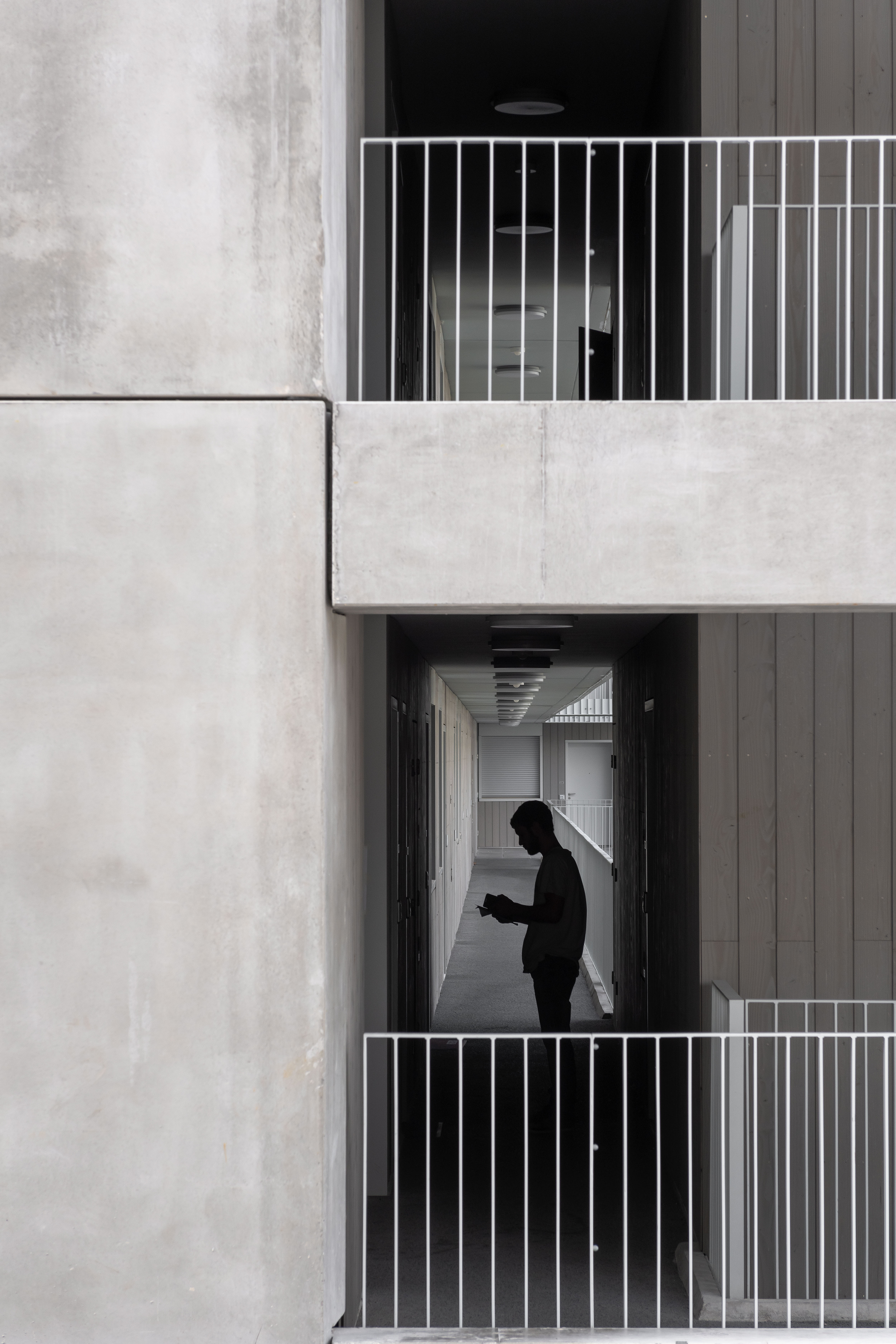 The larger housing volume, dedicated to market-rate housing, unfolds around a spacious courtyard planted with trees, where external walkways overlooking the green surroundings provide access to the dual aspect apartments. The second volume is dedicated to social housing apartments, positioned to benefit from a double orientation: a different typology of loggias and look outs towards the city. Lastly, to the south-west, the office block, organized around a central core, reinforces the volume juxtaposition and completes the new urban landscape.