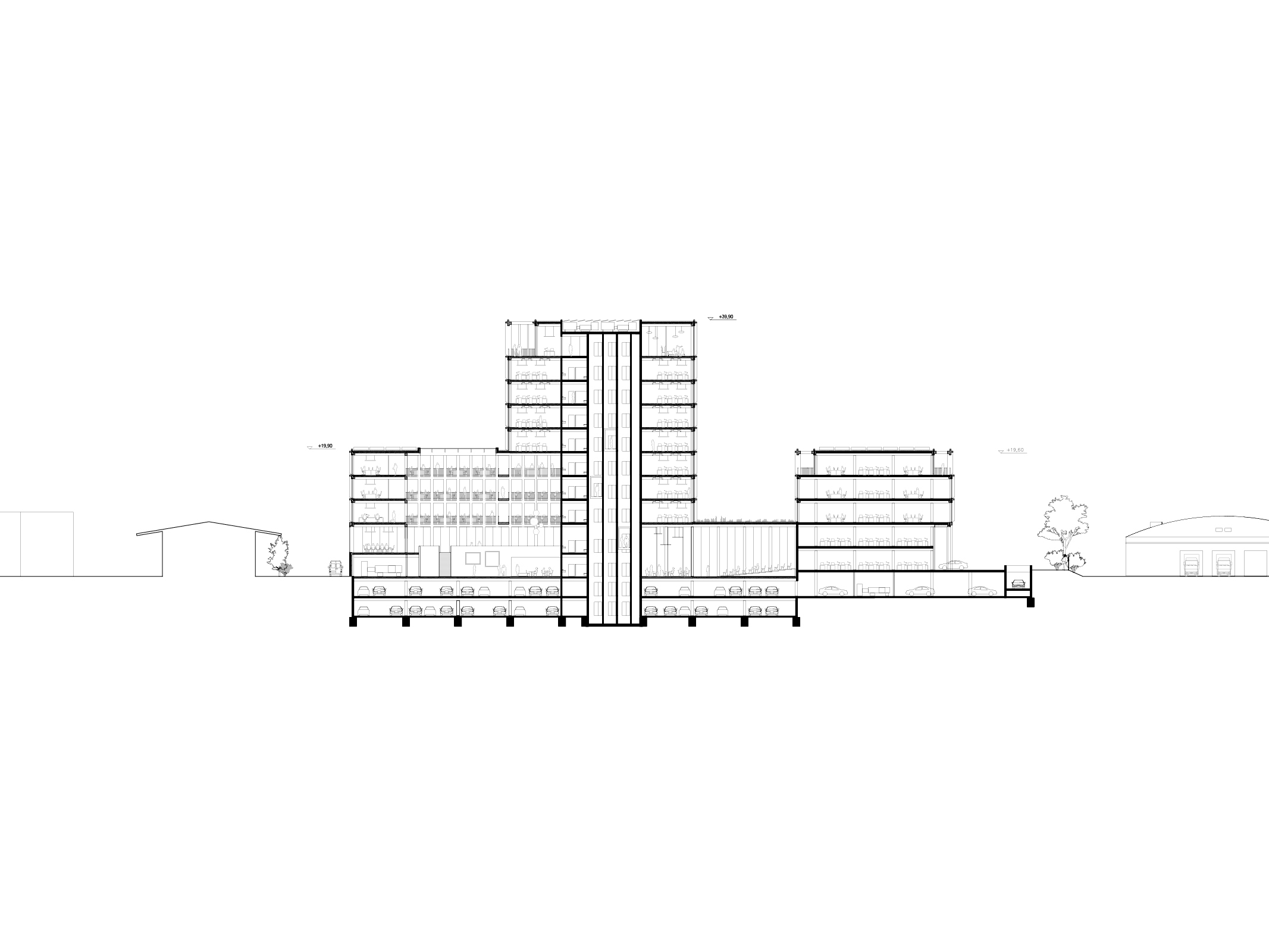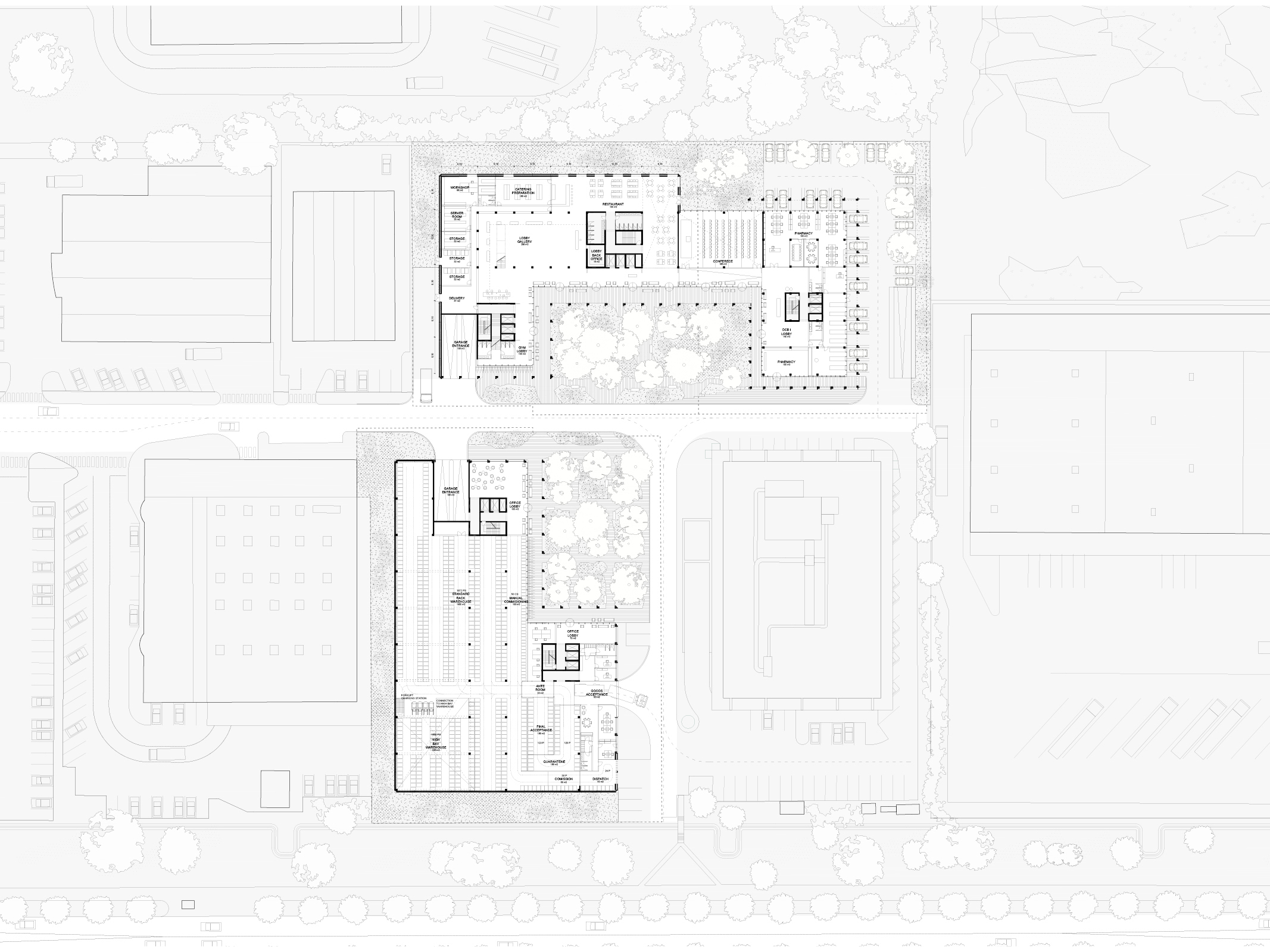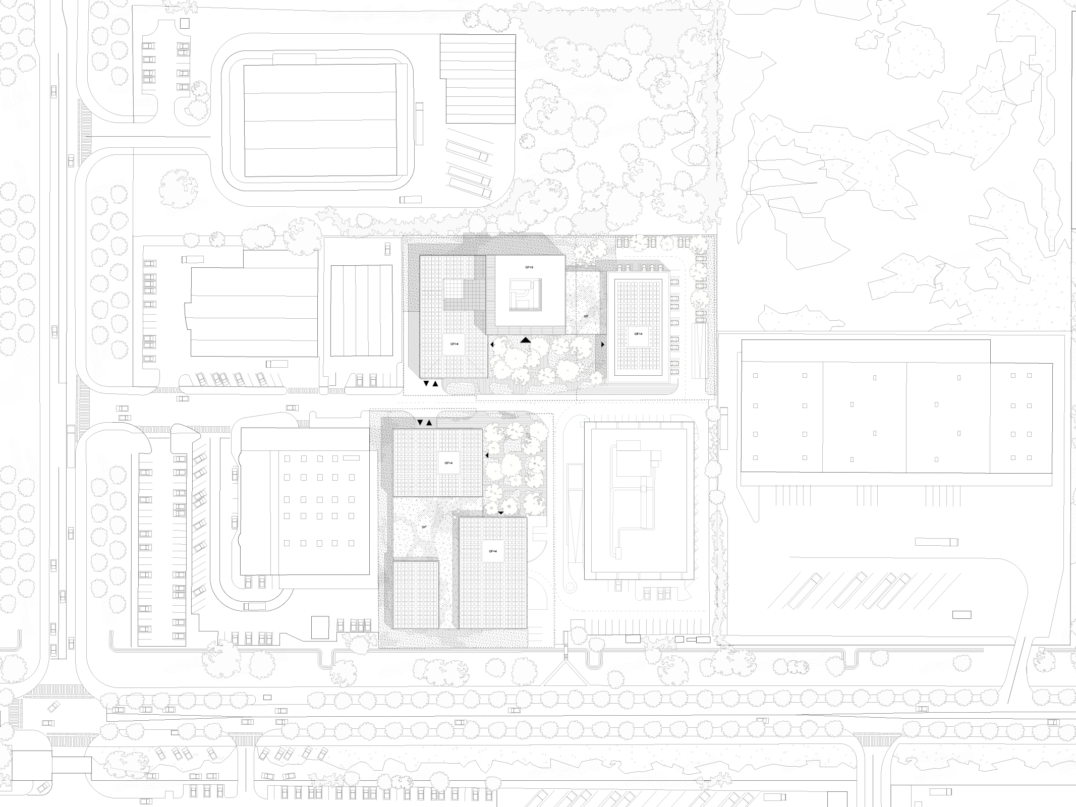 The functions of the public levels are oriented towards the central plaza, which enables shared functions and activities between the buildings. Essentially, the entire plaza acts as a spacious and sunny lobby for the cluster. While the centrally oriented typology is primarily a way to deal with the underdeveloped urban character of the area, it simultaneously forms a fundamentally urban ensemble: a semi-permeable city block with a central plaza. It anticipates the future potential of the area and, due to its fragmented composition, remains flexible for future connections to its surroundings.