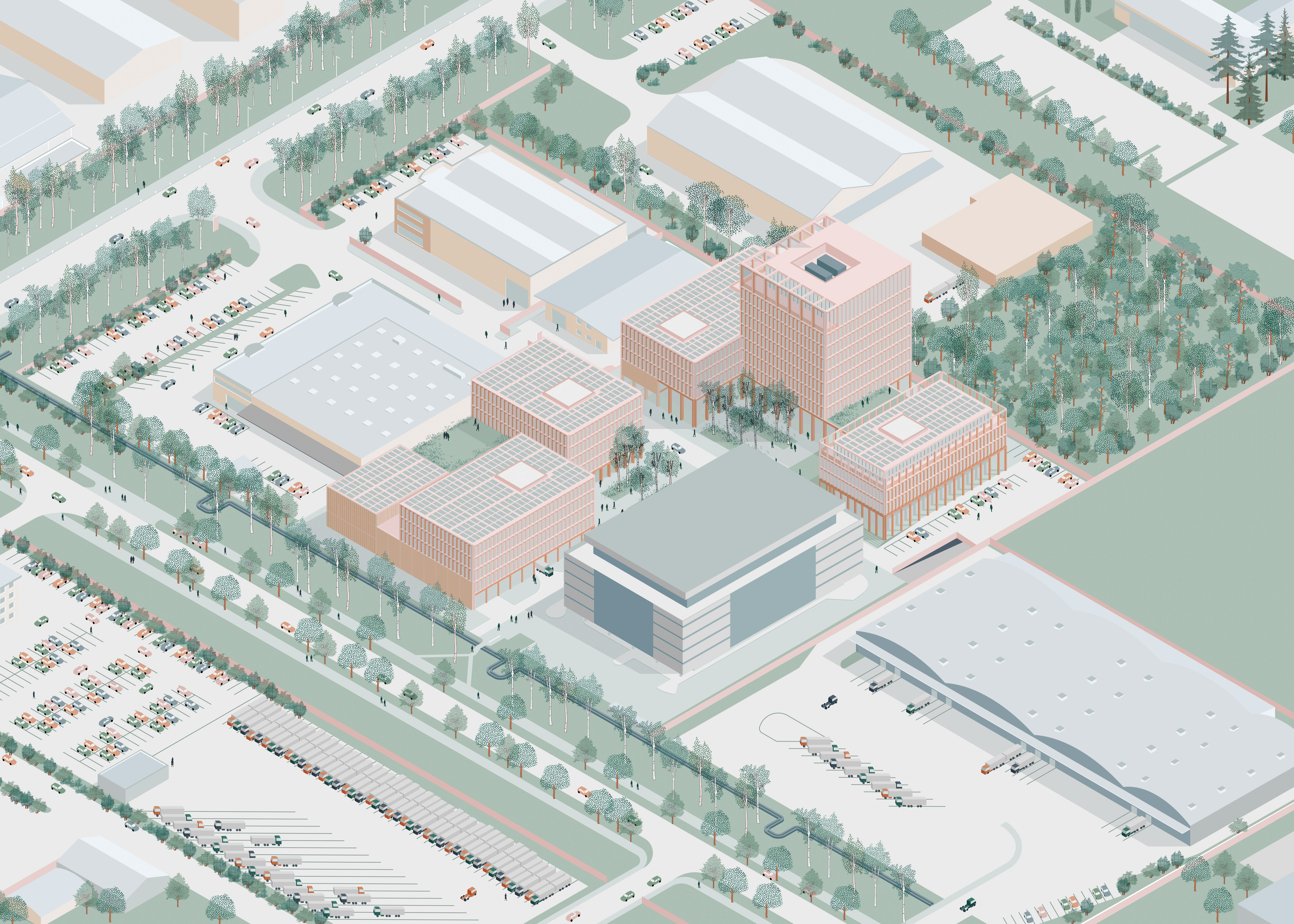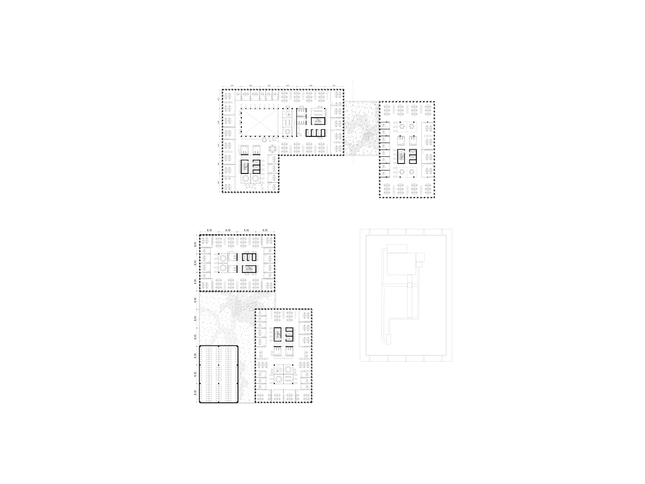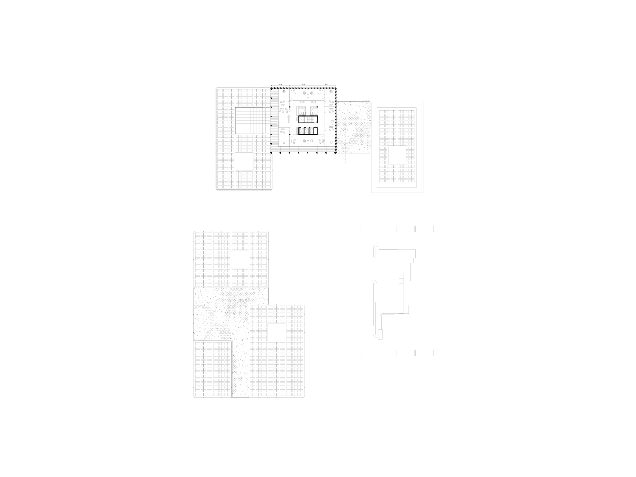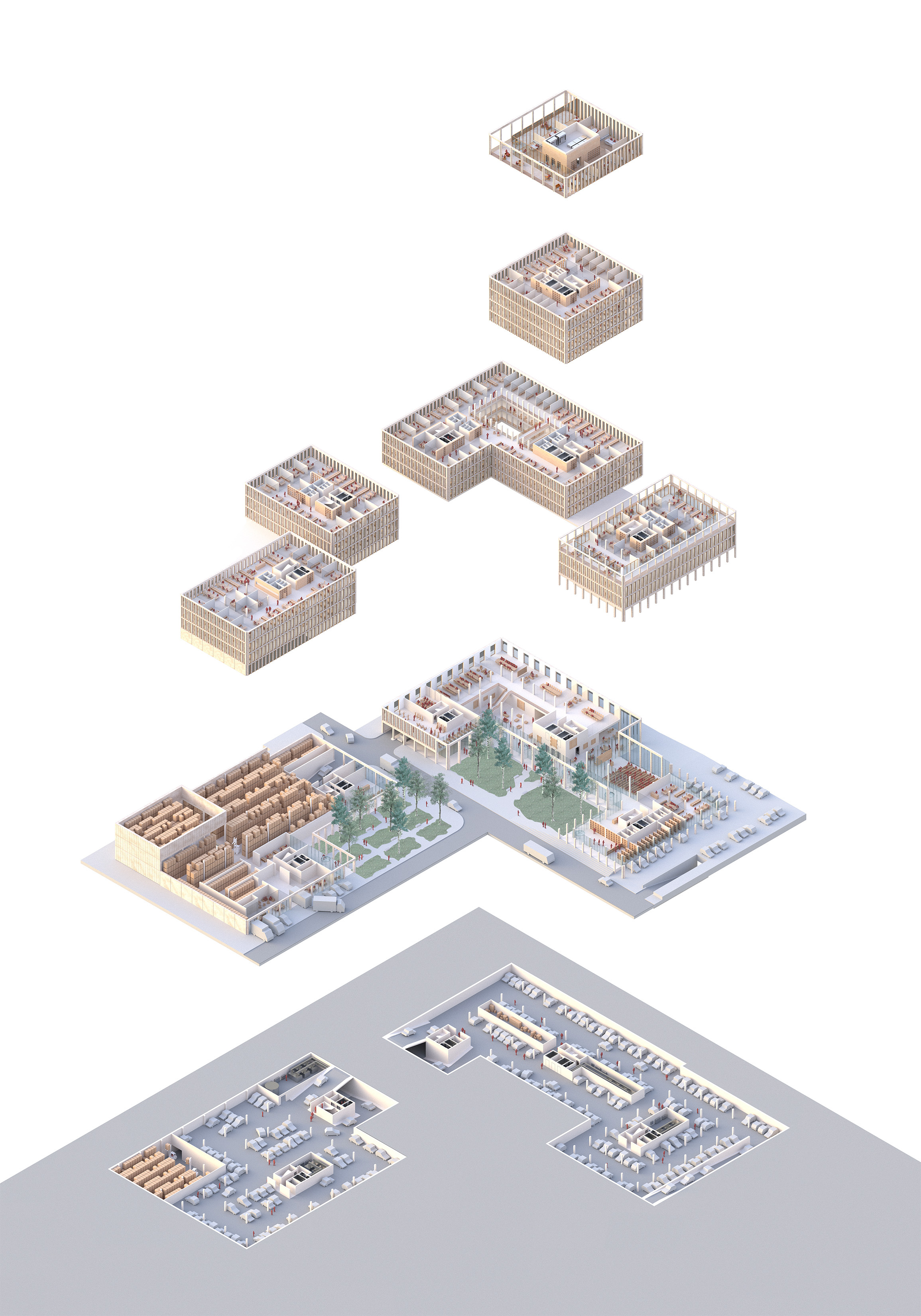 The functions of the public levels are oriented towards the central plaza, which enables shared functions and activities between the buildings. Essentially, the entire plaza acts as a spacious and sunny lobby for the cluster. While the centrally oriented typology is primarily a way to deal with the underdeveloped urban character of the area, it simultaneously forms a fundamentally urban ensemble: a semi-permeable city block with a central plaza. It anticipates the future potential of the area and, due to its fragmented composition, remains flexible for future connections to its surroundings.