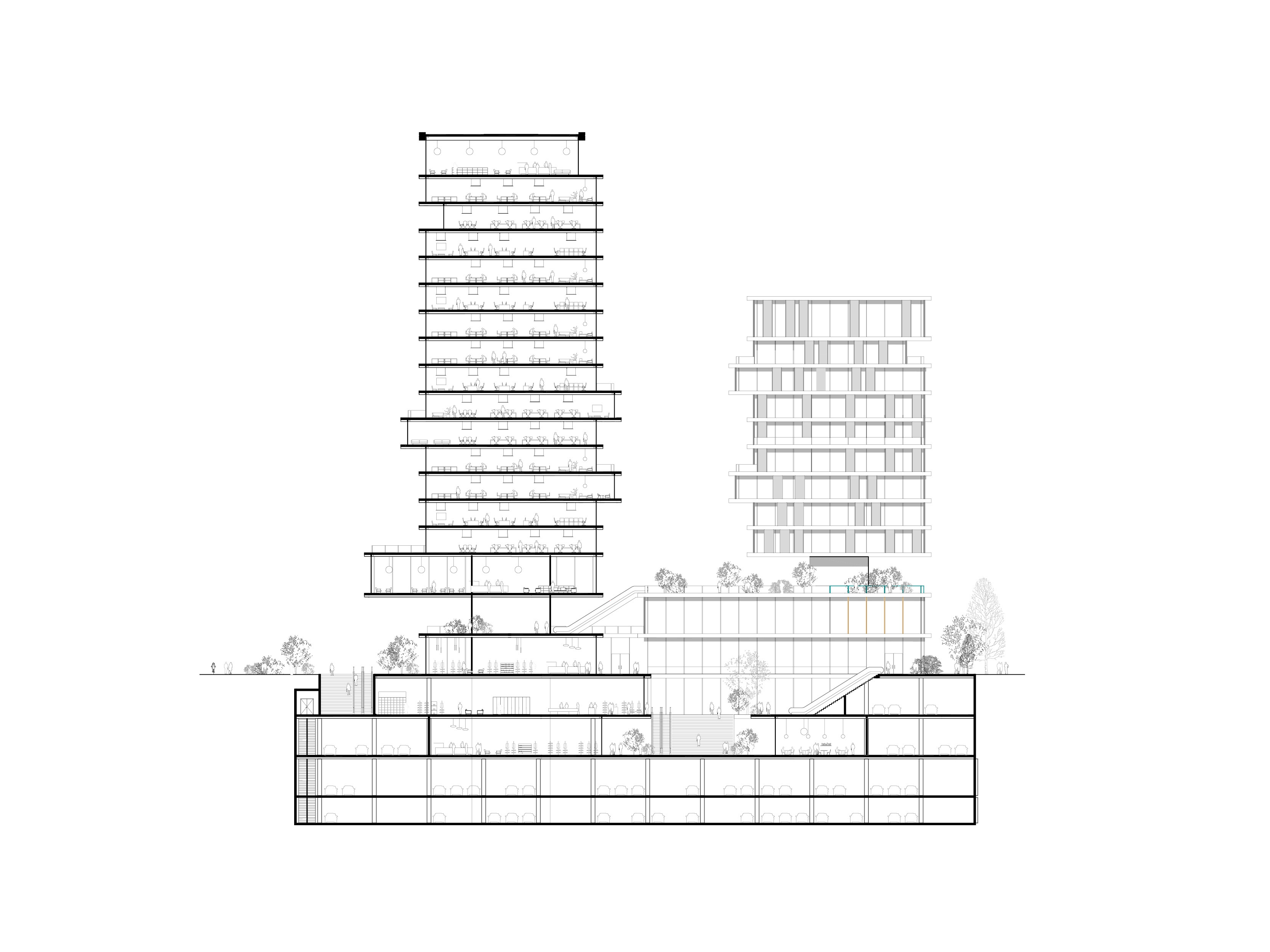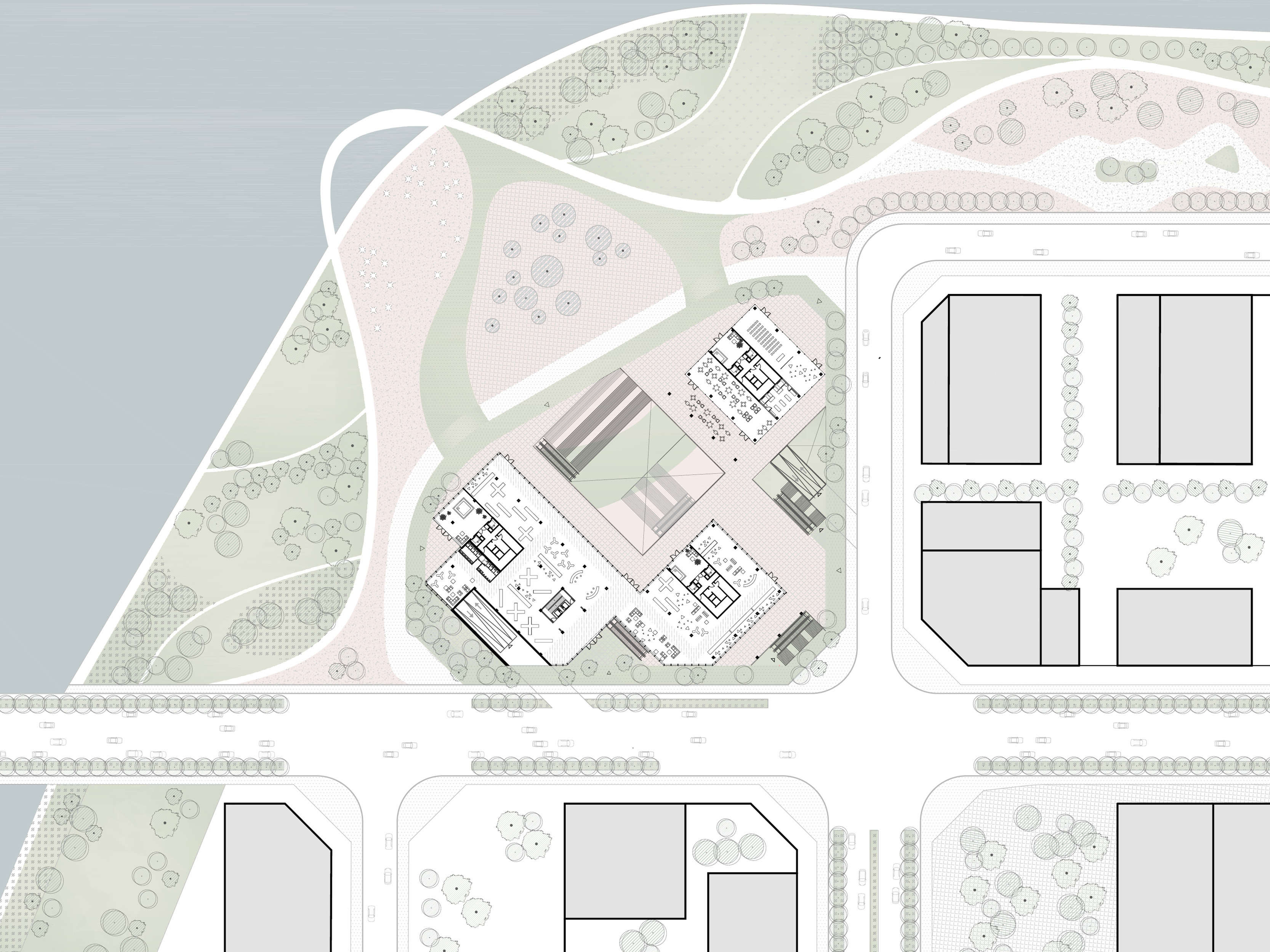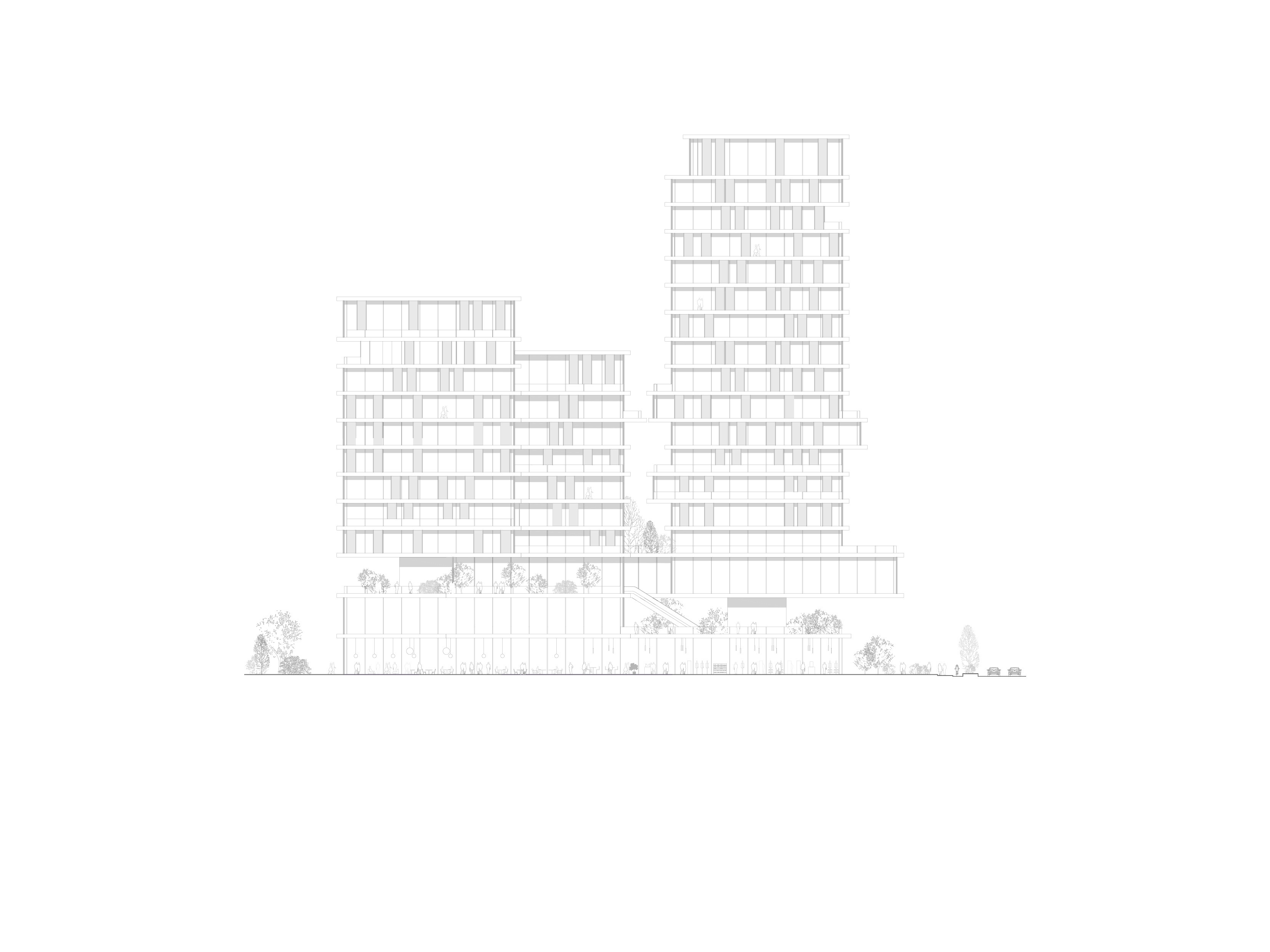 Taking advantage of the unique site, the project aims to form a new border between the city and the landscape, creating an active urban ground that grows out of the landscape. The grid of towers is rotated in relation to the surrounding buildings, thus facing the waterfront directly. The towers are lightweight mirages above the green landscape, set apart from the hard city in the background. In this cluster, three towers make a soft composition of horizontal lines. The building is independent, crowning the edge of the waterfront while simultaneously appearing embedded into the landscape.