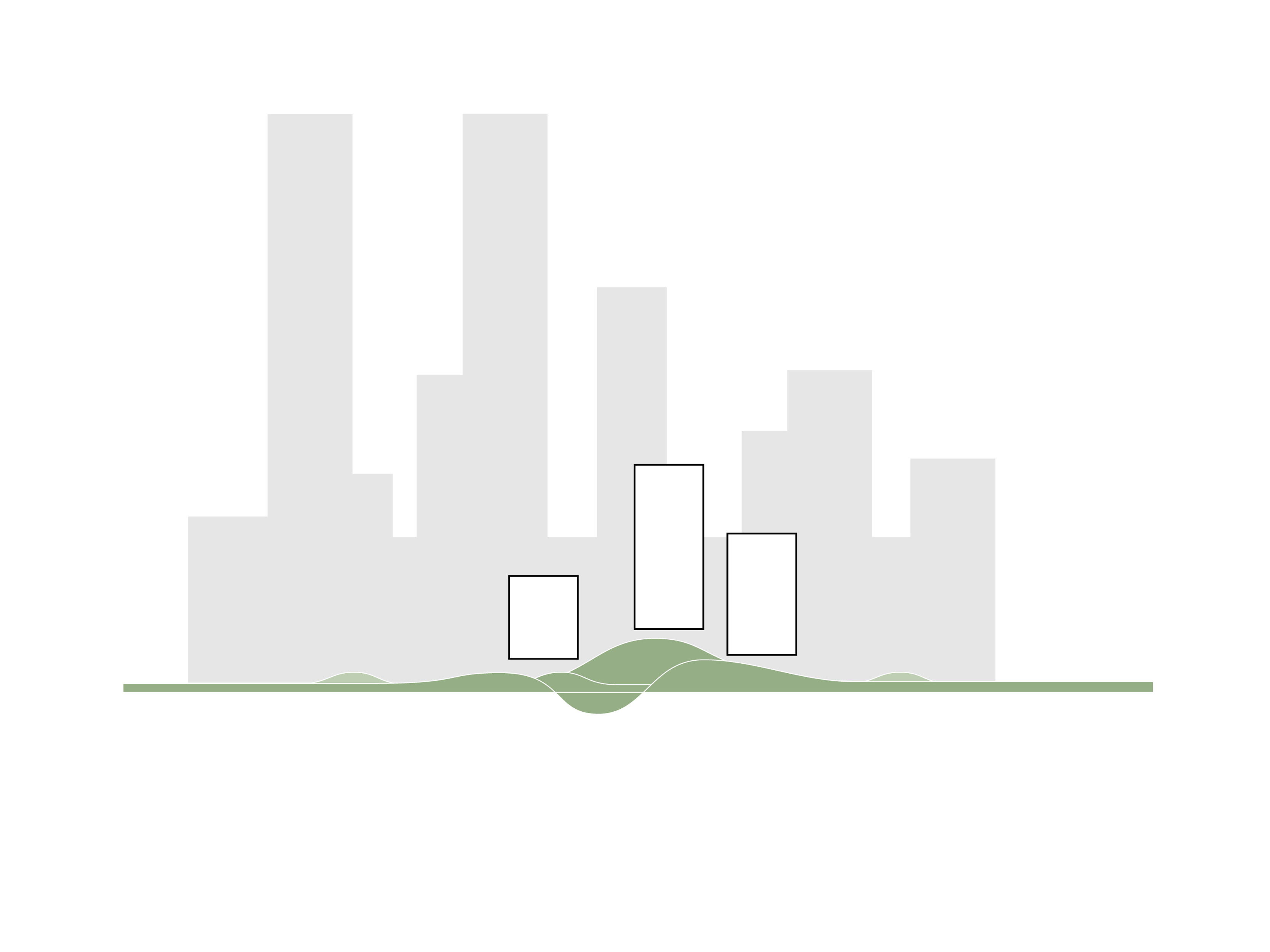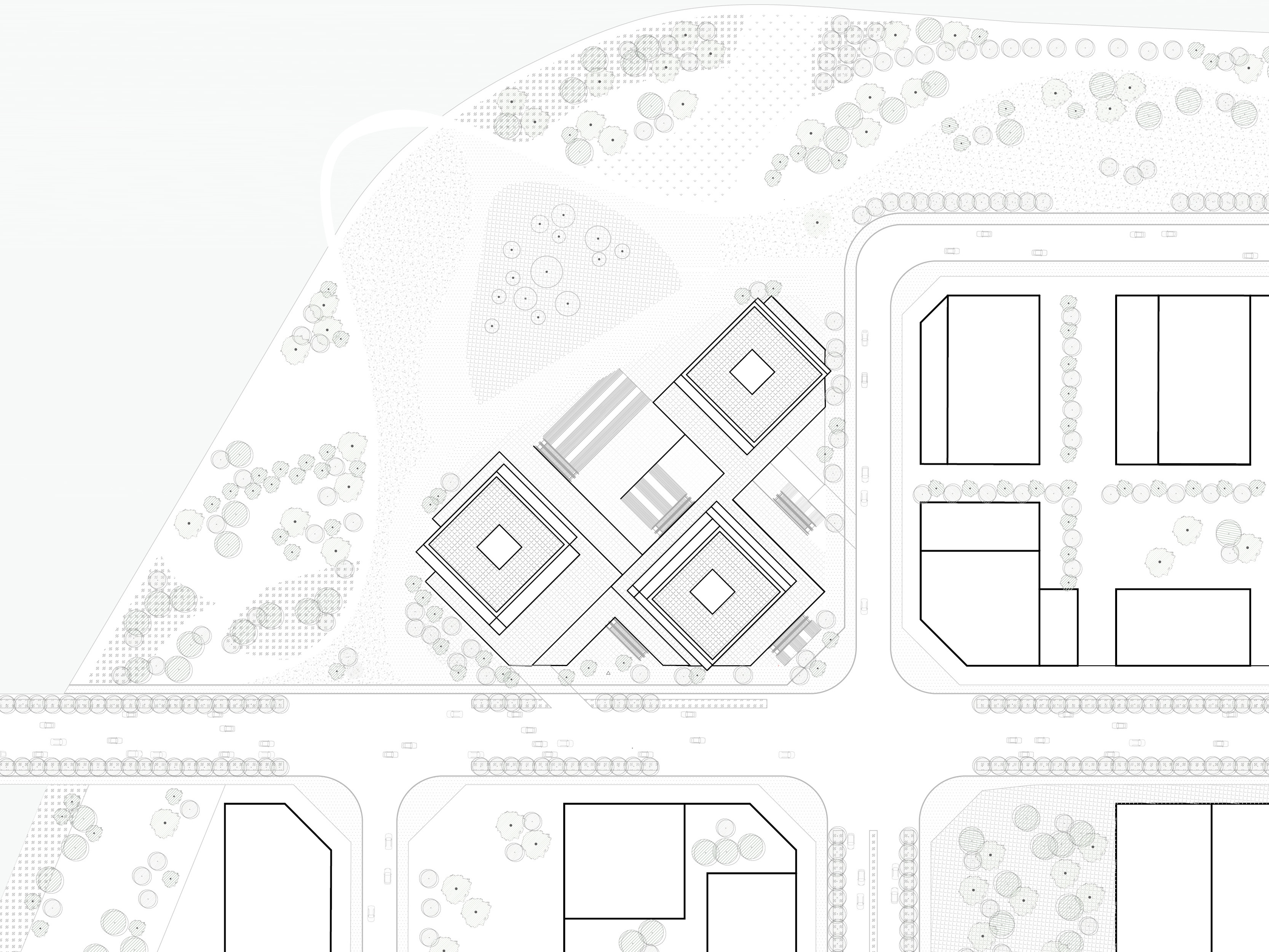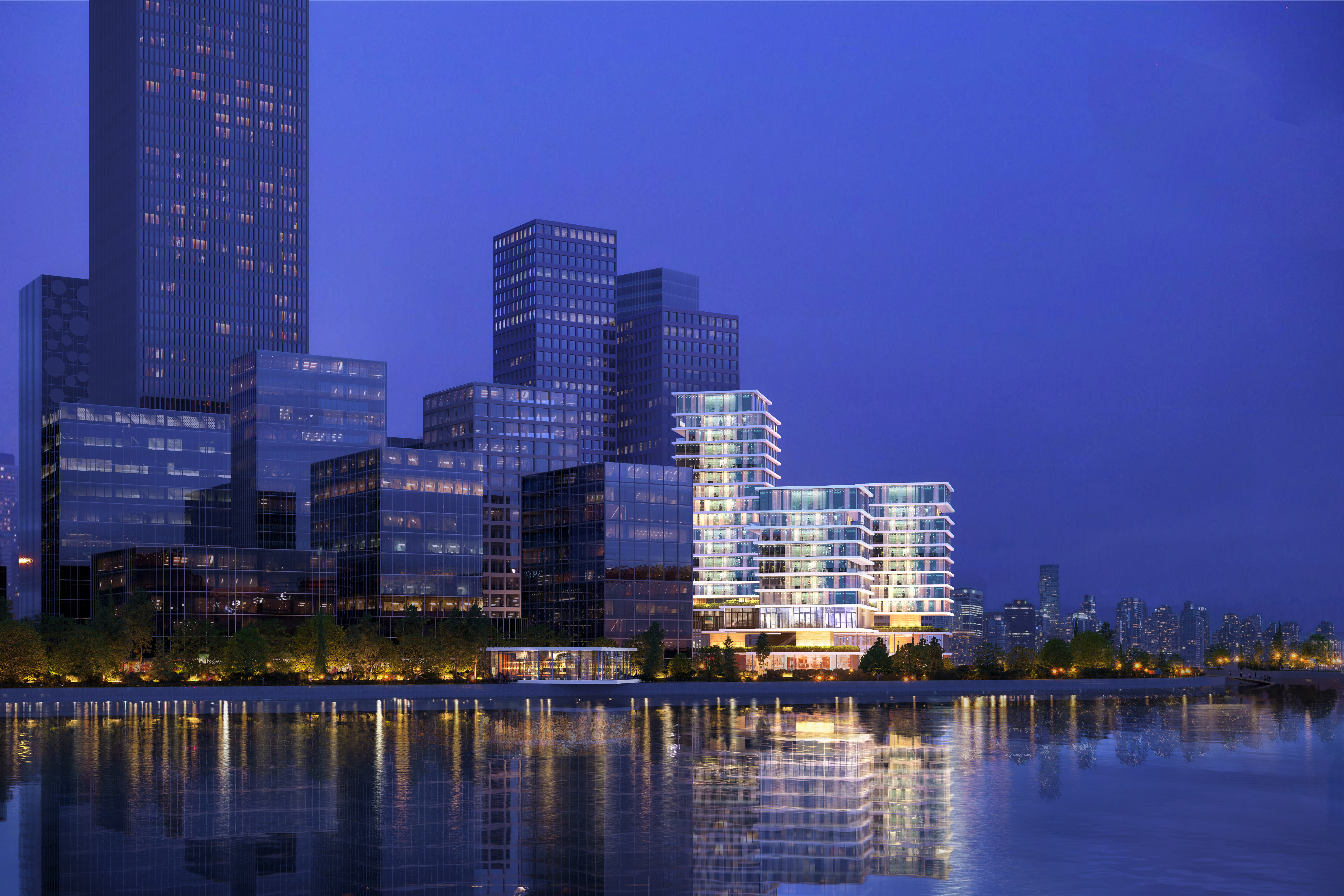 Taking advantage of the unique site, the project aims to form a new border between the city and the landscape, creating an active urban ground that grows out of the landscape. The grid of towers is rotated in relation to the surrounding buildings, thus facing the waterfront directly. The towers are lightweight mirages above the green landscape, set apart from the hard city in the background. In this cluster, three towers make a soft composition of horizontal lines. The building is independent, crowning the edge of the waterfront while simultaneously appearing embedded into the landscape.