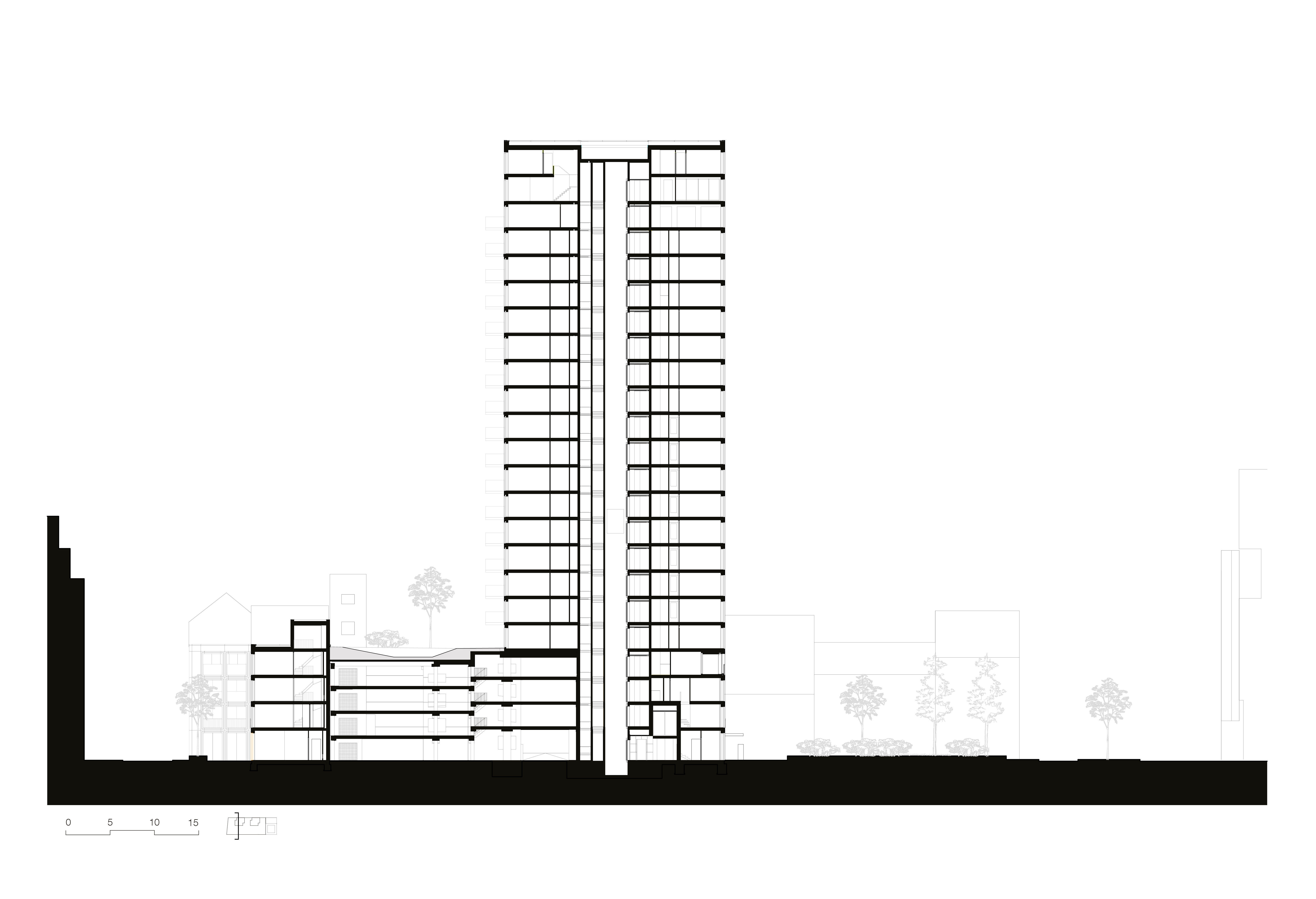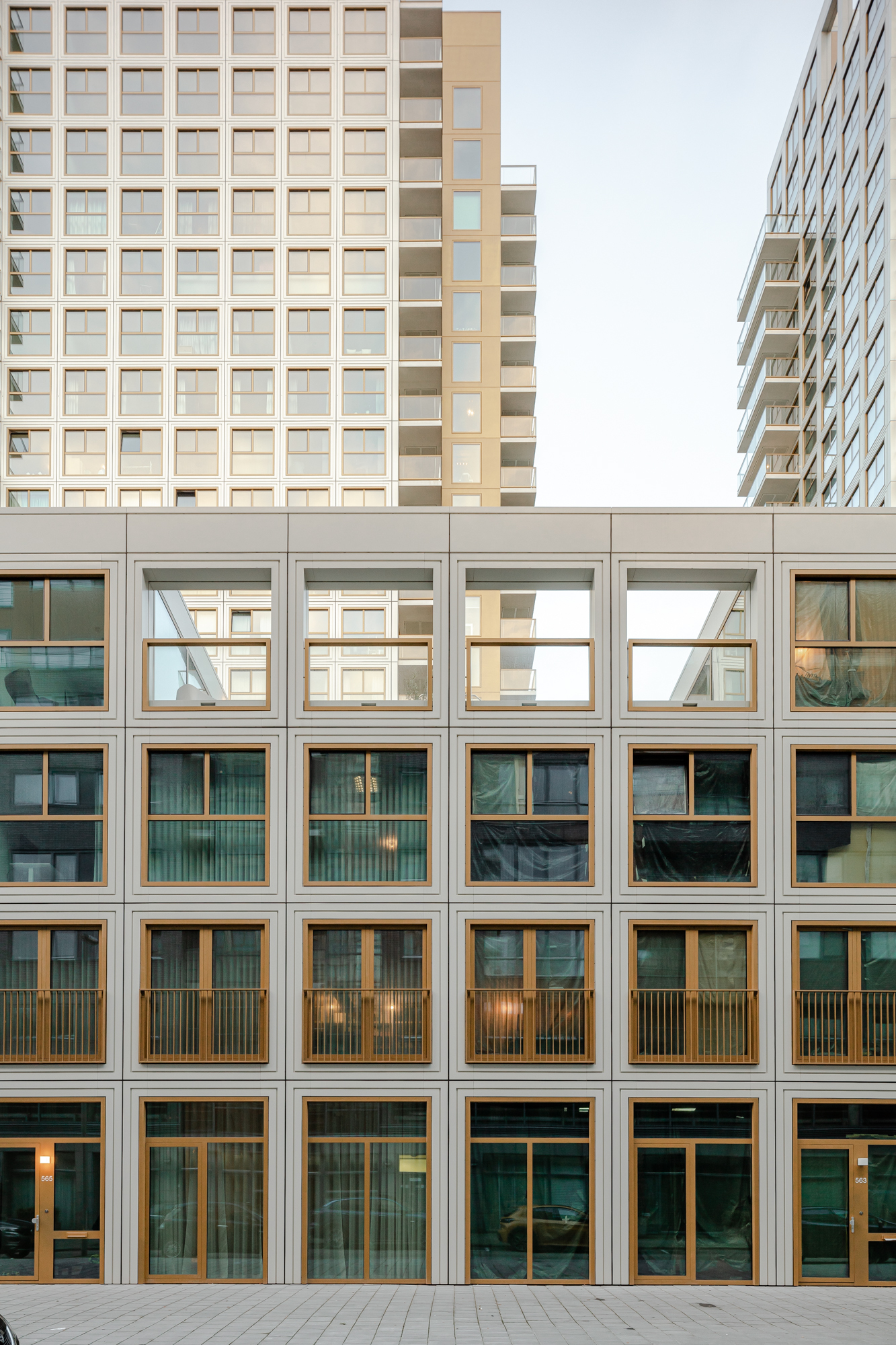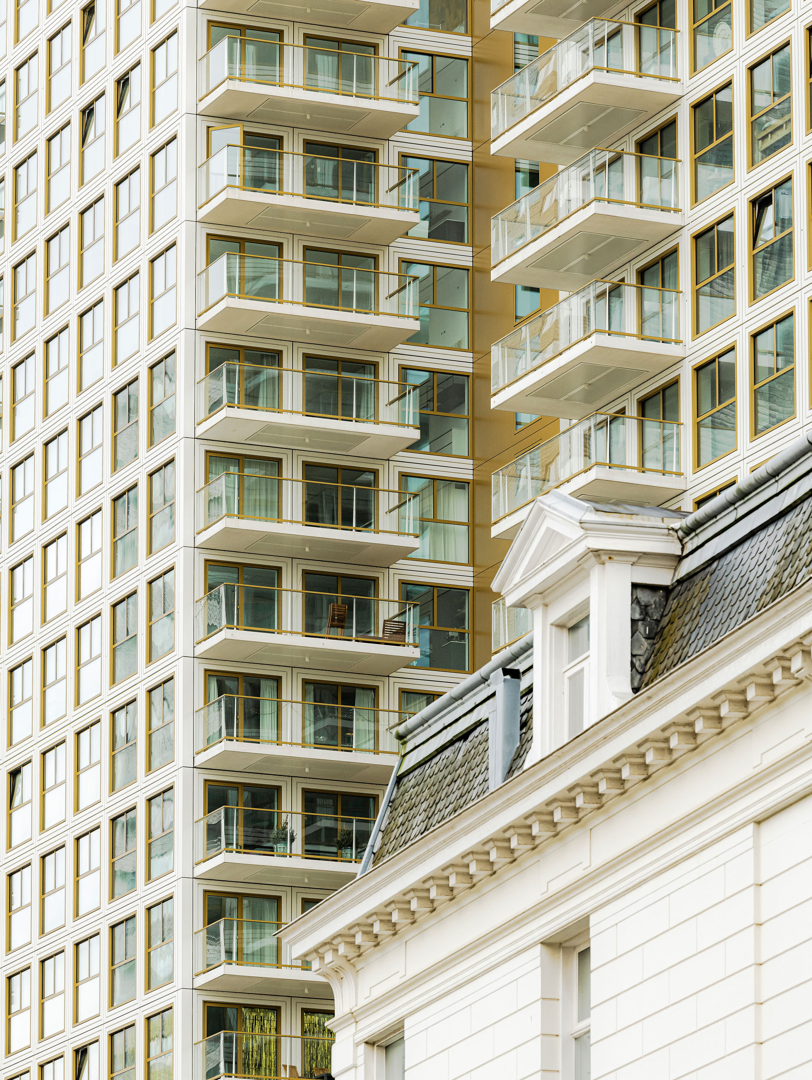 The four-story base spans the length of the site and its outer edges are lined with townhouses that preserve the liveliness of the street. A parking garage for the entire complex is hidden at the core of the plinth. The fourth floor garden, accessible to all residents, offers a respite from the dense urban area in the city centre. The two 70-meter-high towers rise from the plinth with a shift along the centreline of the floor plan, giving them a slender angularity and enabling various apartment layouts with impressive views. A uniform, light colour palette and a recognizable façade pattern ensure the overall unity of the ensemble. The grid-like facade draws from the ornately trimmed openings of the area’s neo-classical buildings but gives them a contemporary reinterpretation.