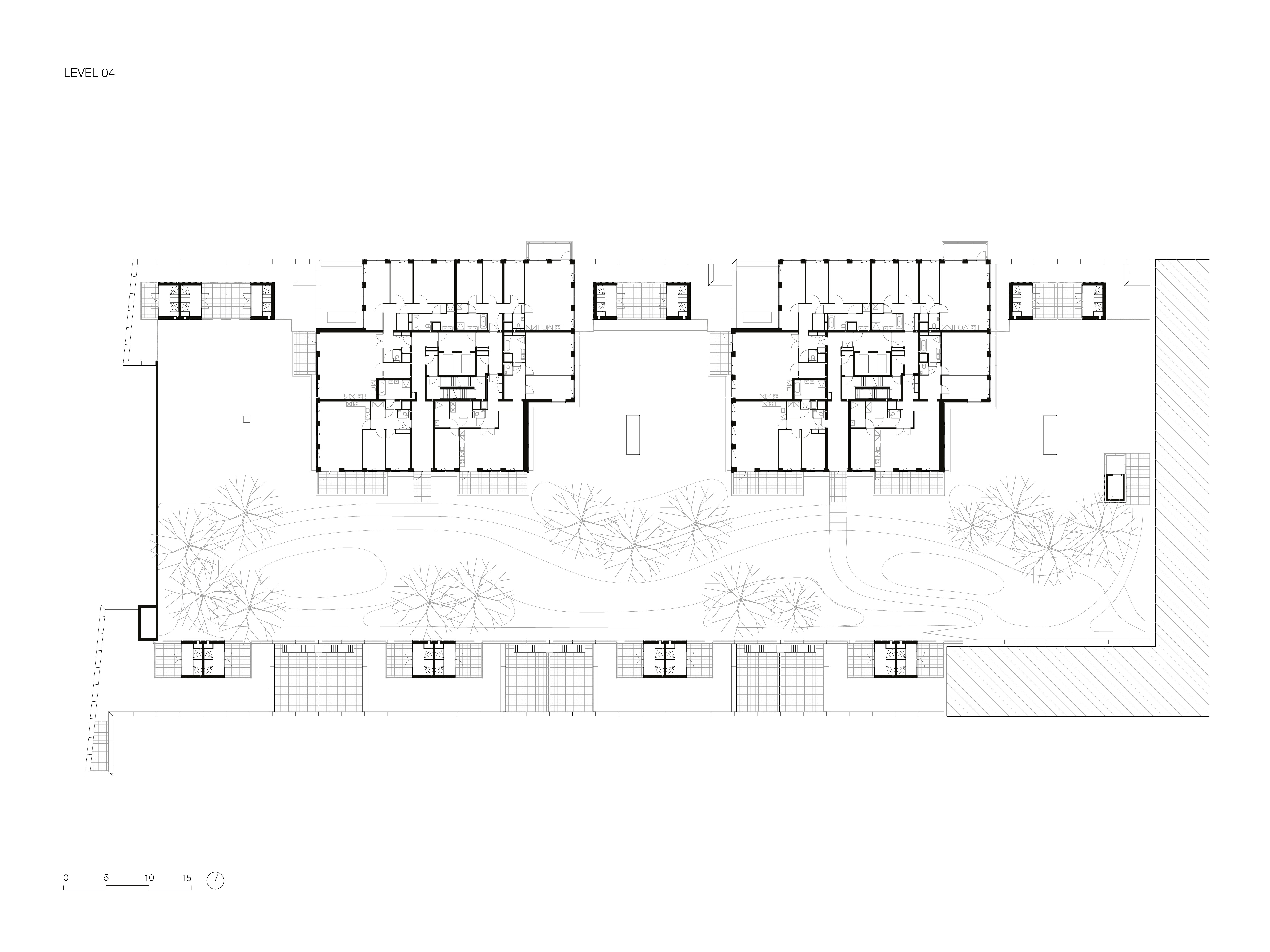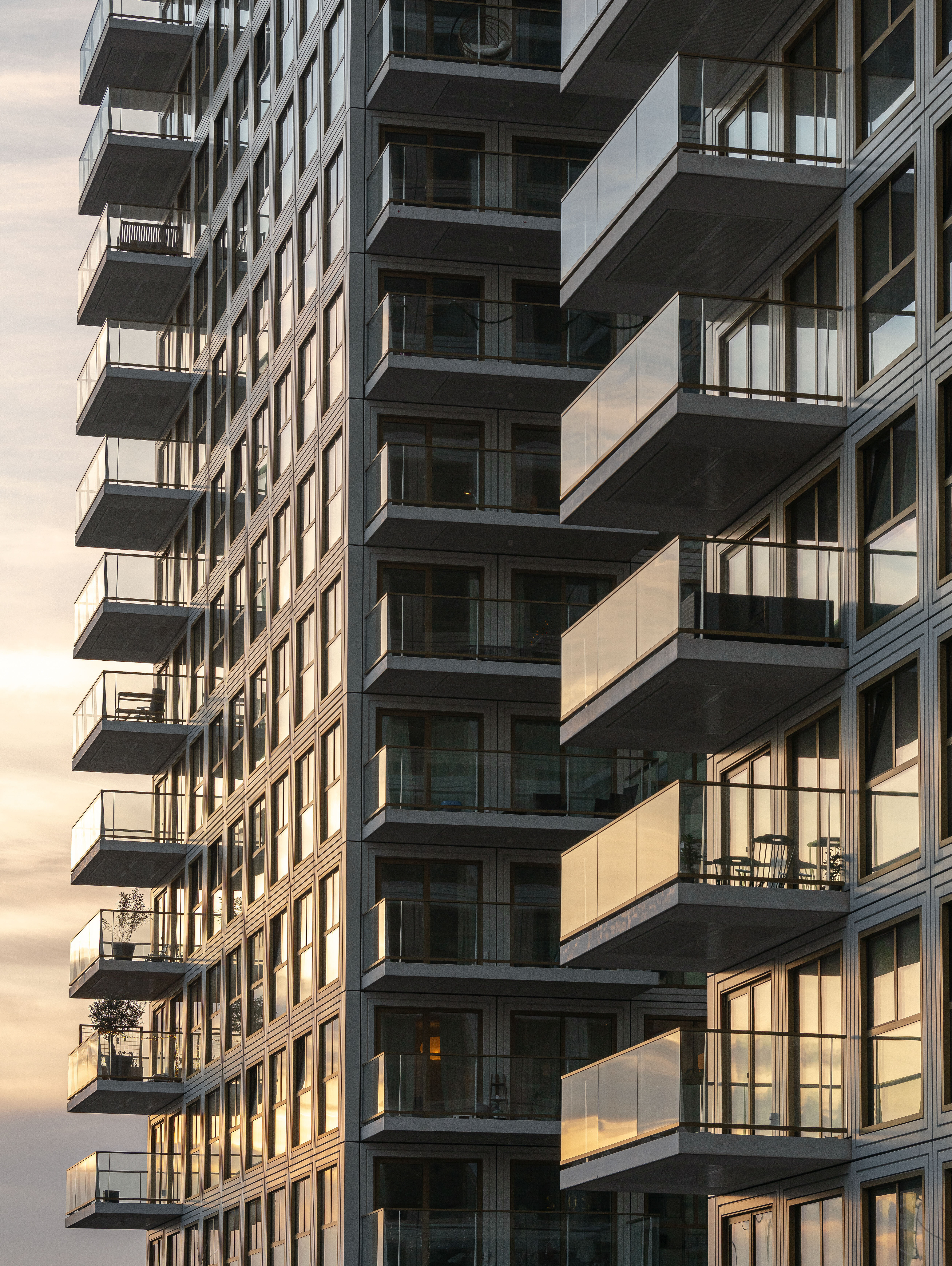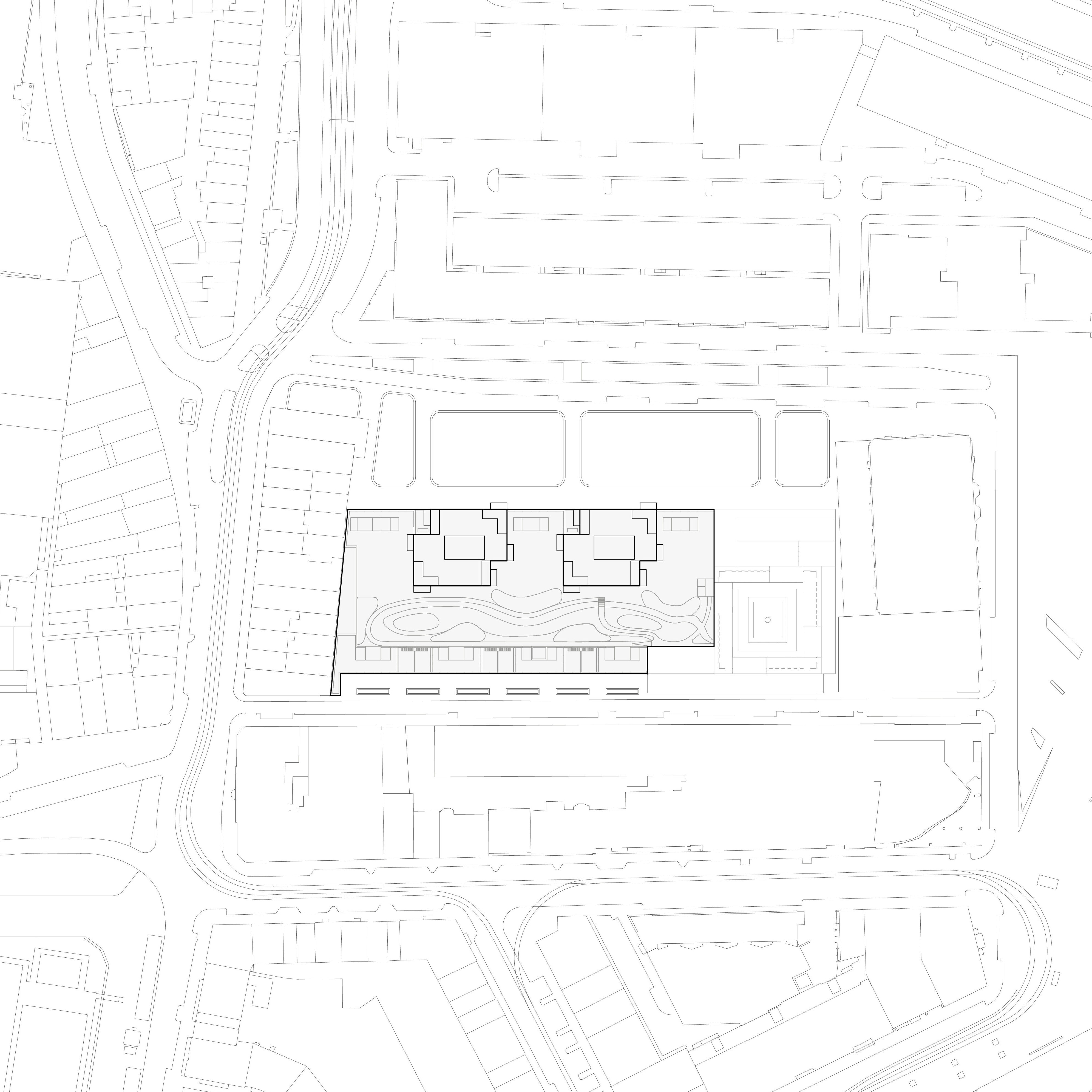 The four-story base spans the length of the site and its outer edges are lined with townhouses that preserve the liveliness of the street. A parking garage for the entire complex is hidden at the core of the plinth. The fourth floor garden, accessible to all residents, offers a respite from the dense urban area in the city centre. The two 70-meter-high towers rise from the plinth with a shift along the centreline of the floor plan, giving them a slender angularity and enabling various apartment layouts with impressive views. A uniform, light colour palette and a recognizable façade pattern ensure the overall unity of the ensemble. The grid-like facade draws from the ornately trimmed openings of the area’s neo-classical buildings but gives them a contemporary reinterpretation.