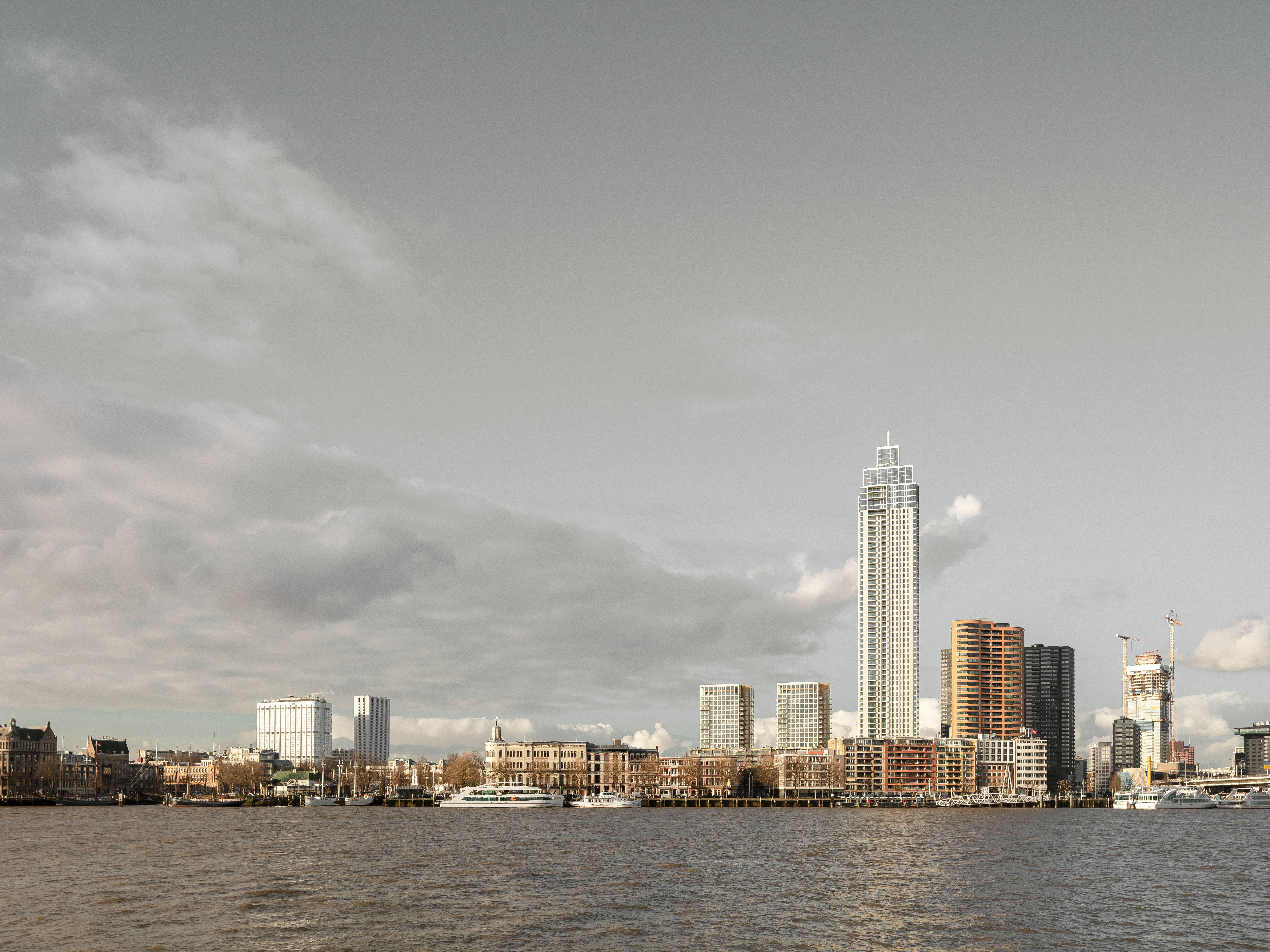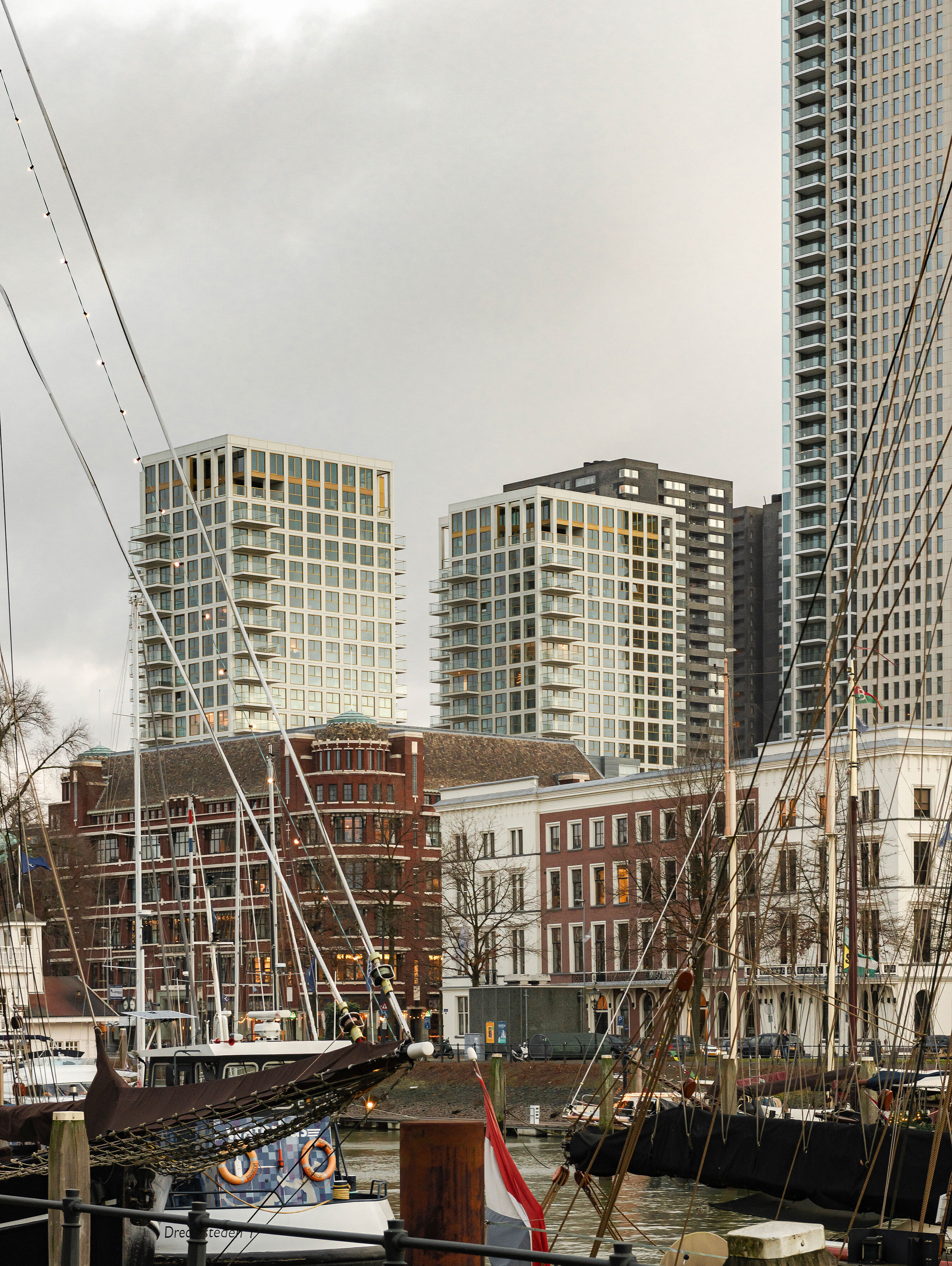 De Zalmhaven is a high-quality residential complex adjacent to the former eponymous port in the centre of Rotterdam. It is comprised of one high-rise by Dam & Partners Architecten and two mid-rise towers sprouting from a sturdy plinth by KAAN Architecten.