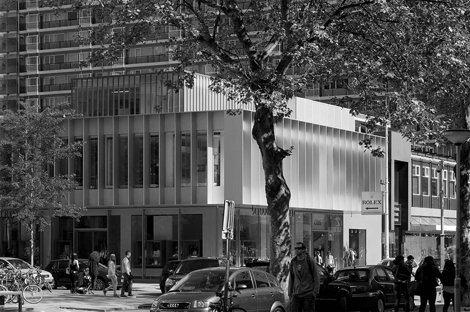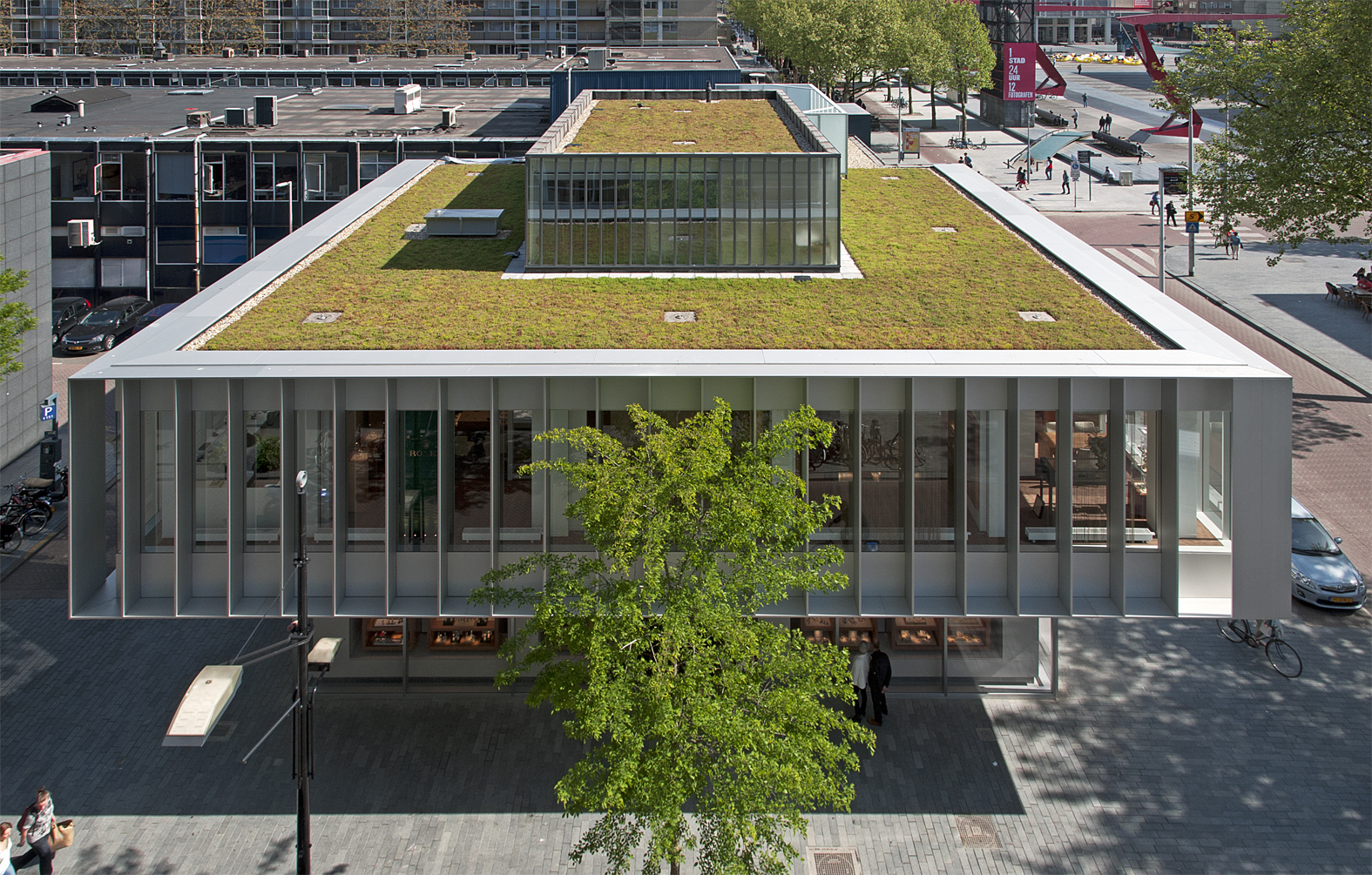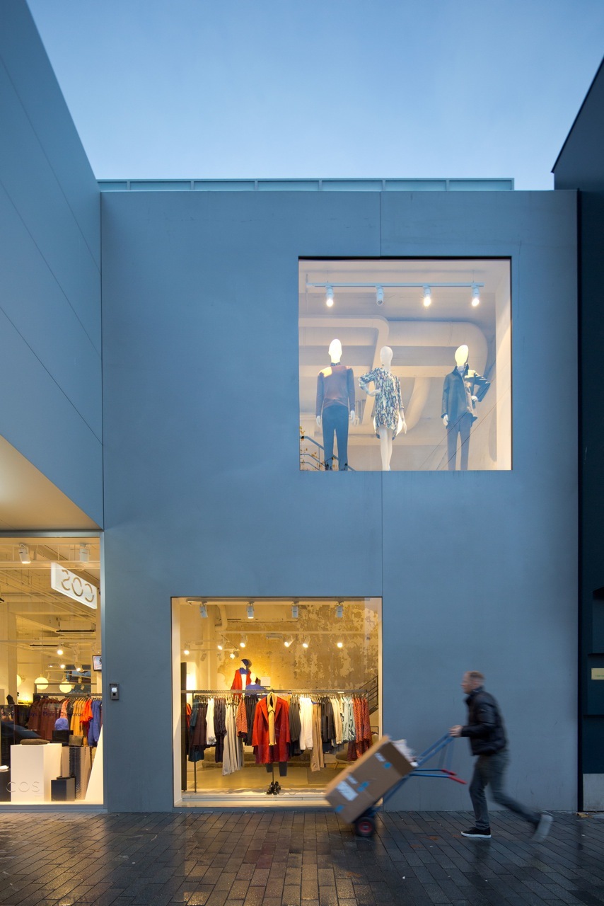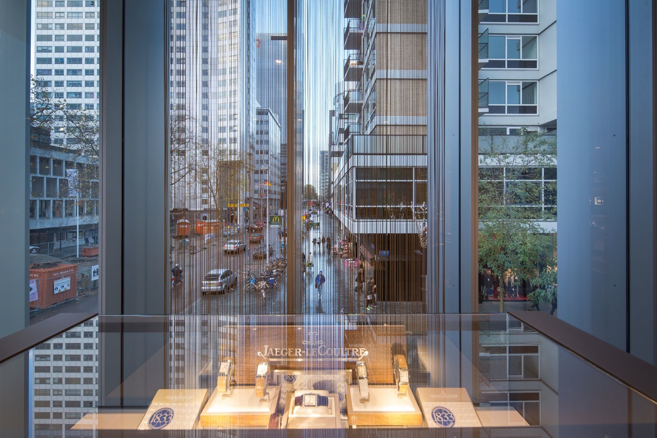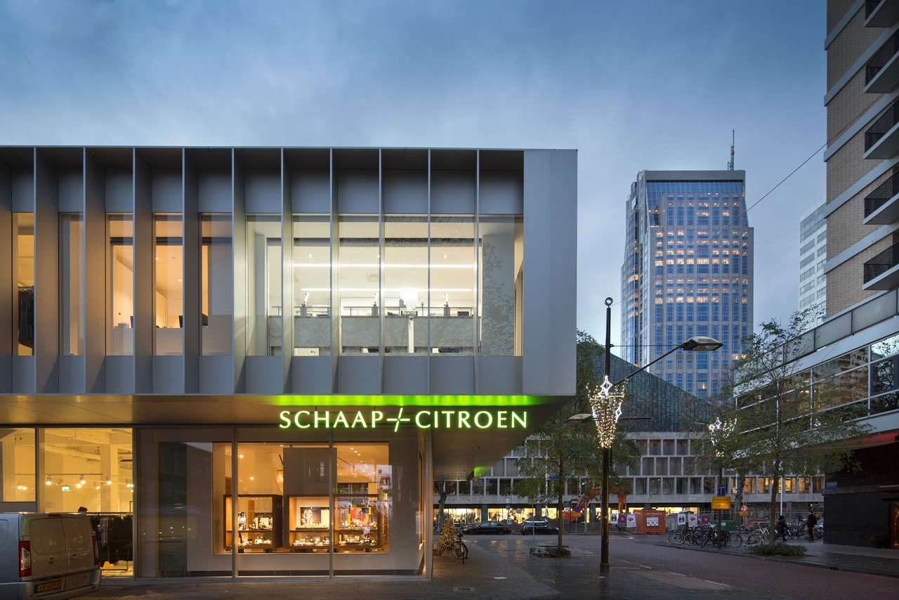 The façade of the cantilevered floor is accentuated by a series of sharp aluminium slats in front of large glass sheet windows. The building itself is simple with strong edges. When seen at an angle, views in are obstructed; viewed straight on, it is like a viewing-box with a lively interior. The three stacked volumes are characterized by glazed surfaces, flush transparency and sharp expressivity and are a contemporary interpretation of the typical 1960s angularity of the Lijnbaan area.