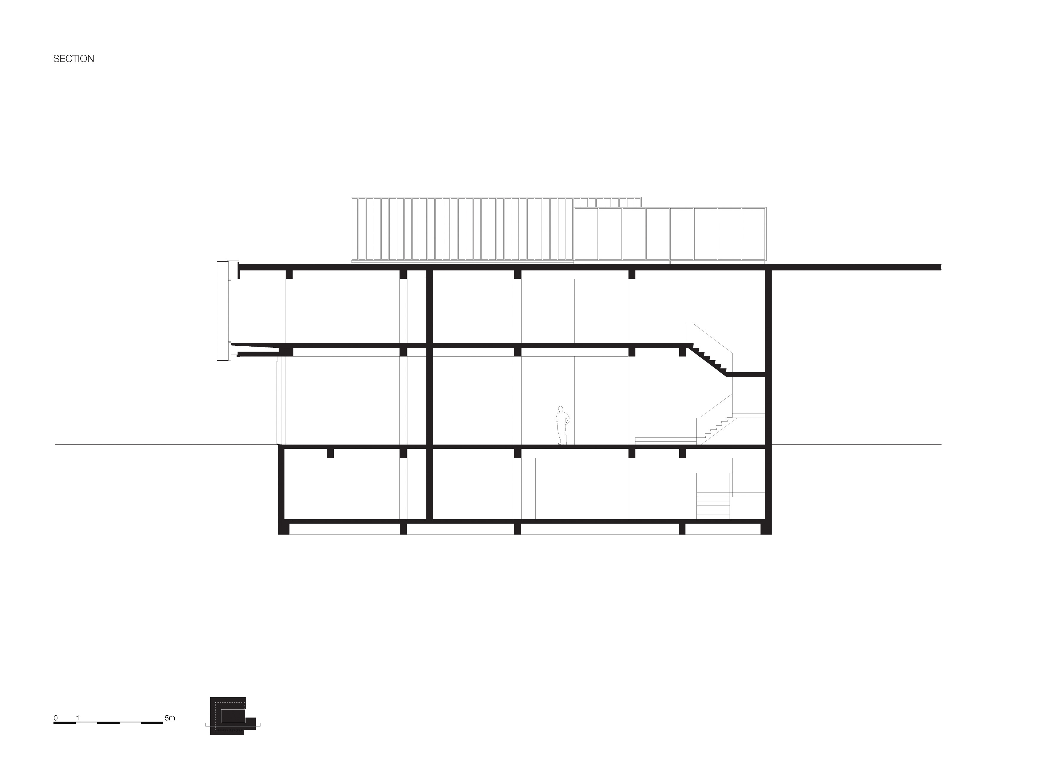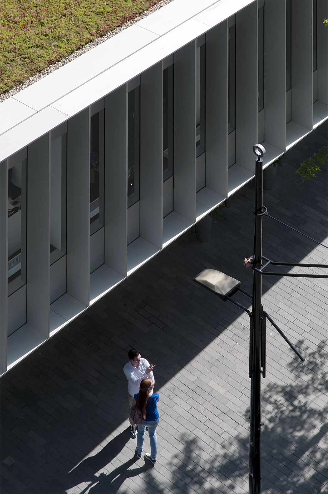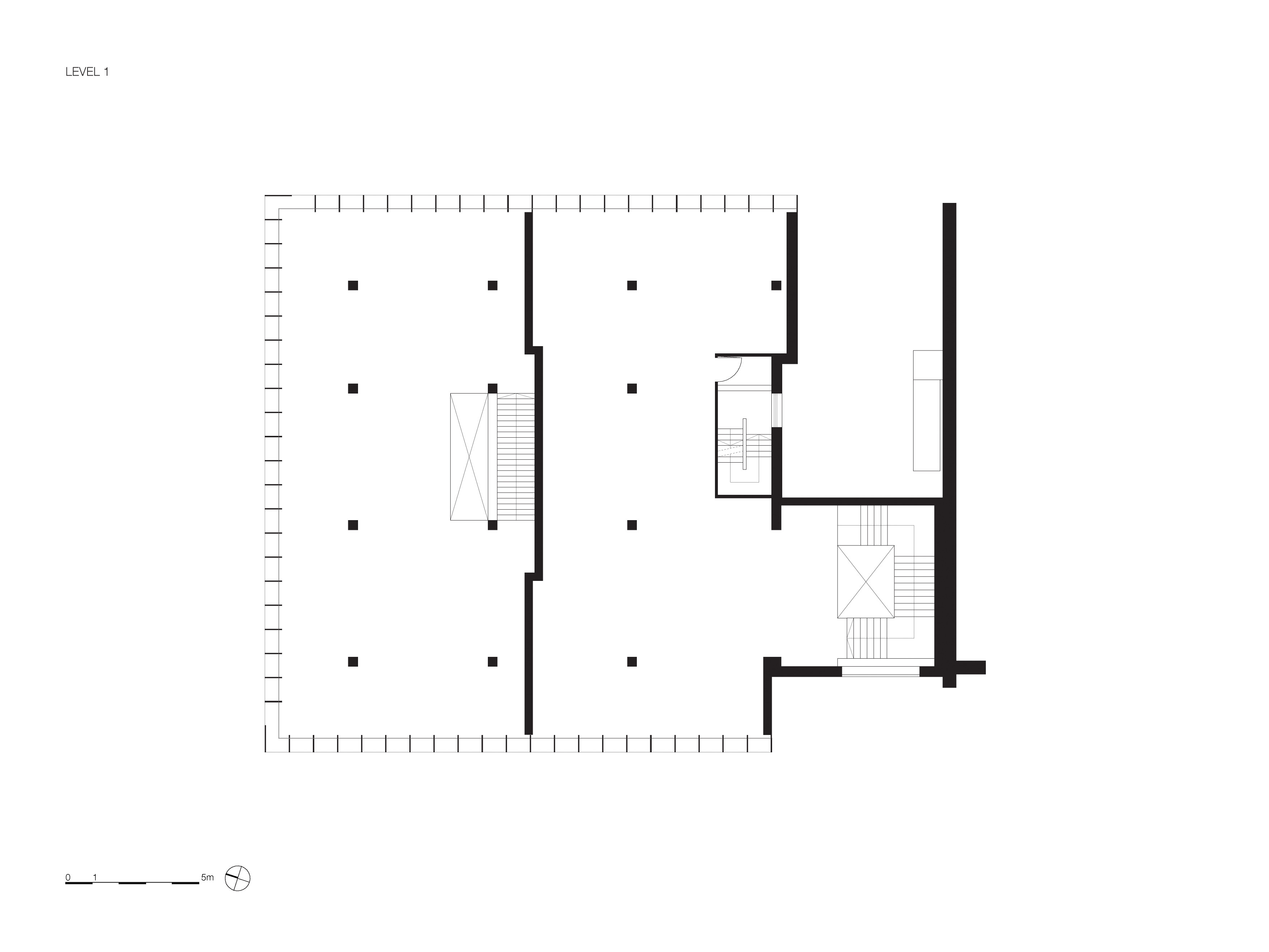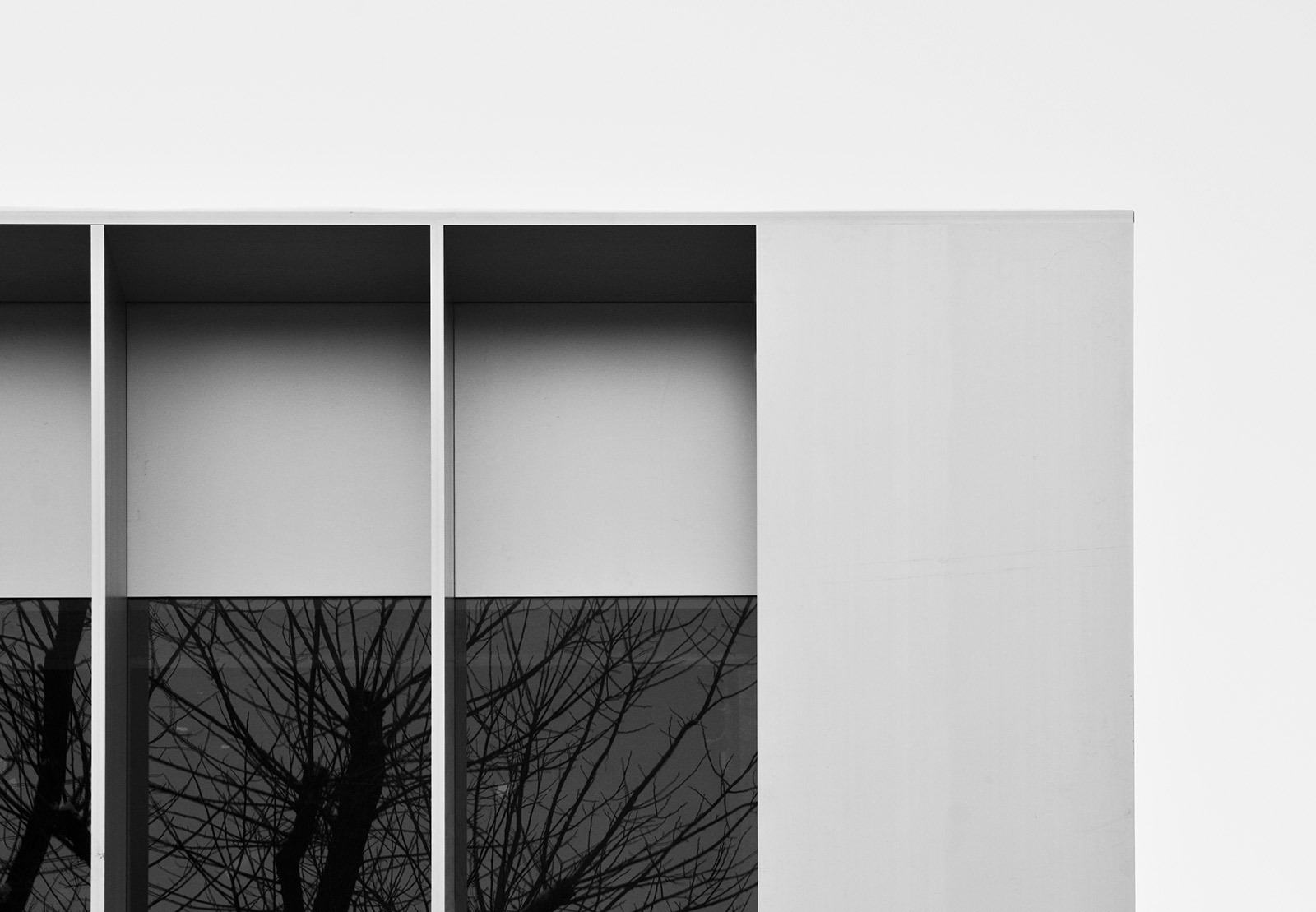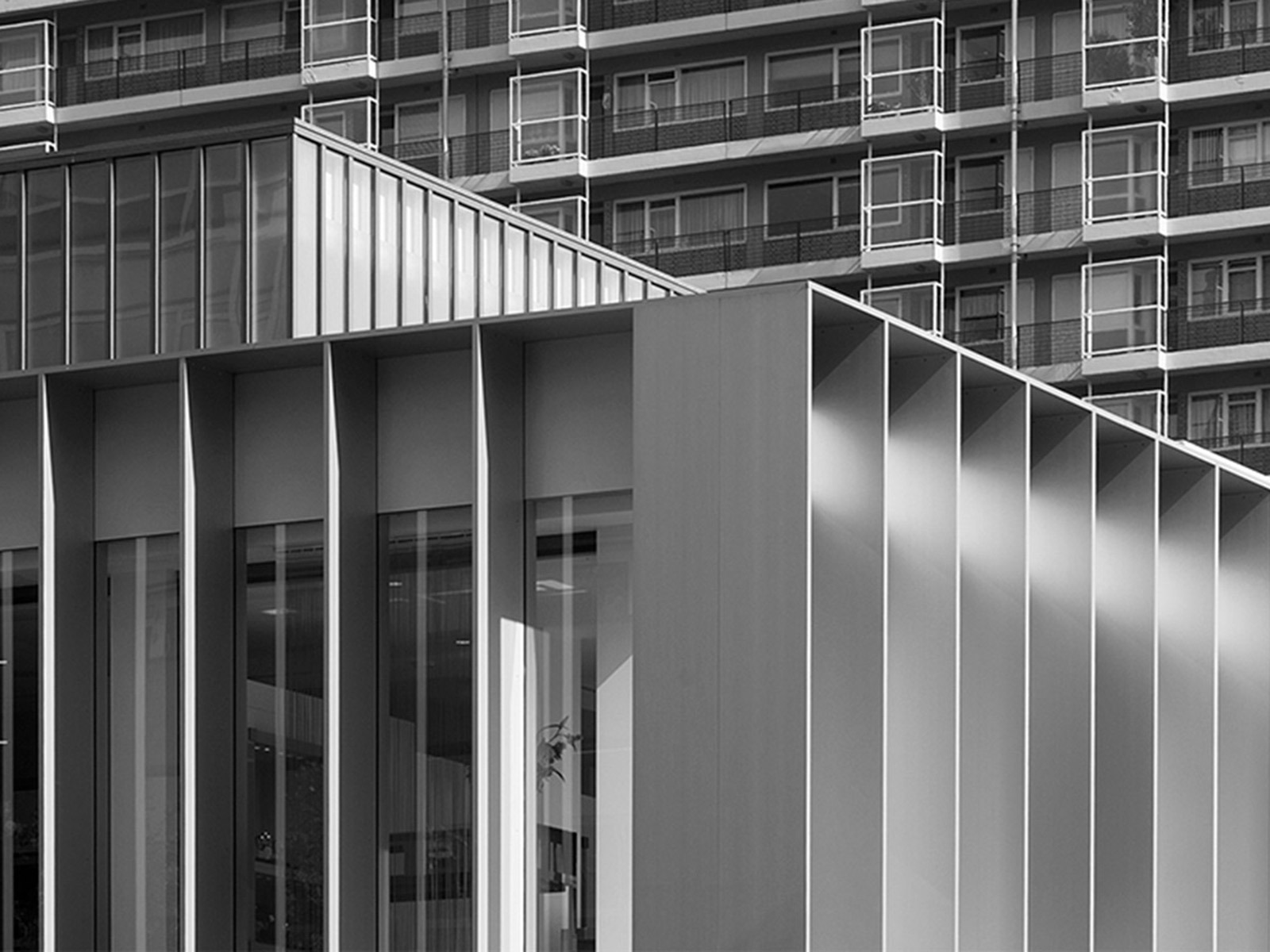 The façade of the cantilevered floor is accentuated by a series of sharp aluminium slats in front of large glass sheet windows. The building itself is simple with strong edges. When seen at an angle, views in are obstructed; viewed straight on, it is like a viewing-box with a lively interior. The three stacked volumes are characterized by glazed surfaces, flush transparency and sharp expressivity and are a contemporary interpretation of the typical 1960s angularity of the Lijnbaan area.