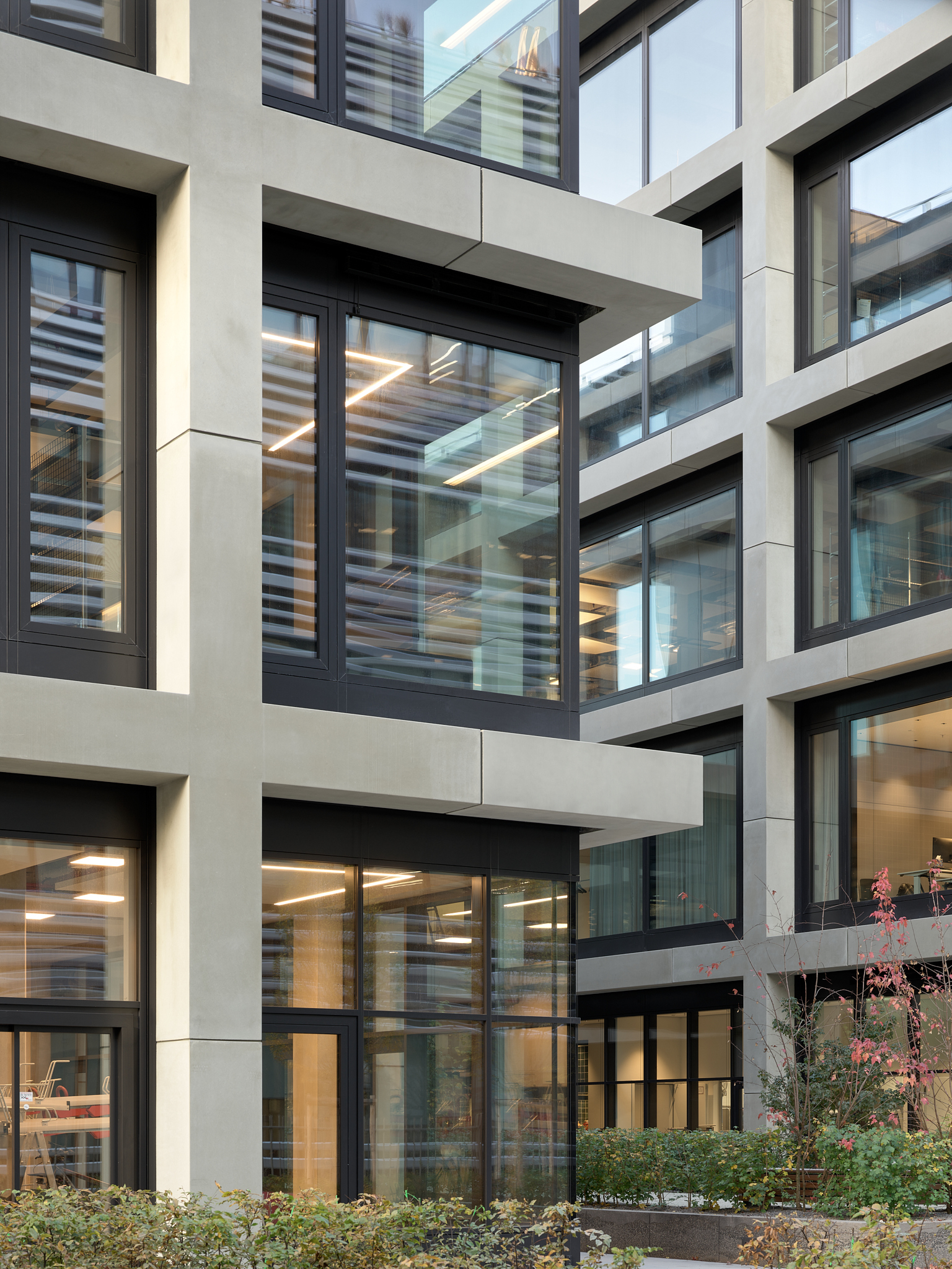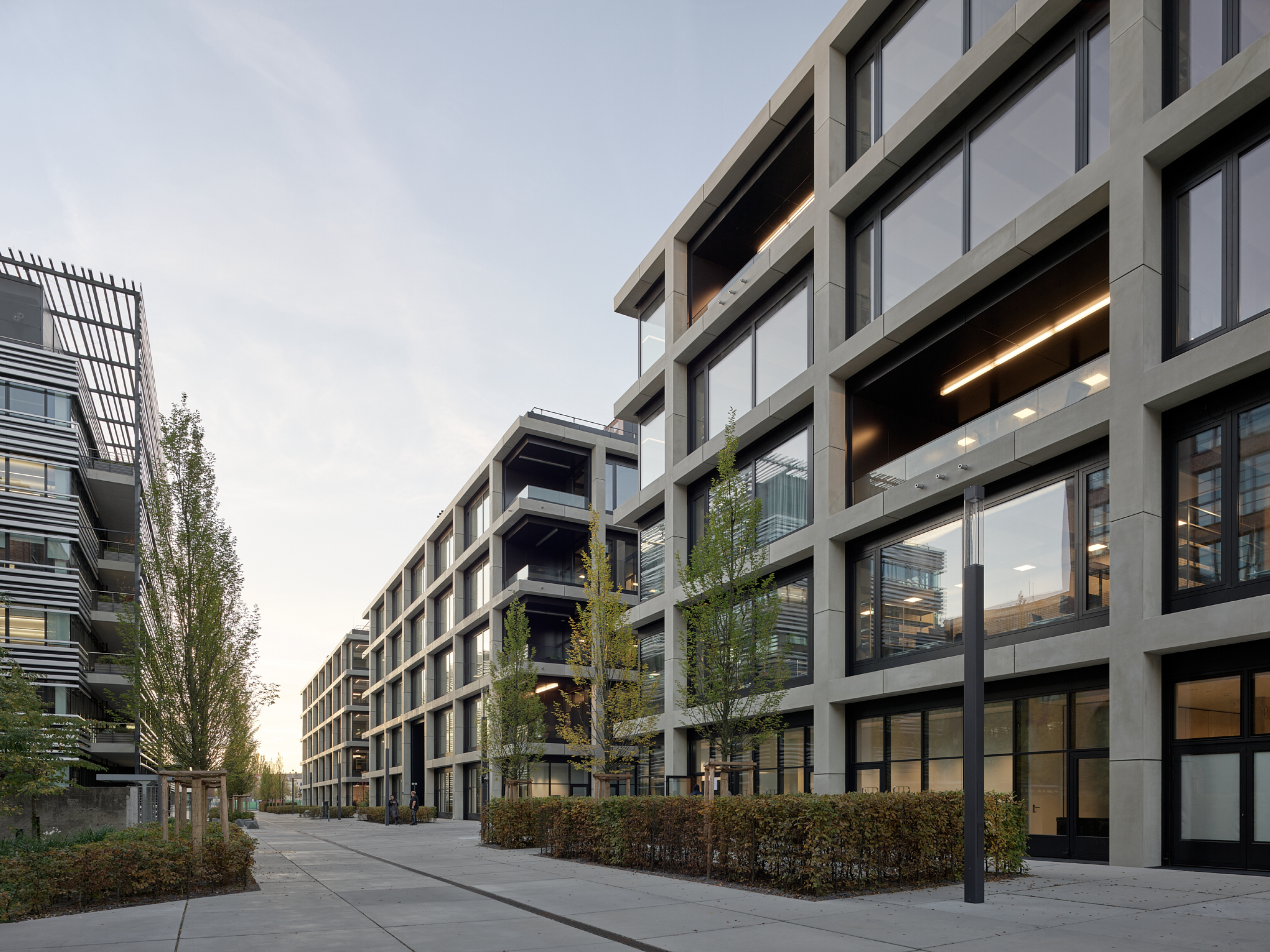 Located in the former industrial and commercial Werksviertel district of Munich, the three iCampus buildings bring a novel office typology to the area: loft-like workspaces fit for contemporary creatives. The flexible internal dynamics of the building are visible through the generous openings on the modular façade. The rational grid consists of over 800 large prefab concrete elements, while dark metal cladding wraps the entrances, stairways, and technical spaces in a continuous skin.
