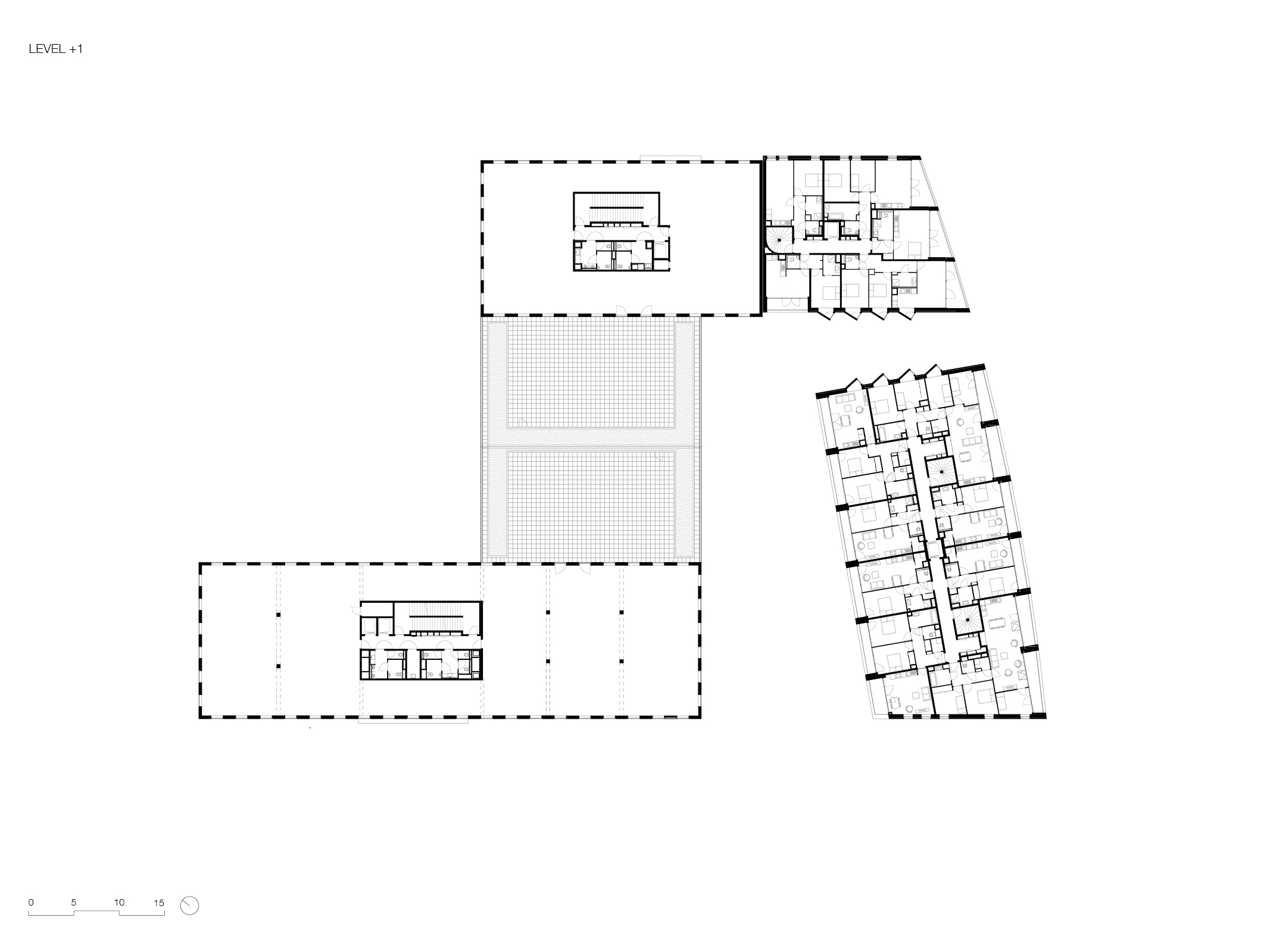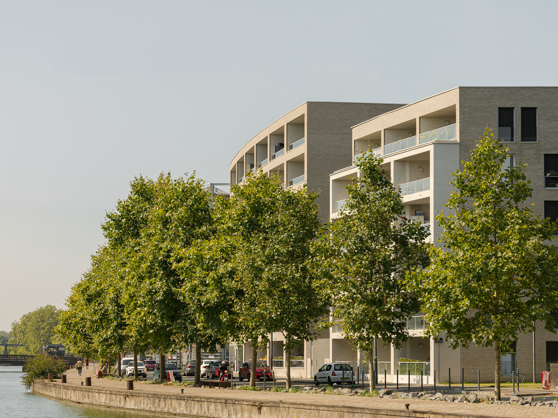 The complex functions according to mixed-use principles, assembling offices and housing within four buildings. The two residential buildings to the south of the site comprise housing units for rent (building A) and sale on the open market (B). They stand out with their beige brick facades curving along the canal line and protruding volumes, known as ‘spines’ which are a modern reinterpretation of industrial bay windows and provide each apartment with direct views over the Deûle. There are two office buildings (C and D) on the northern side, offering extensive floorplans and flexible workplaces. Both buildings have been awarded ‘good’ BREEAM environmental certification for their energy performance.