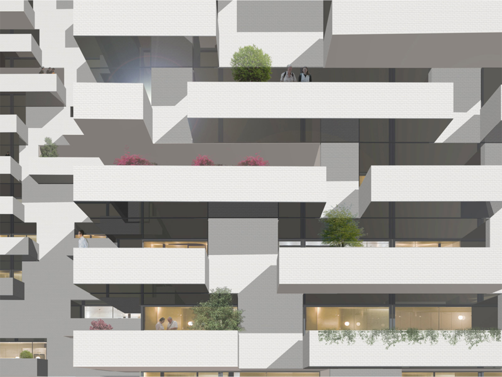 The existing apartments turned their backs on the commercial area, strictly separating the uses and leaving a massive logistic wasteland at ground level. The new project better combines the uses: commercial space on the first two floors with apartments above, and a blended area between the two for a large terrace and room for retail expansion. The residential balconies, depending on their exact orientation, are broad, recessed or semi-recessed and have been designed for maximum sun exposure during the afternoon.