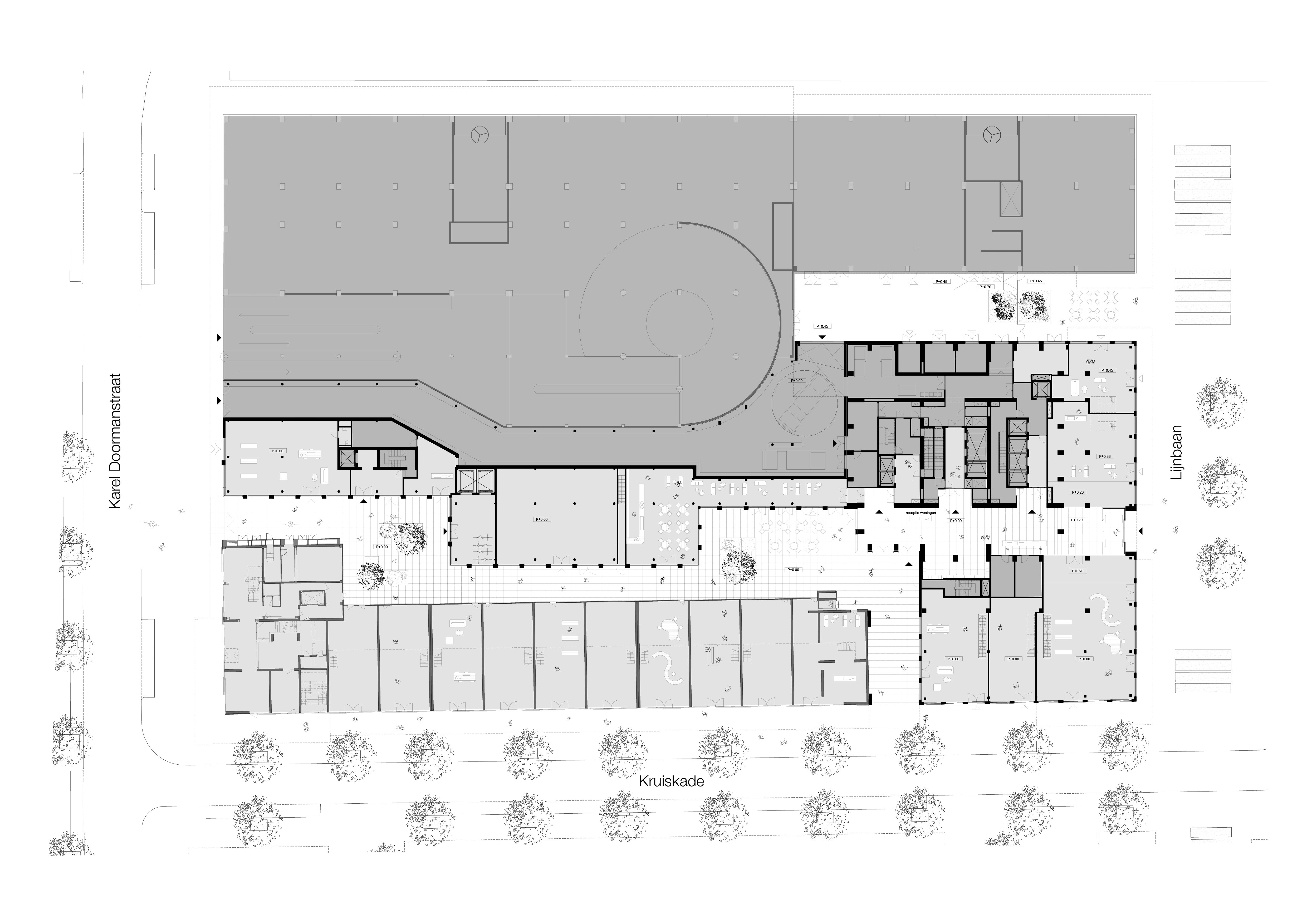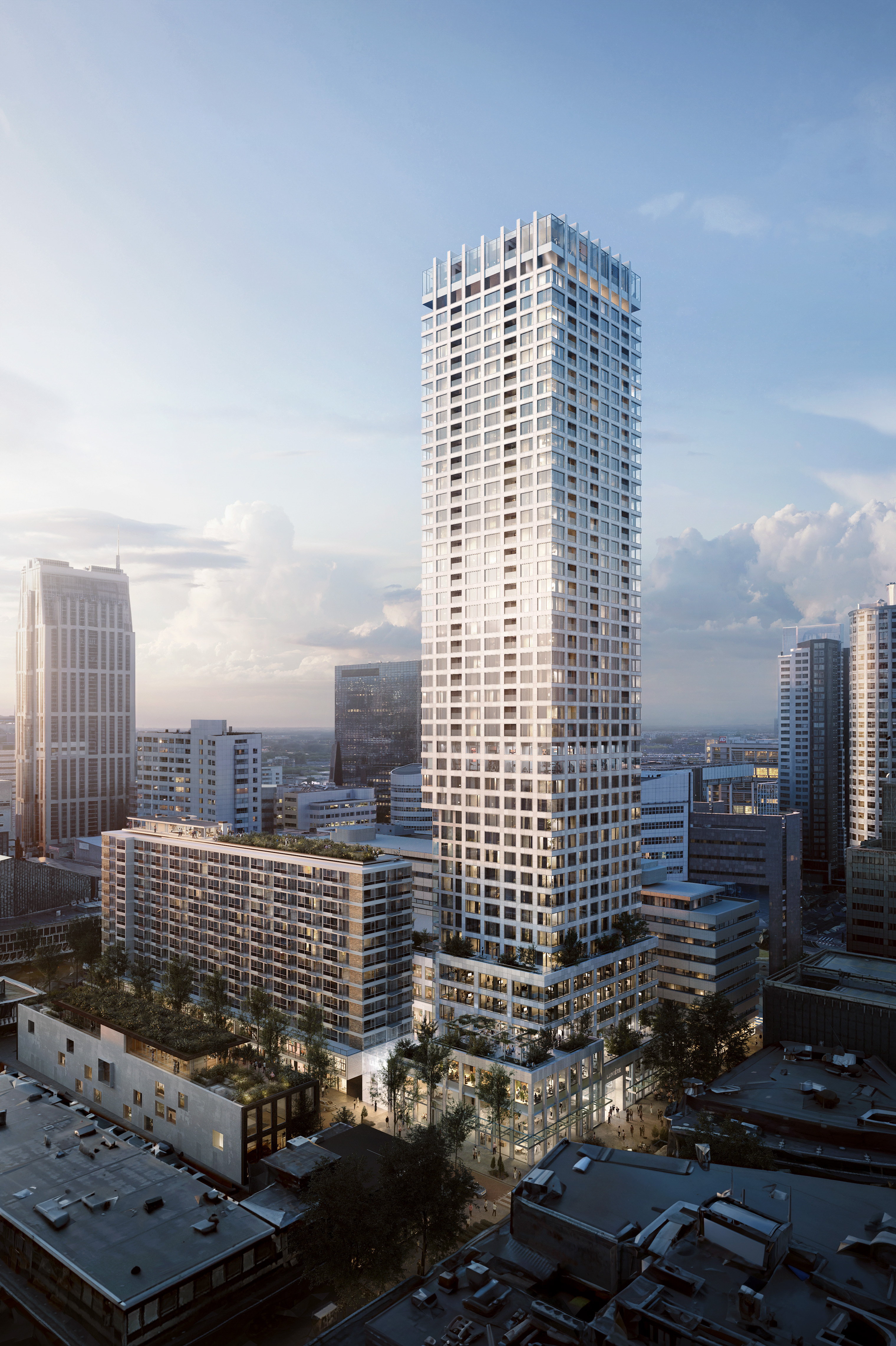 Lumière provides a qualitative impulse by combining 263 apartments, a hotel with 160 rooms, shopping, working, and recreation into one mixed-use project. Commercial functions and facilities occupy the ground floor, along with a large atrium at the foot of the tower leading to entrances of the hotel, offices, and apartments. The project transforms the current Lijnbaanhof into an intimate yet lively passage with workspaces, a cafeteria, and other amenities. Green accessible terraces with seating areas and various nesting facilities run along the courtyard and up the tower via the setbacks, embedding the project in the natural environment of Rotterdam.