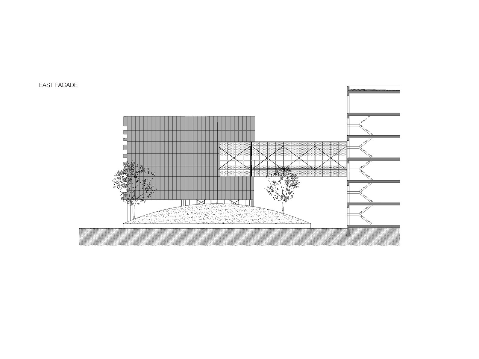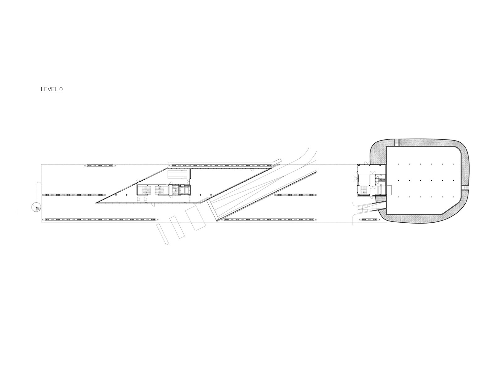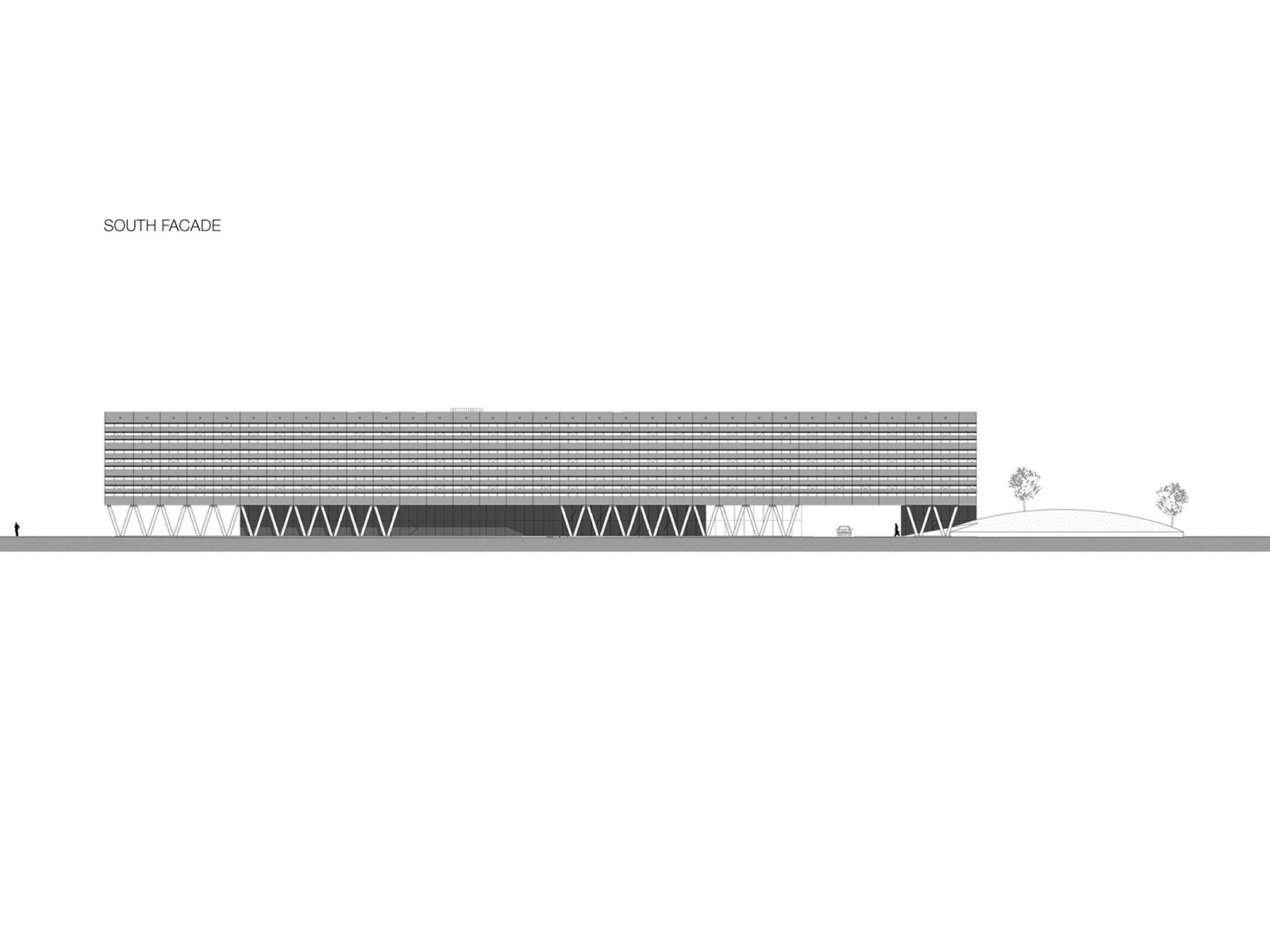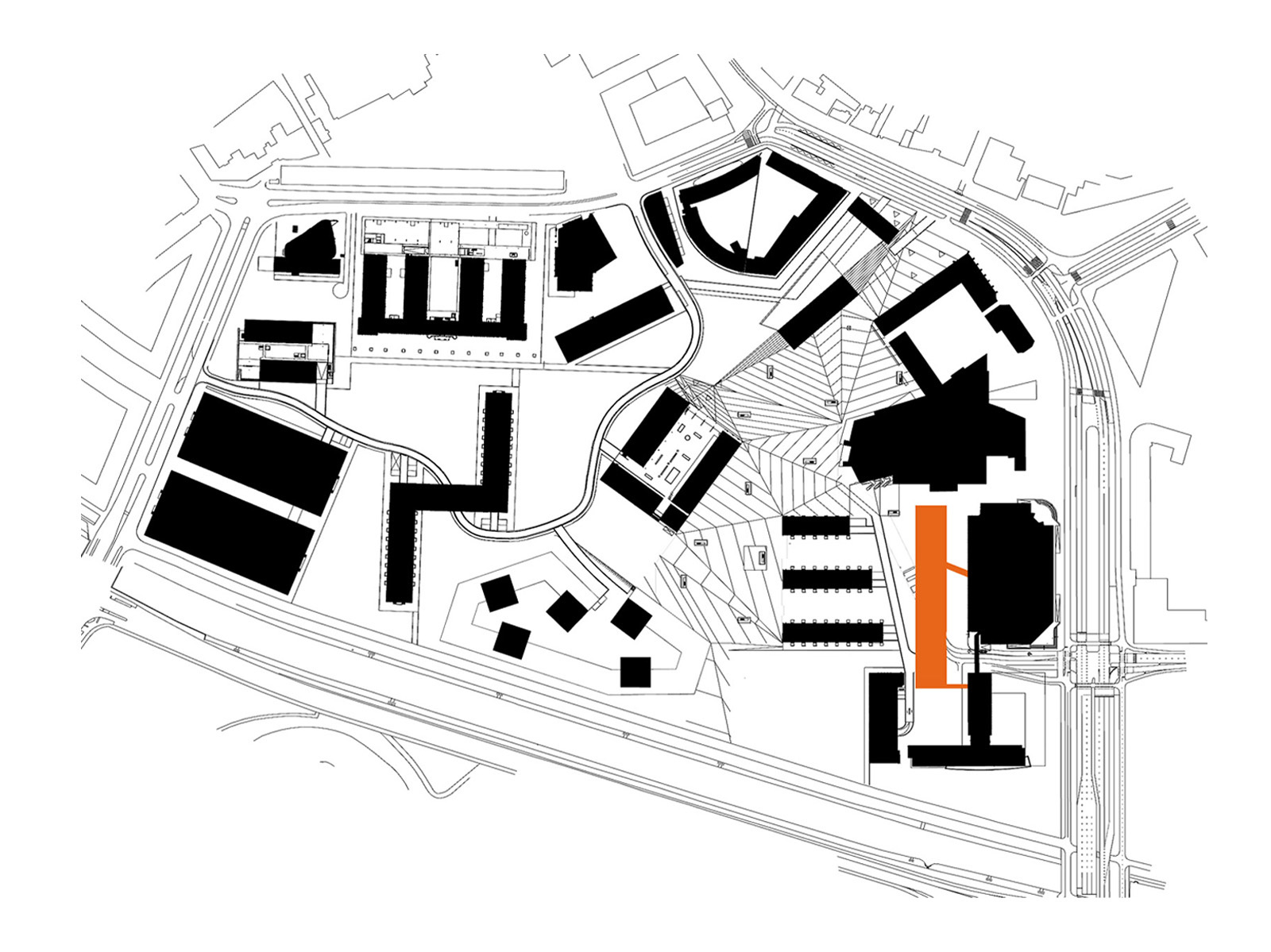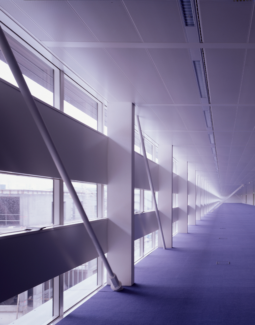 The Municipal Offices are part of the development of the Chassé Terrain master plan in Breda. The programme, of office spaces, and the envelope, a long structure hovering over a logistics area, were already set out. The rectangular volume served as a starting point, with an interior central corridor that separated one and two-desk offices on one side from large communal office spaces on the other.