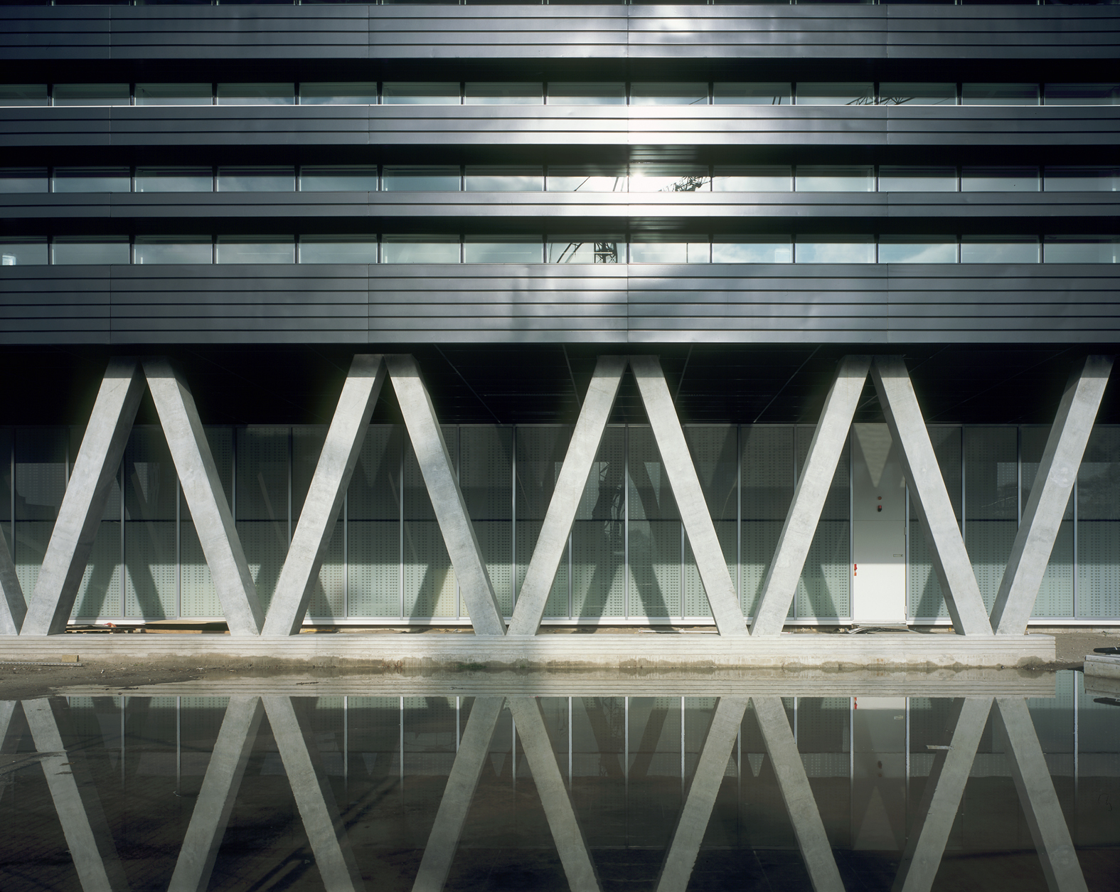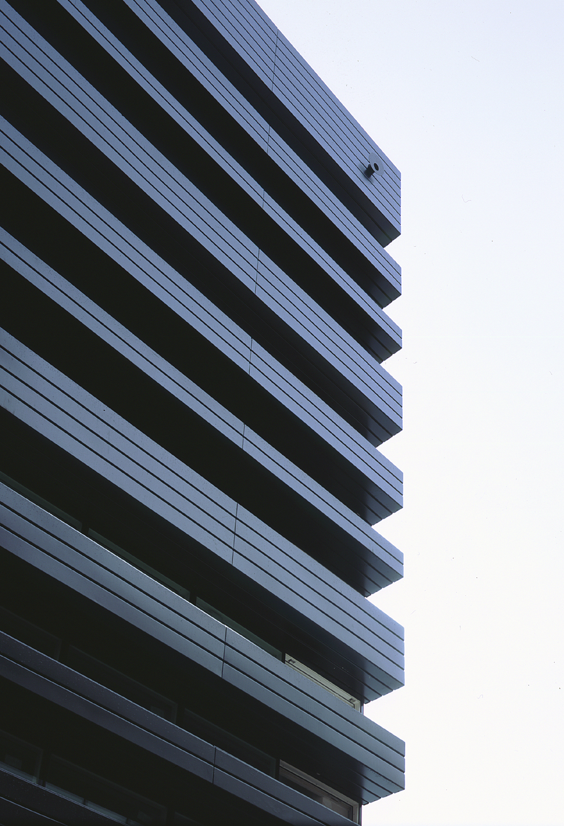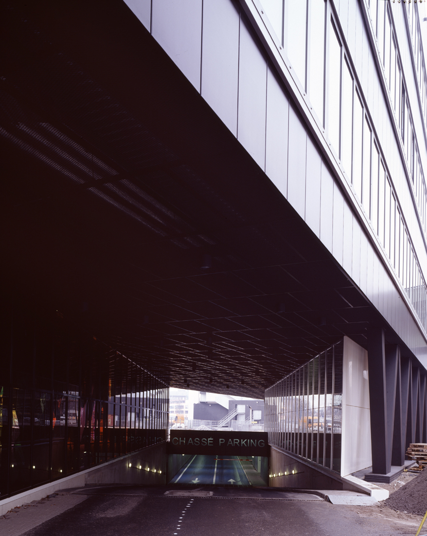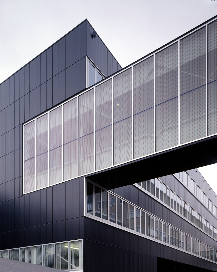 The horizontal emphasis gives the building presence, and also functions as a diagonal roof cover for the entrance to the underground car park. The south façade consists of alternating strips of steel and glass. The north façade has large windows which become slightly smaller per storey, responding to the amount of ambient light higher up. At night, frosted glass volumes beneath the building illuminate the foundation of the building, giving the appearance of a black box atop a light and open base.