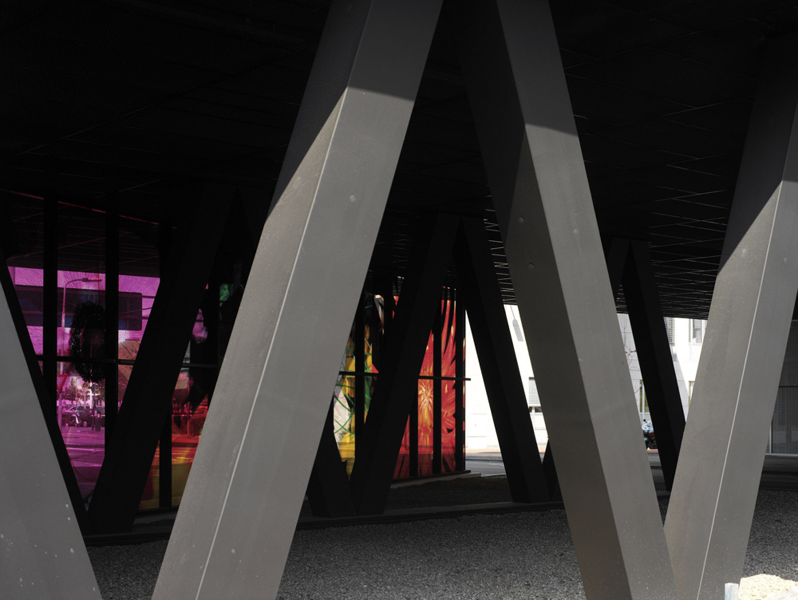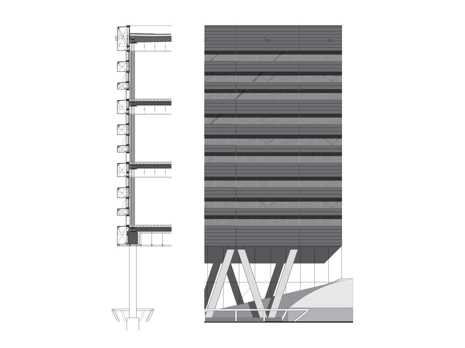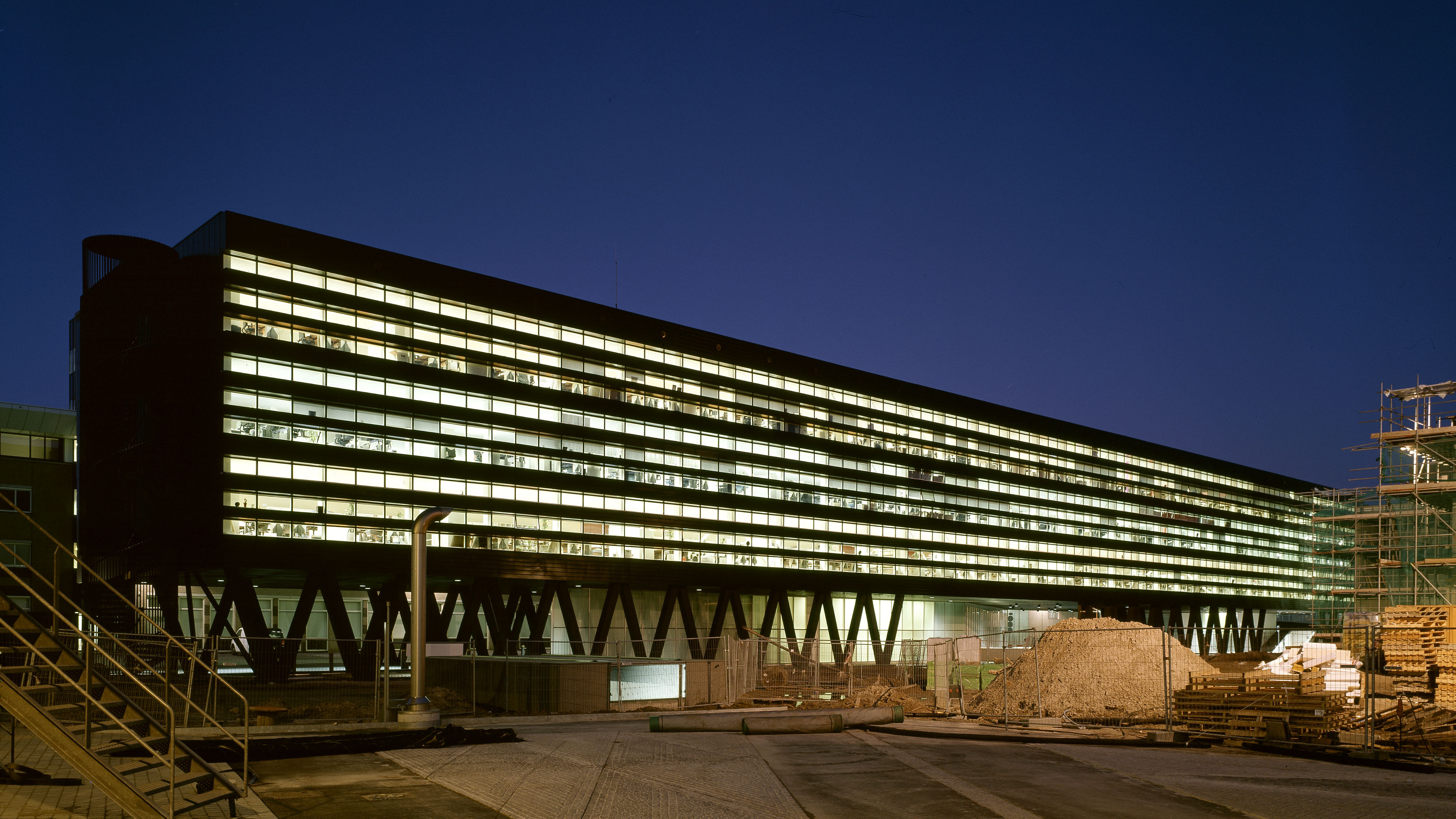 The horizontal emphasis gives the building presence, and also functions as a diagonal roof cover for the entrance to the underground car park. The south façade consists of alternating strips of steel and glass. The north façade has large windows which become slightly smaller per storey, responding to the amount of ambient light higher up. At night, frosted glass volumes beneath the building illuminate the foundation of the building, giving the appearance of a black box atop a light and open base.