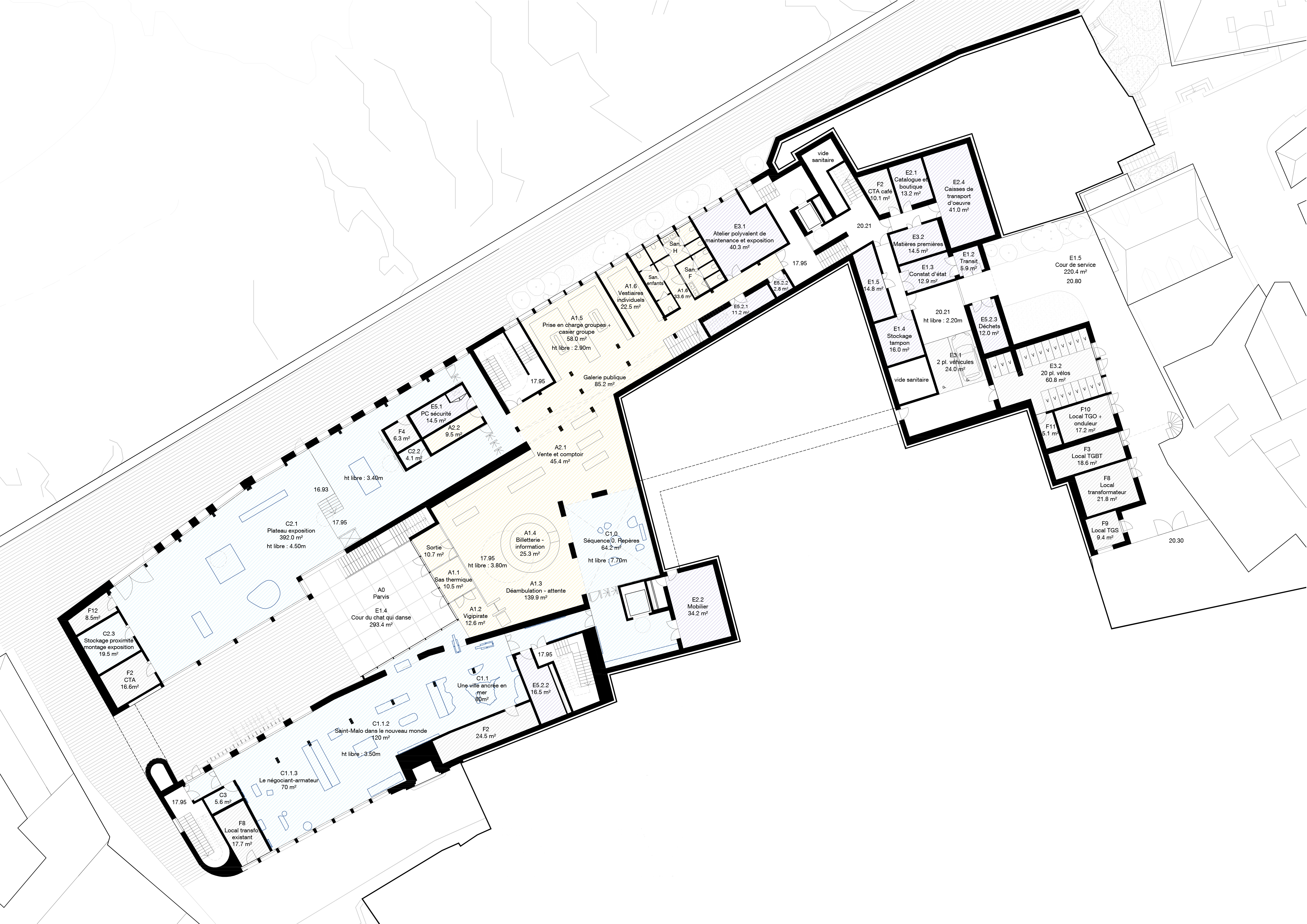 A continuous path guides visitors from the ramparts to a generous entrance, inviting them into an immersive journey through the city’s maritime heritage. The layout is designed to enhance accessibility and flow, ensuring a clear and engaging experience. At its highest point, an elevated platform provides a new vantage point over the bay, offering shifting perspectives of the tides and the horizon—reinforcing Saint-Malo’s deep-rooted connection to seafaring and exploration.