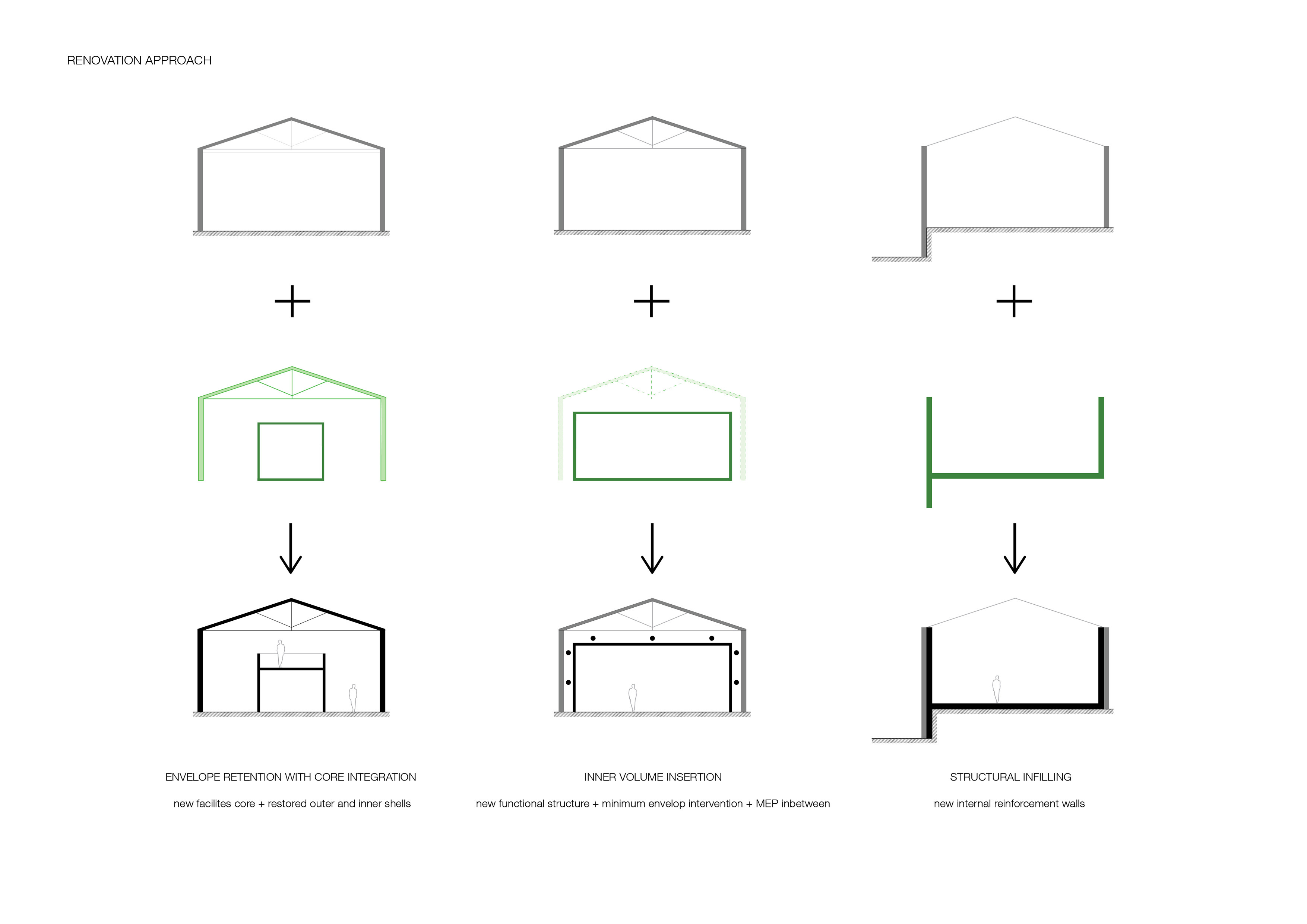 Three main approaches guide preservation and reuse: “ Inner volume insertion” introduces a new functional structure within the existing shell, allowing minimal interference with the exterior while reorganising the interior. “Envelope retention with core integration” restores both outer and inner facades and incorporates a new internal core to meet modern needs without compromising the building’s appearance, and the “Structural infilling” adds carefully designed elements that support and reinforce the existing structure, responding to its unique geometry and condition.