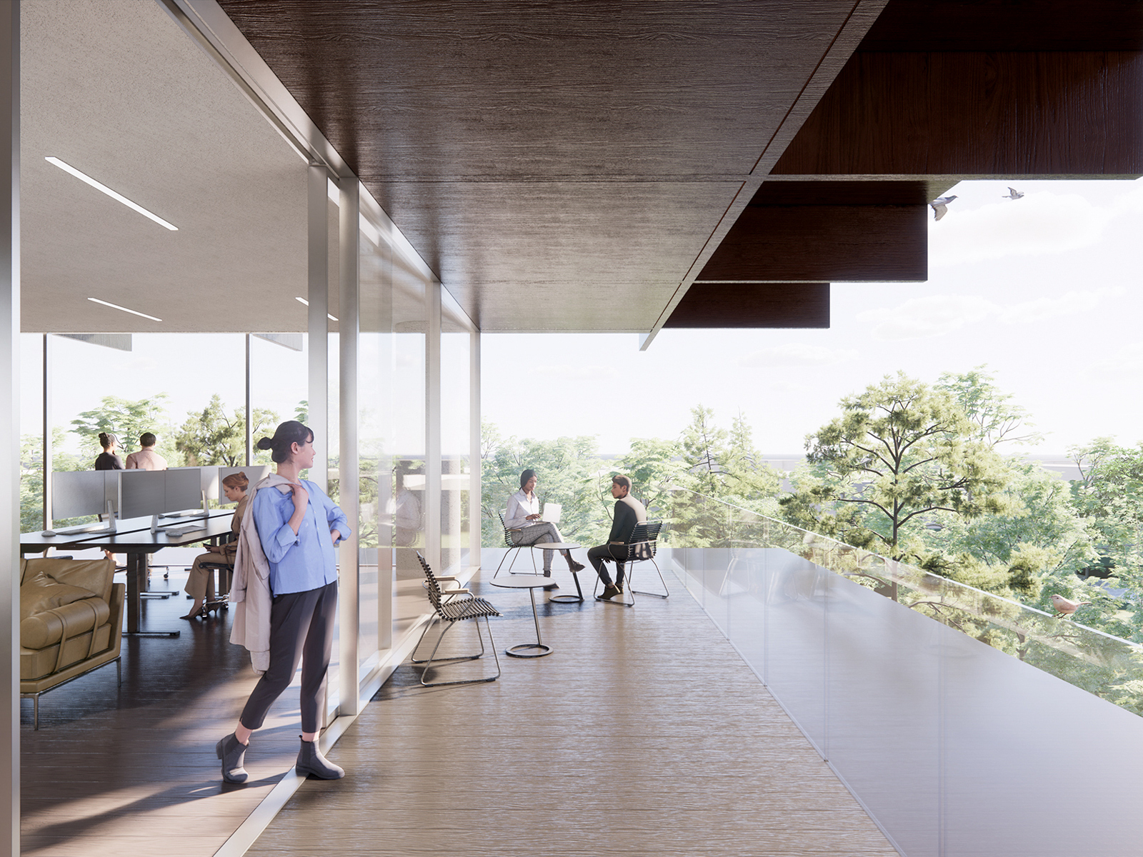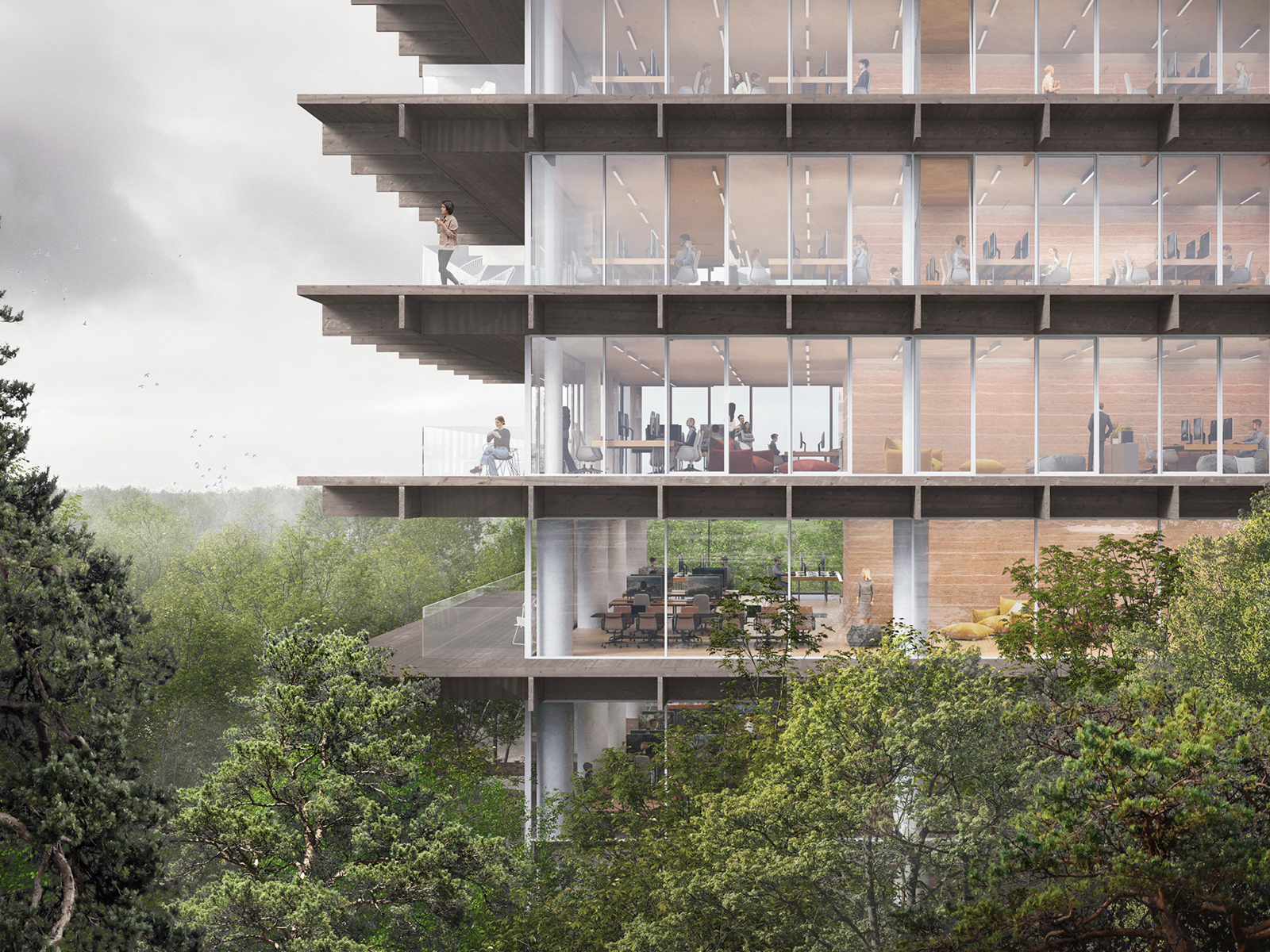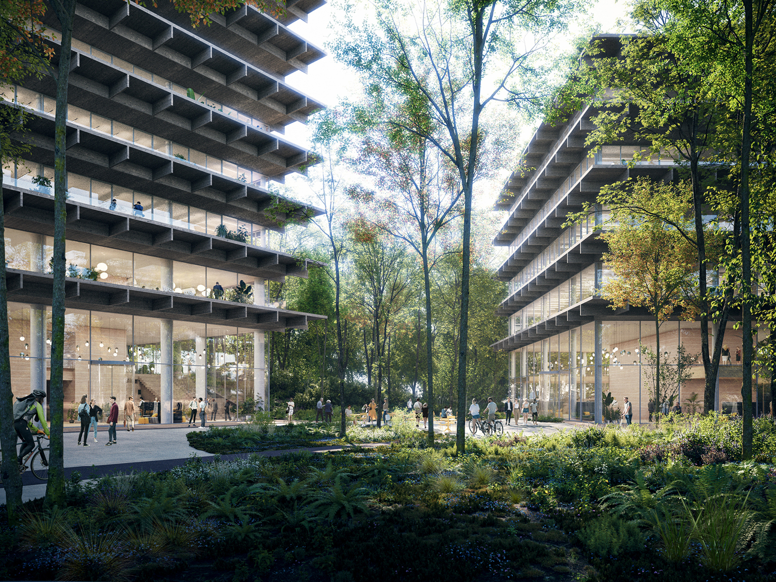 The master plan for the Poort project places great emphasis on integrating with the surrounding landscape. The three buildings are nestled in the green landscape and converge around a captivating land art installation, Het Karrenspoor by Paul de Kort. The lush landscape serves as a natural carbon sink. The Poort ensemble stands out with its predominantly transparent design of floor-to-ceiling glass facades and wooden galleries. The dark-stained oak cantilevers extend further on the sun-facing sides, serving as both terraces and structural sun protection. Slender columns and central circulation cores ensure unobstructed views on all floors and allow for future adaptability. The ground floors feature spacious double-height halls that serve as meeting areas and entry points, fostering interaction among occupants through open sightlines and interconnected spaces. Each building incorporates underground parking facilities on two levels.
