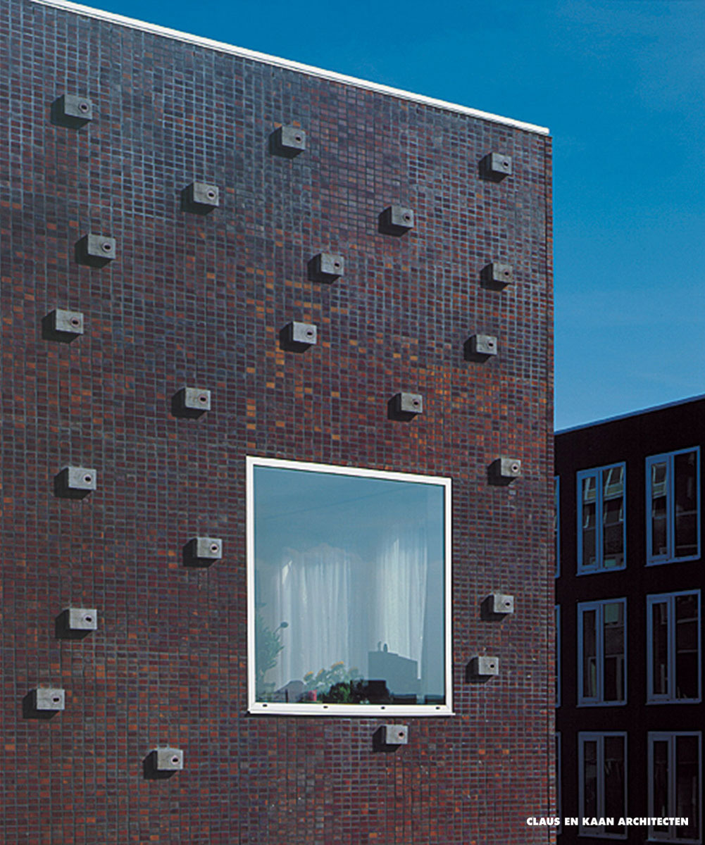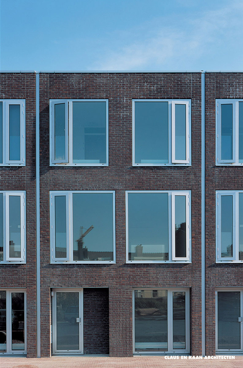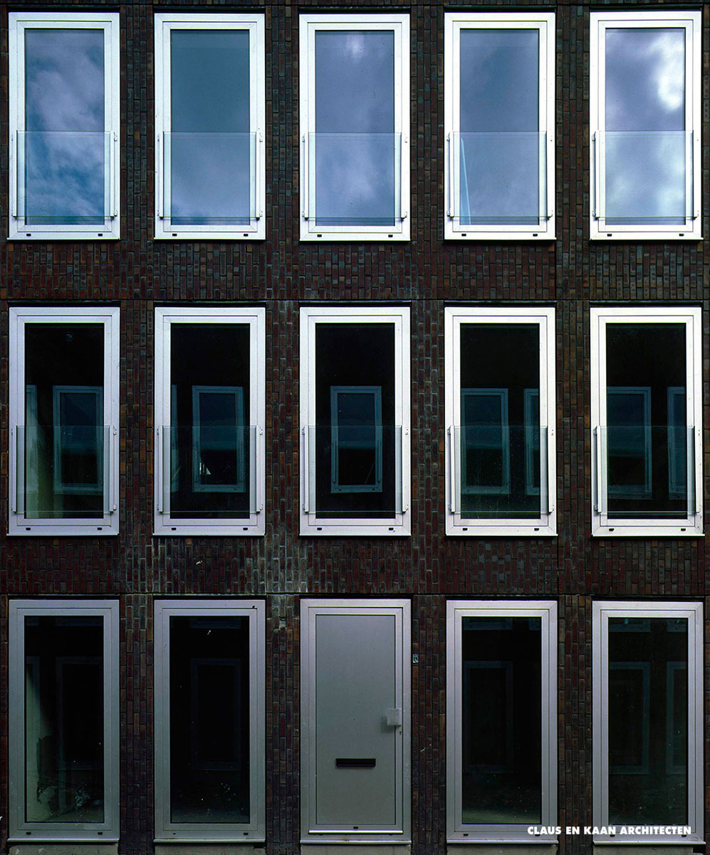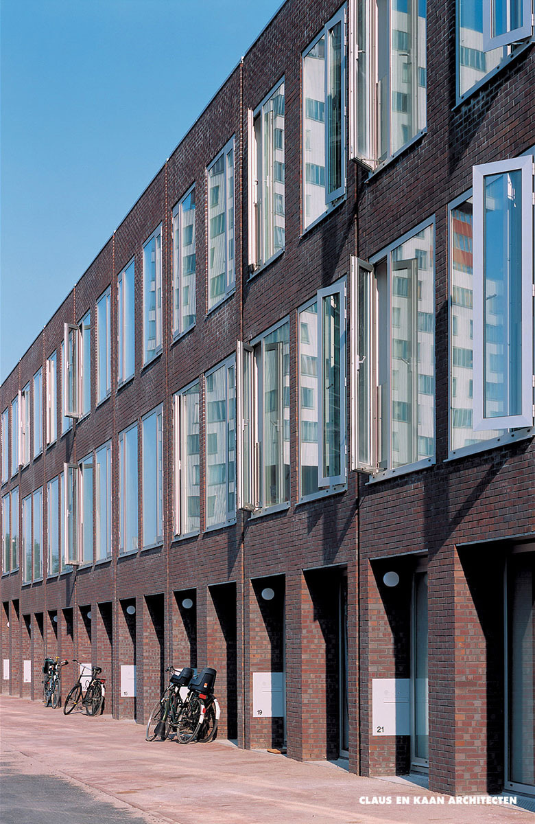 Rietlanden, part of the Borneo Sporenburg urban development plan, is an urban microcosm. The architecture is remarkably varied, with different types of apartments offering a range of residential categories at various price points. Dwellings are arranged in three blocks and organized in two rows. The glass and the aluminium frame of the windows, which stand out prominently from the surface of the façade, define the overall aesthetic. The large glass surfaces establish a direct relationship between the homes and the street.