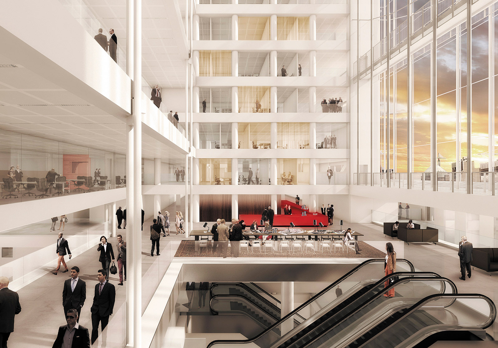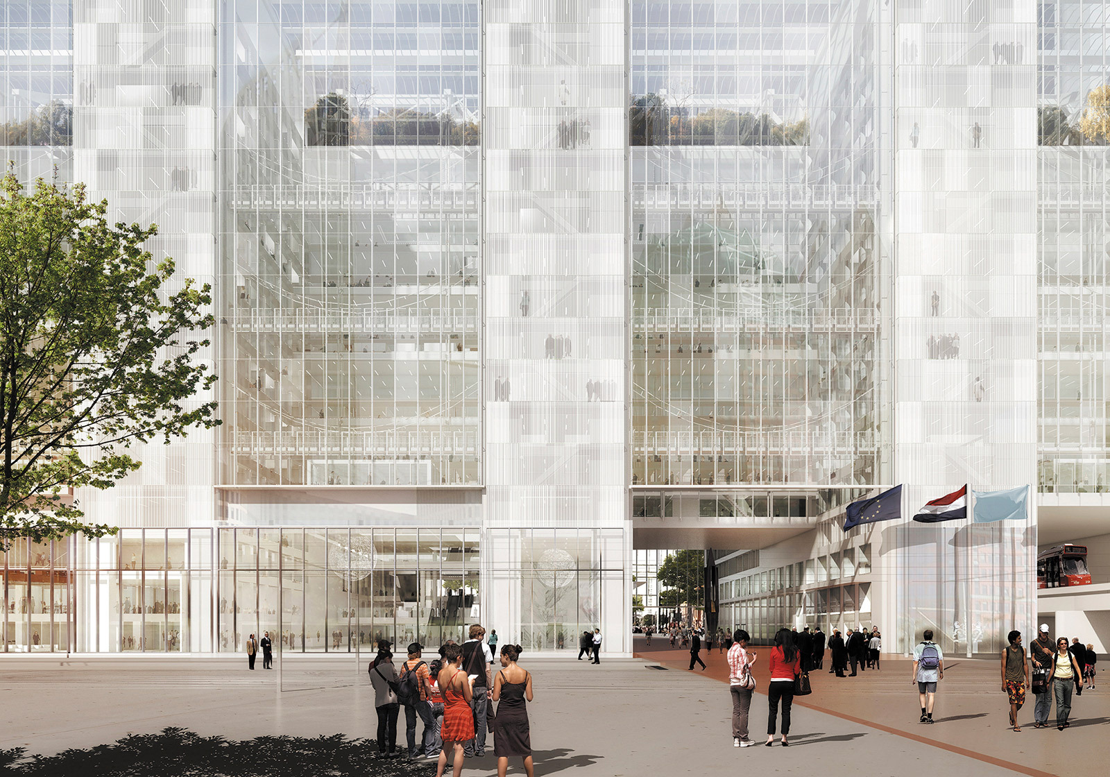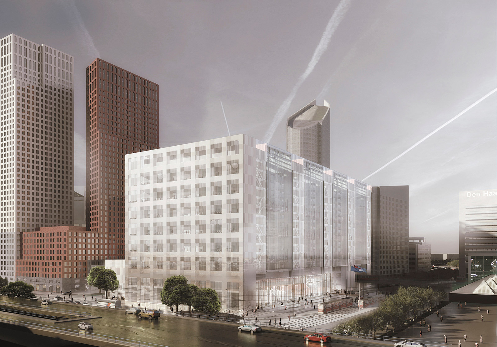 Positioned at an urban entry point to the city, the building defines the experience of arriving in The Hague. Inside, the eye-catching lobby creates a welcoming ambience. Congress facilities and cafés enliven the four lower levels with a sequence of public interiors. The upper levels are more private offices with comfortable and spacious, high-ceiling work areas with natural light and views out over the city.
