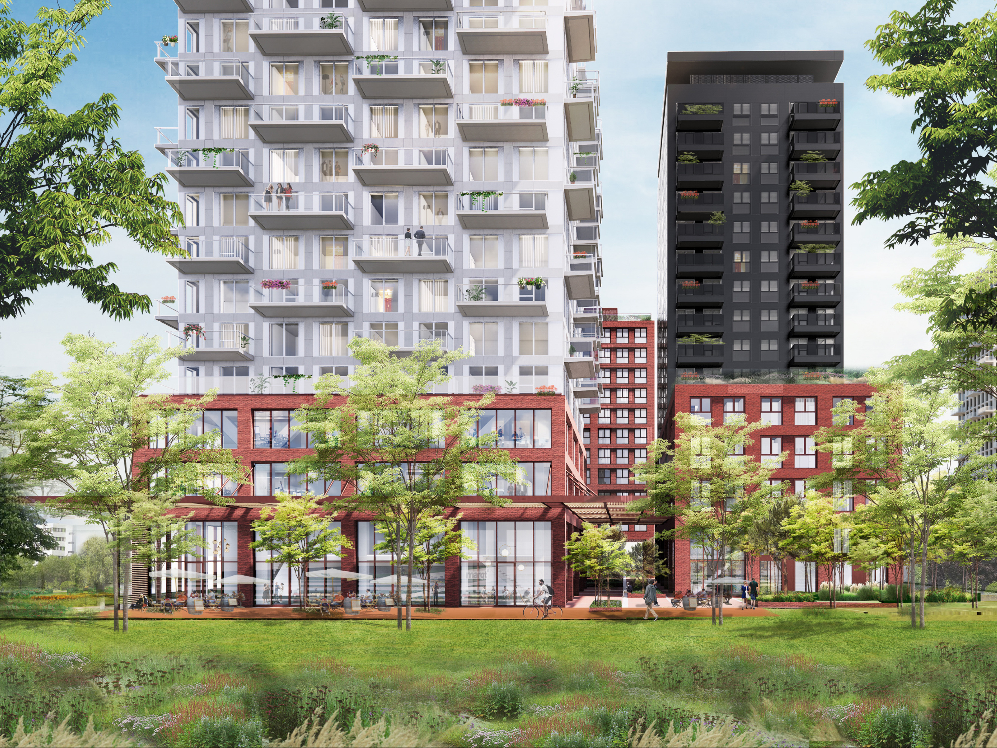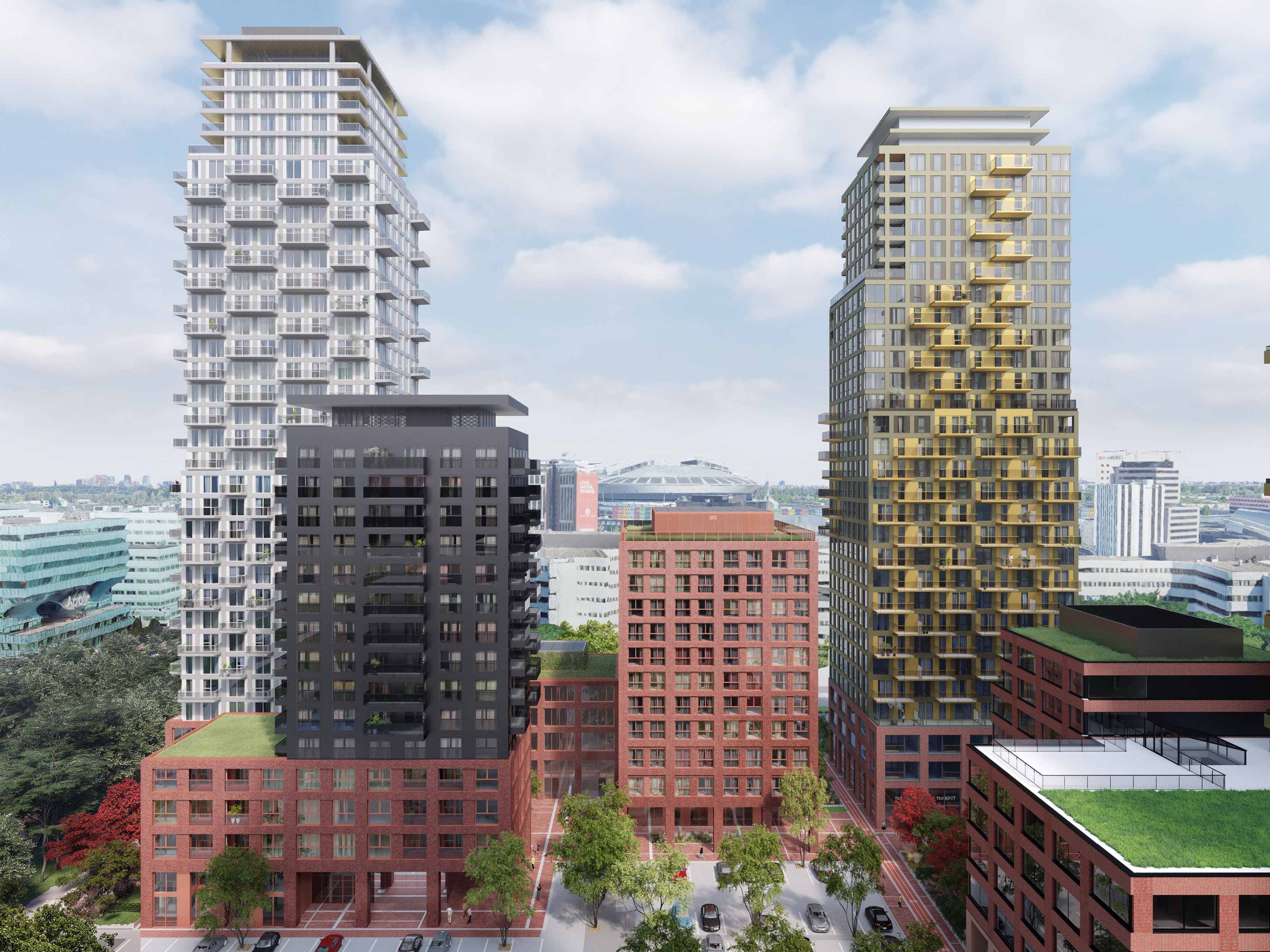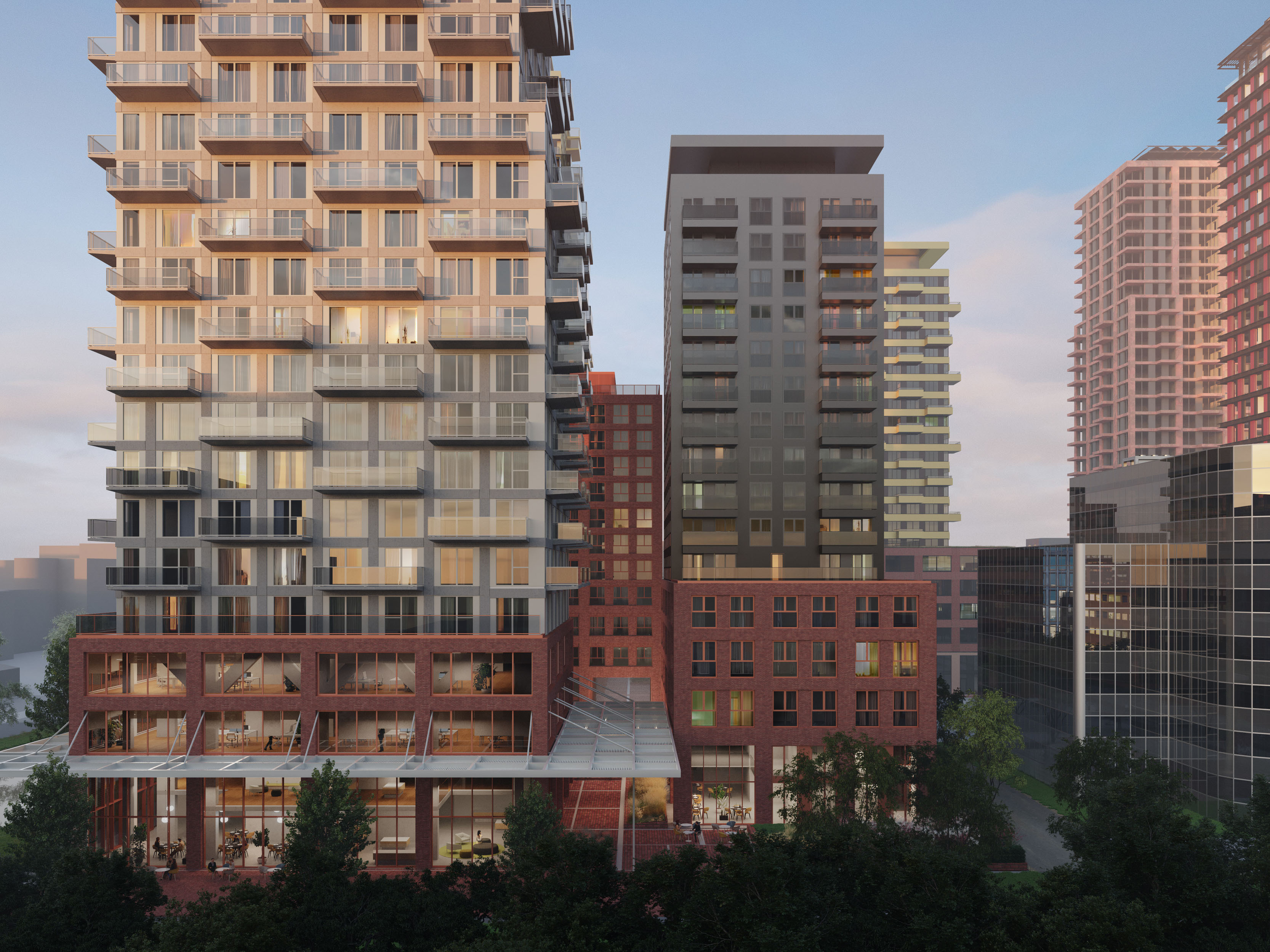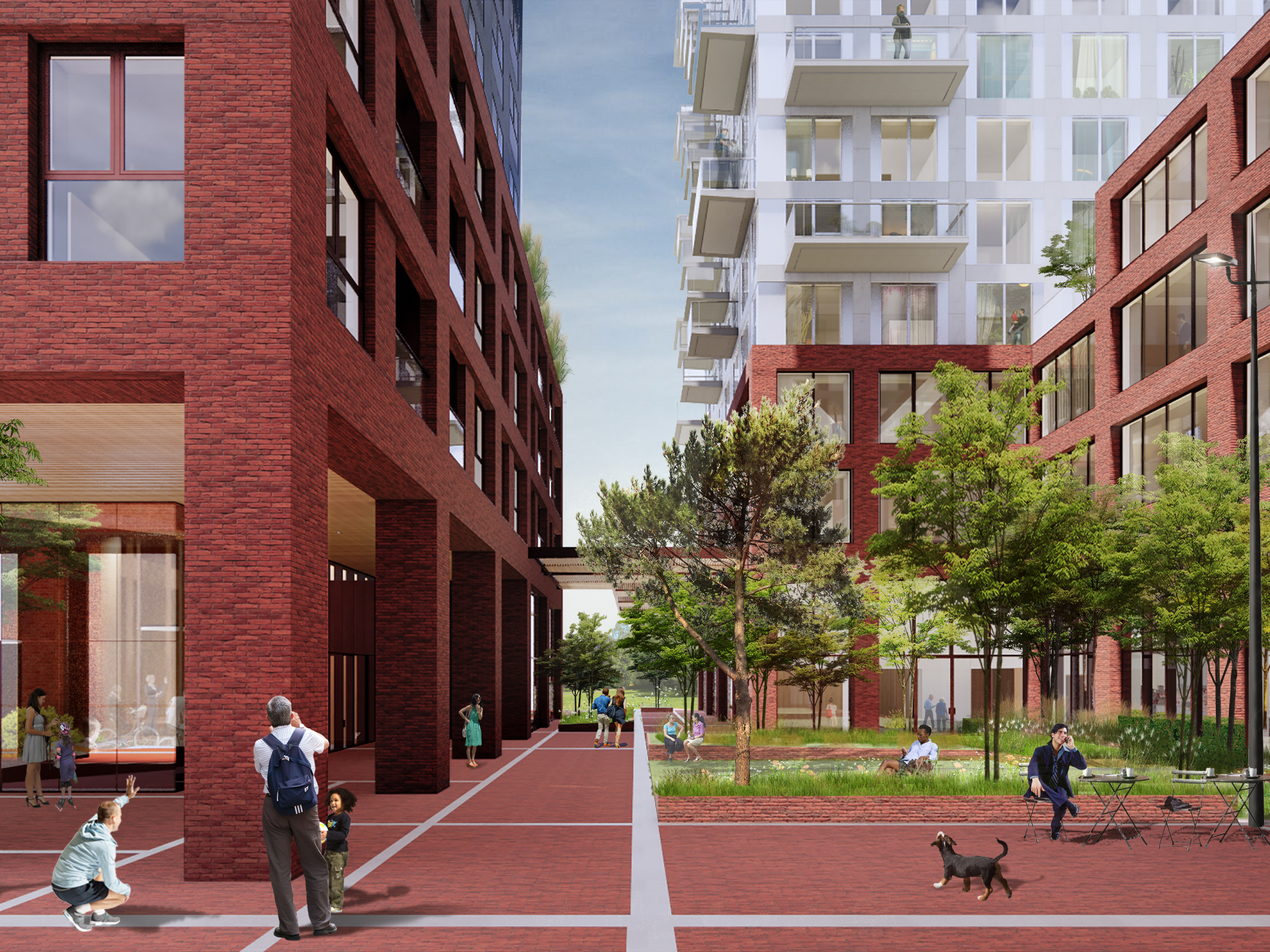 The SPOT project redevelops Hogehilweg in Amsterdam-Zuidoost. The design transforms the area, previously occupied by office blocks from the 80s, into a cosmopolitan part of the city. The redesign establishes different atmospheres simultaneously, creating both an intimate inner-city environment and an expanding metropolis, the village and the city in one.