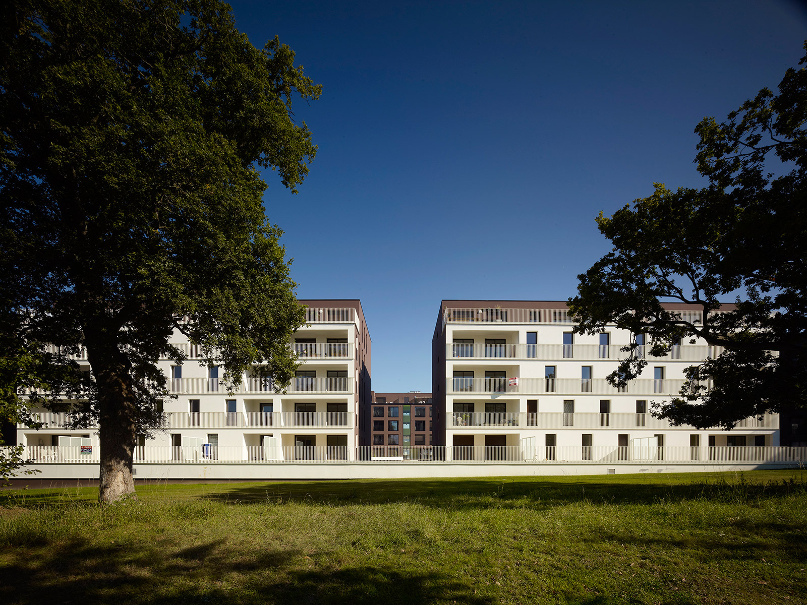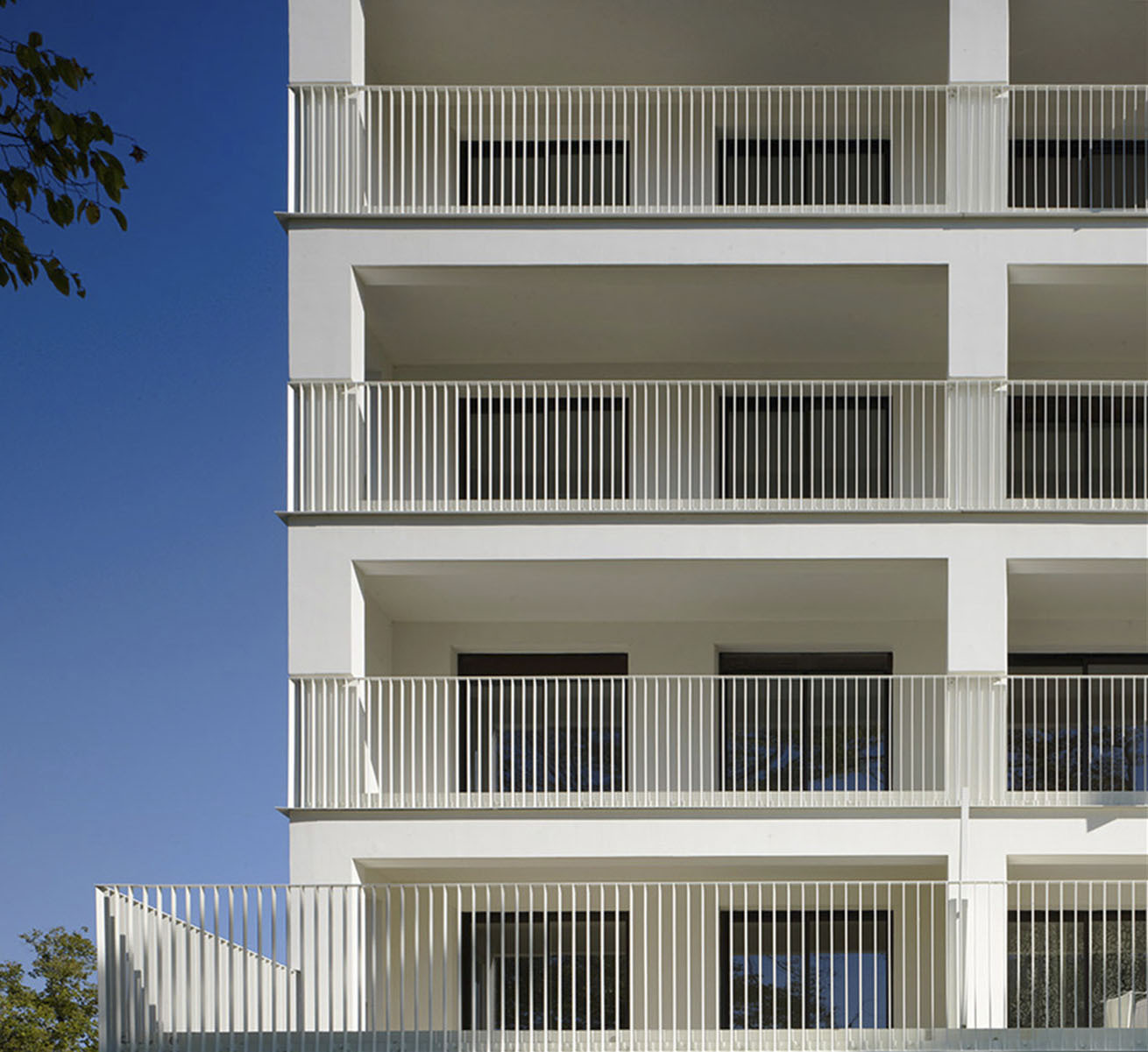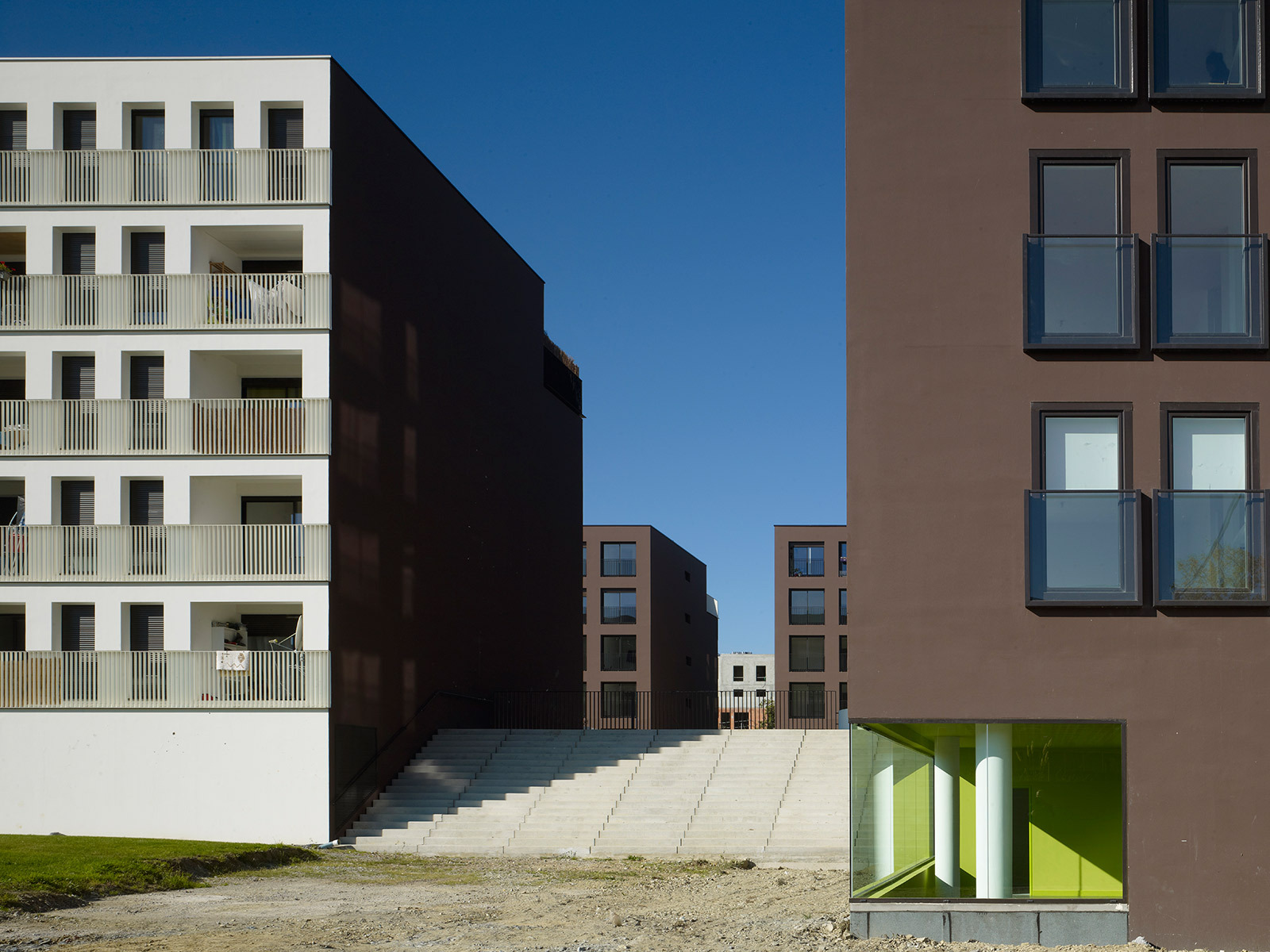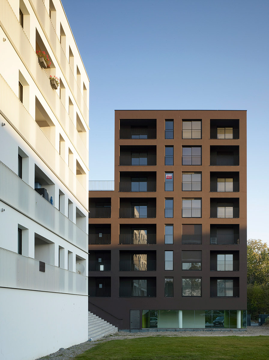 The project aligns itself with the main axes through the neighbourhood, which facilitates a beneficial exchange between the public and private spaces. The white facades of the buildings on the street side help to integrate the development into the area. Metal balustrades, a particularly French feature, strictly adhere to the lines of the concrete structure, ensuring the unity of the design as a whole and providing a dynamic grandeur and expressivity. The brown façades of the islands have a more domestic character and assert their difference and originality through colour contrast, creating legible individual dwellings on the courtyard side.