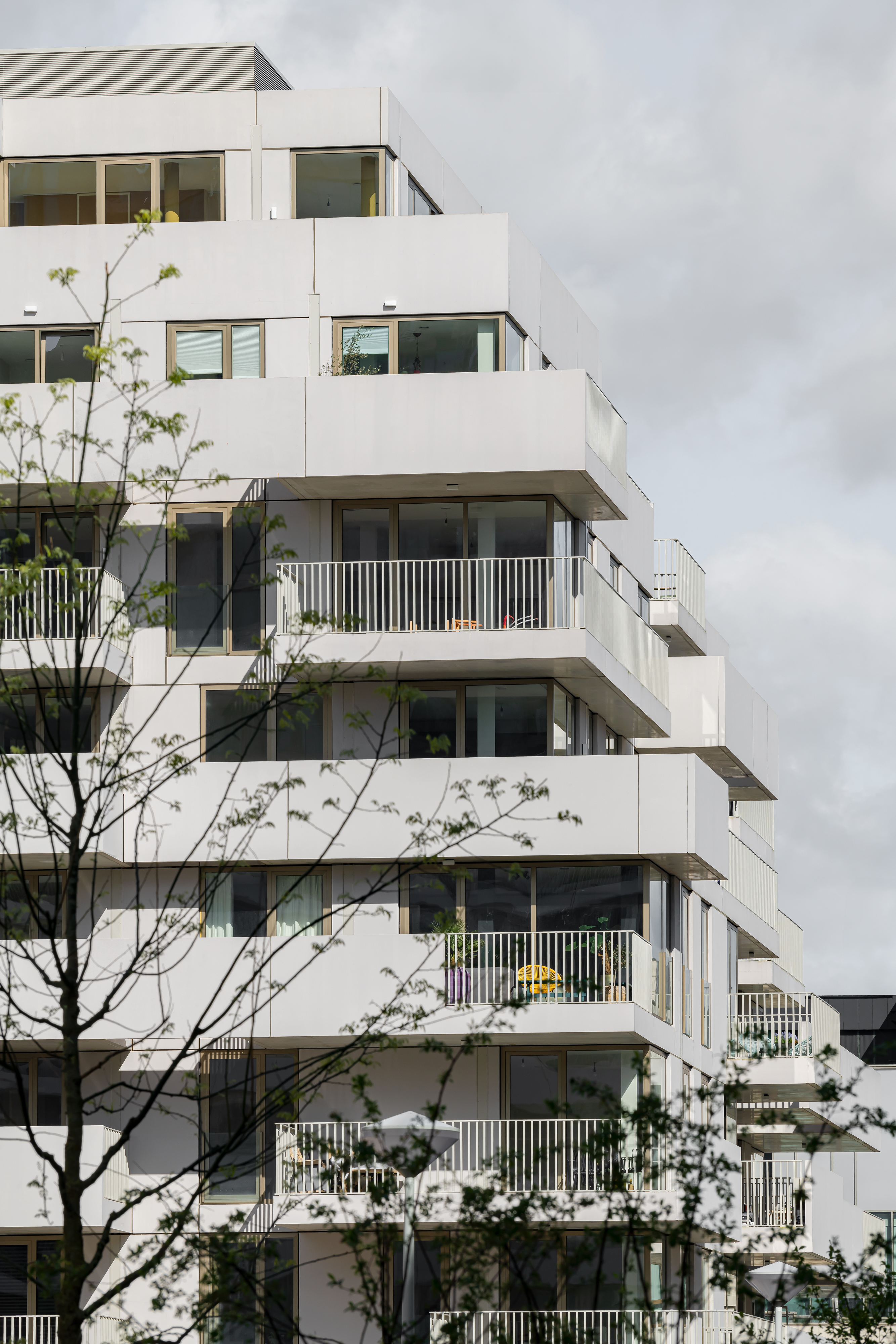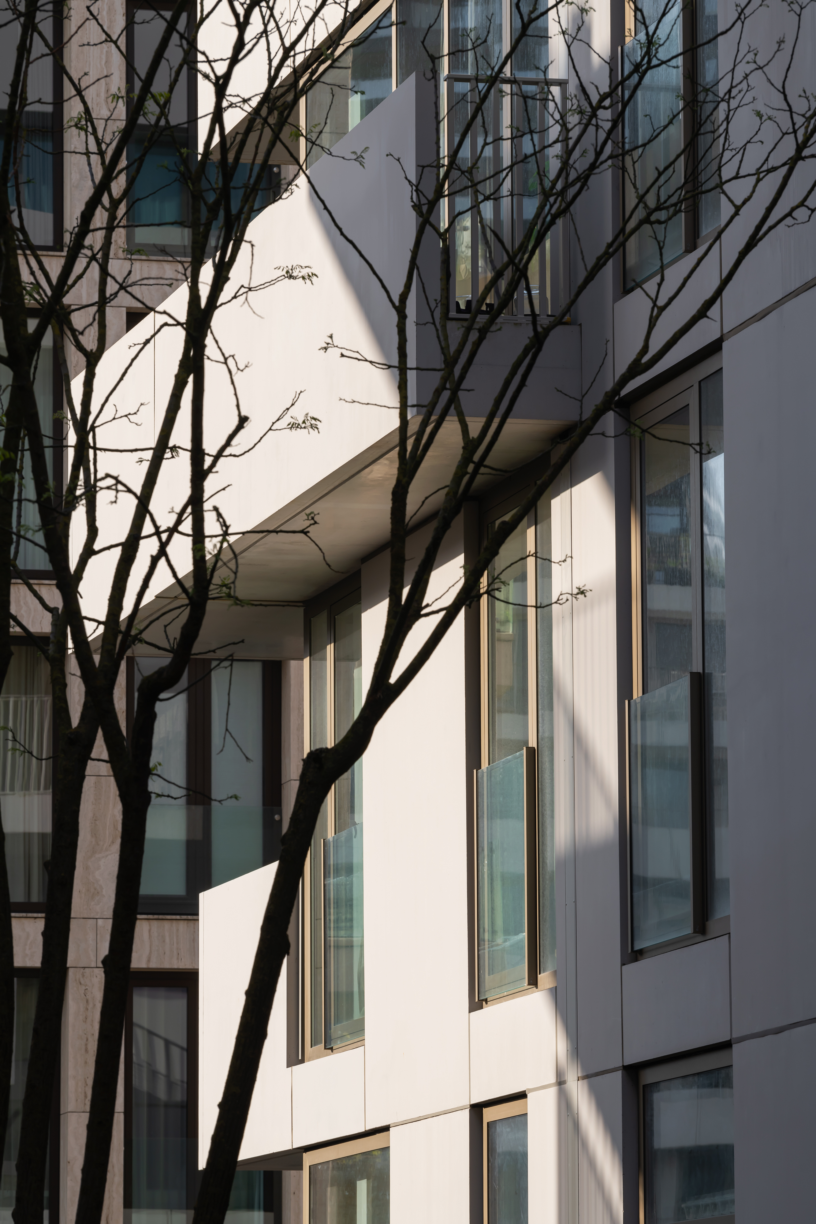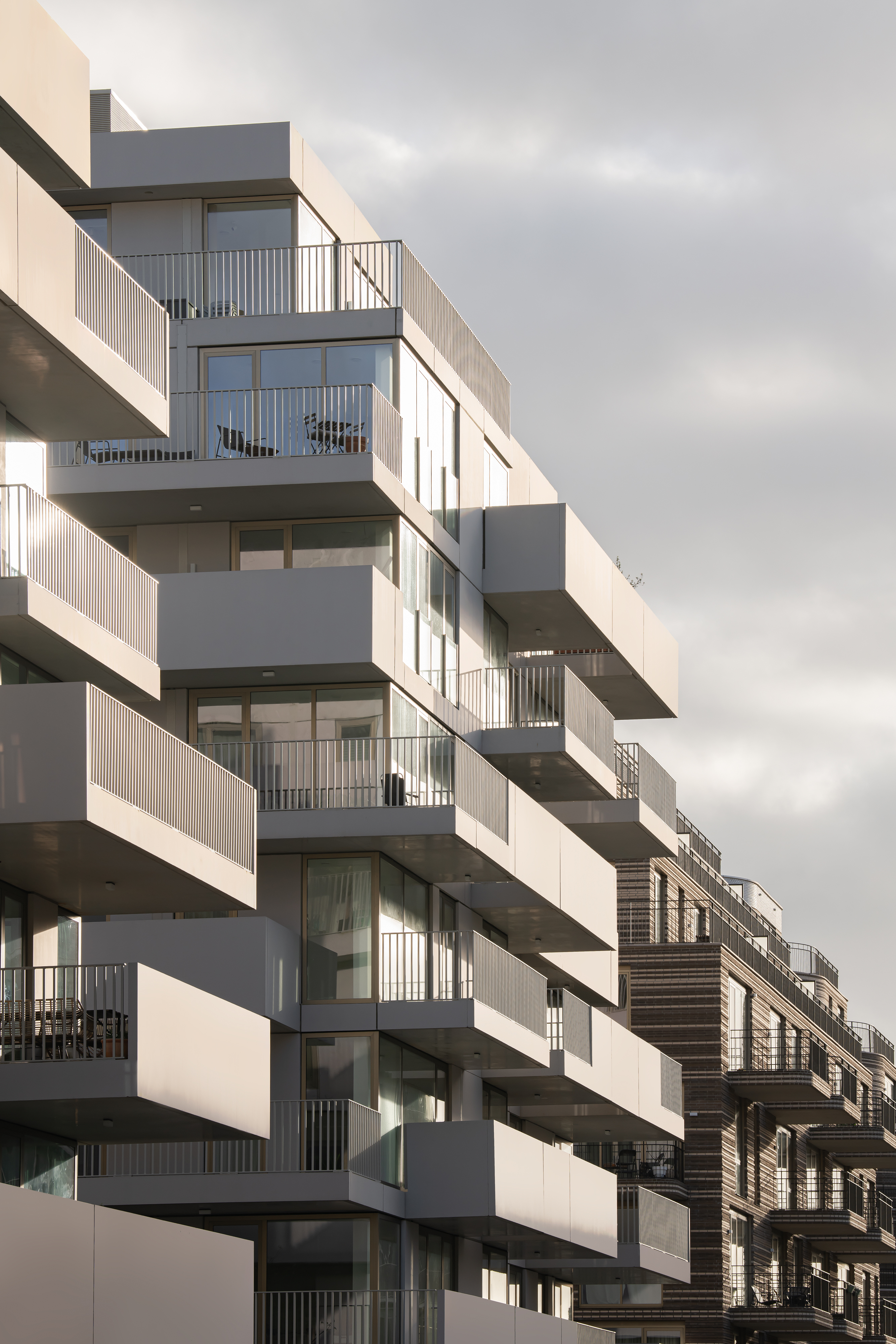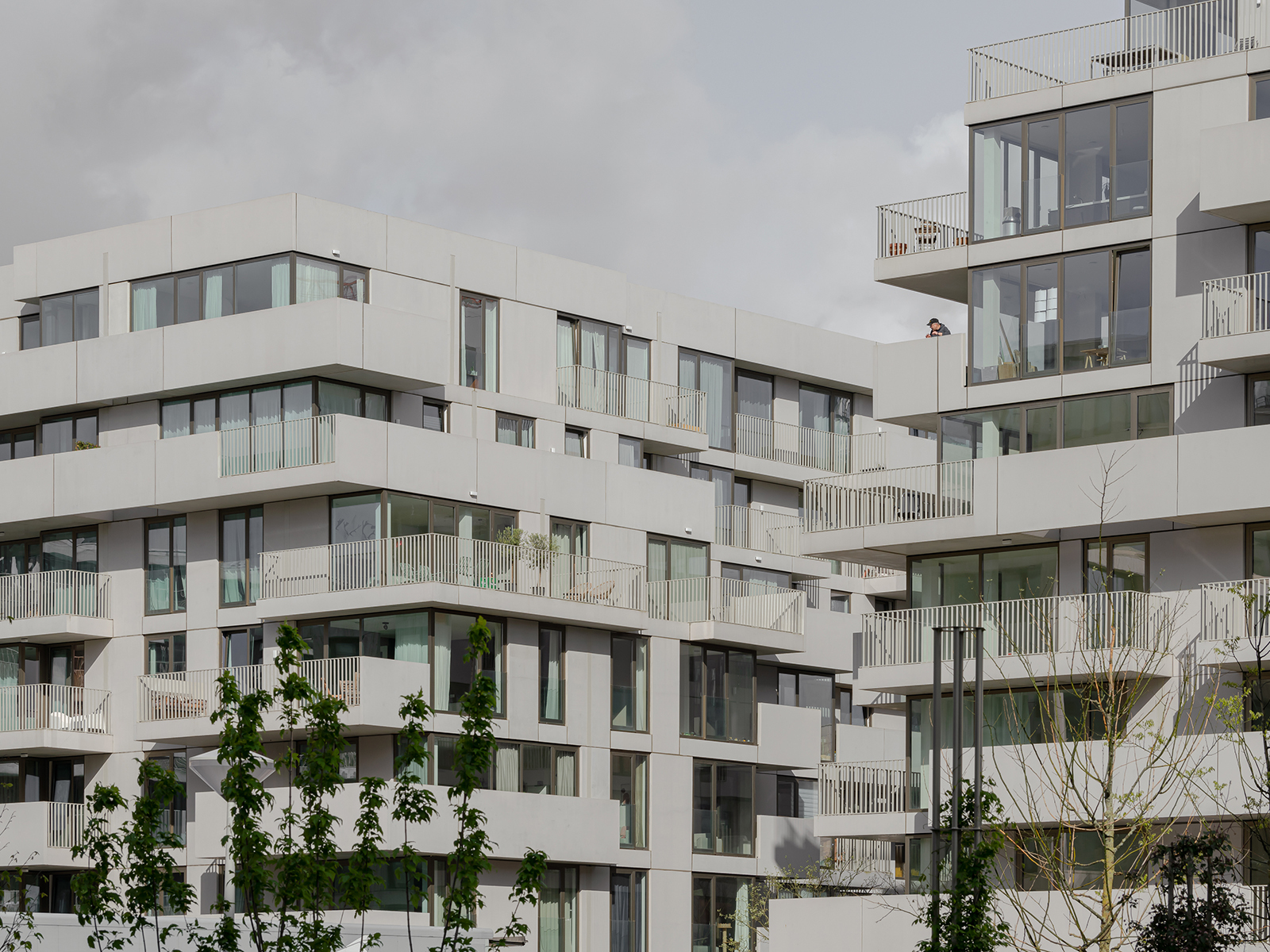 Although different, both blocks share a coherent visual identity. Light grey concrete is the unifying element for the façade panels, balcony slabs and balustrades. Using the same colour palette for the metal railings at the openings contributes to the continuity and sophistication of the complex.