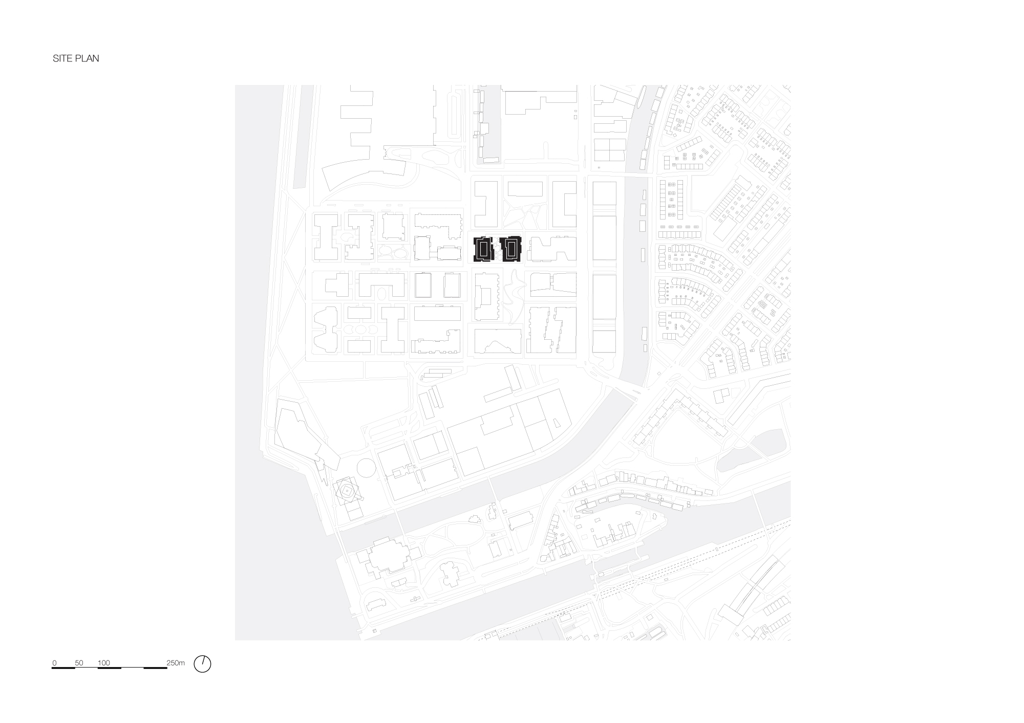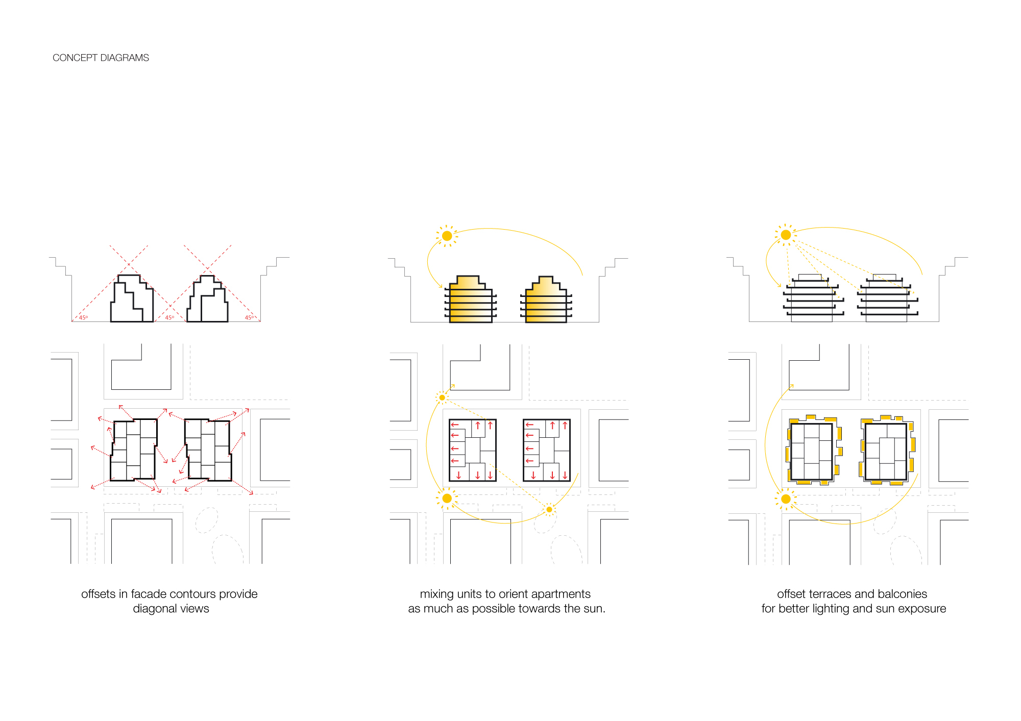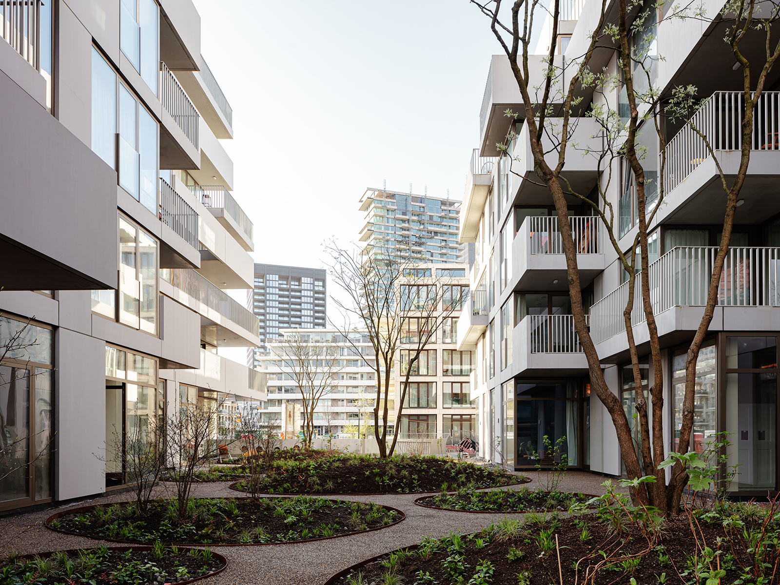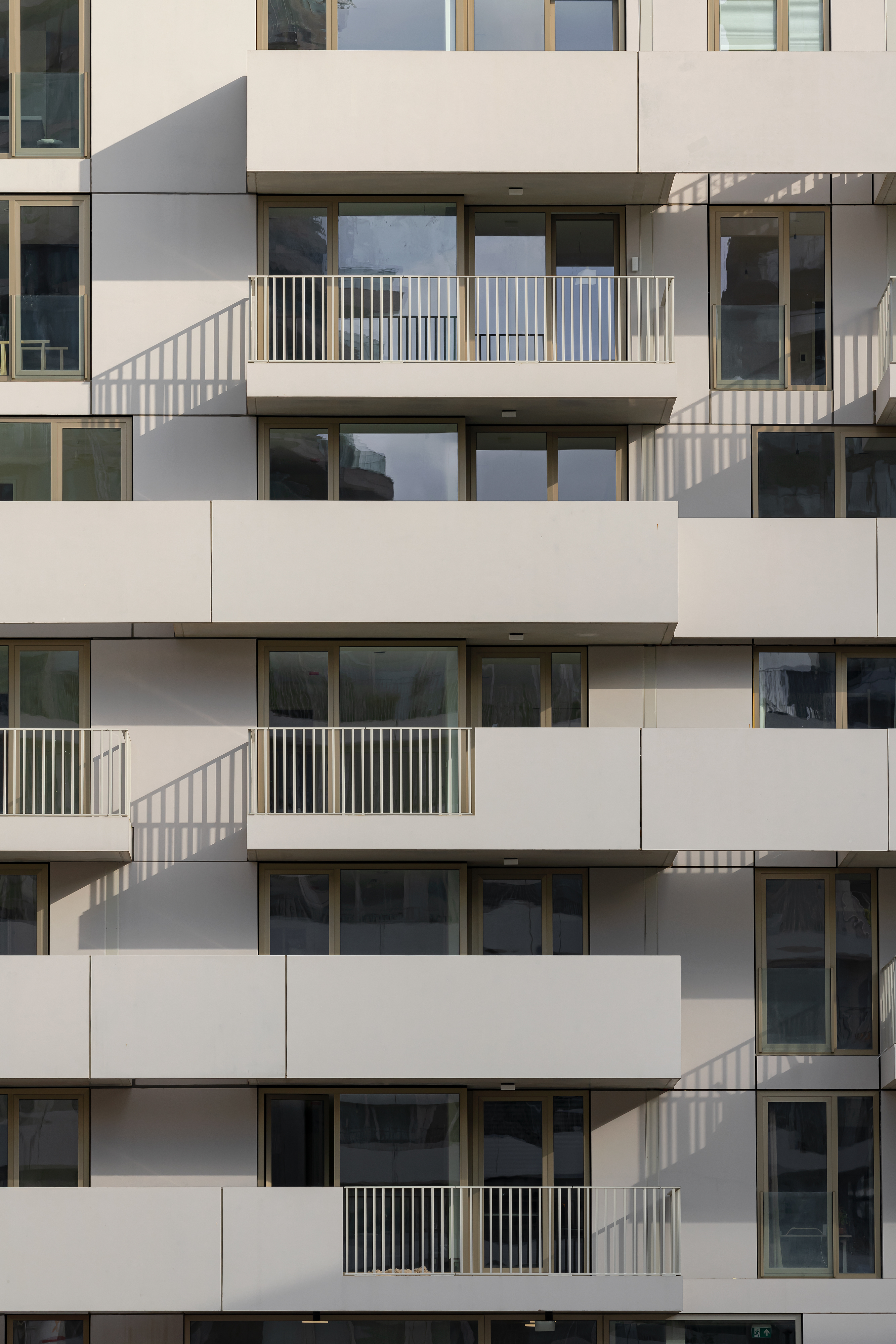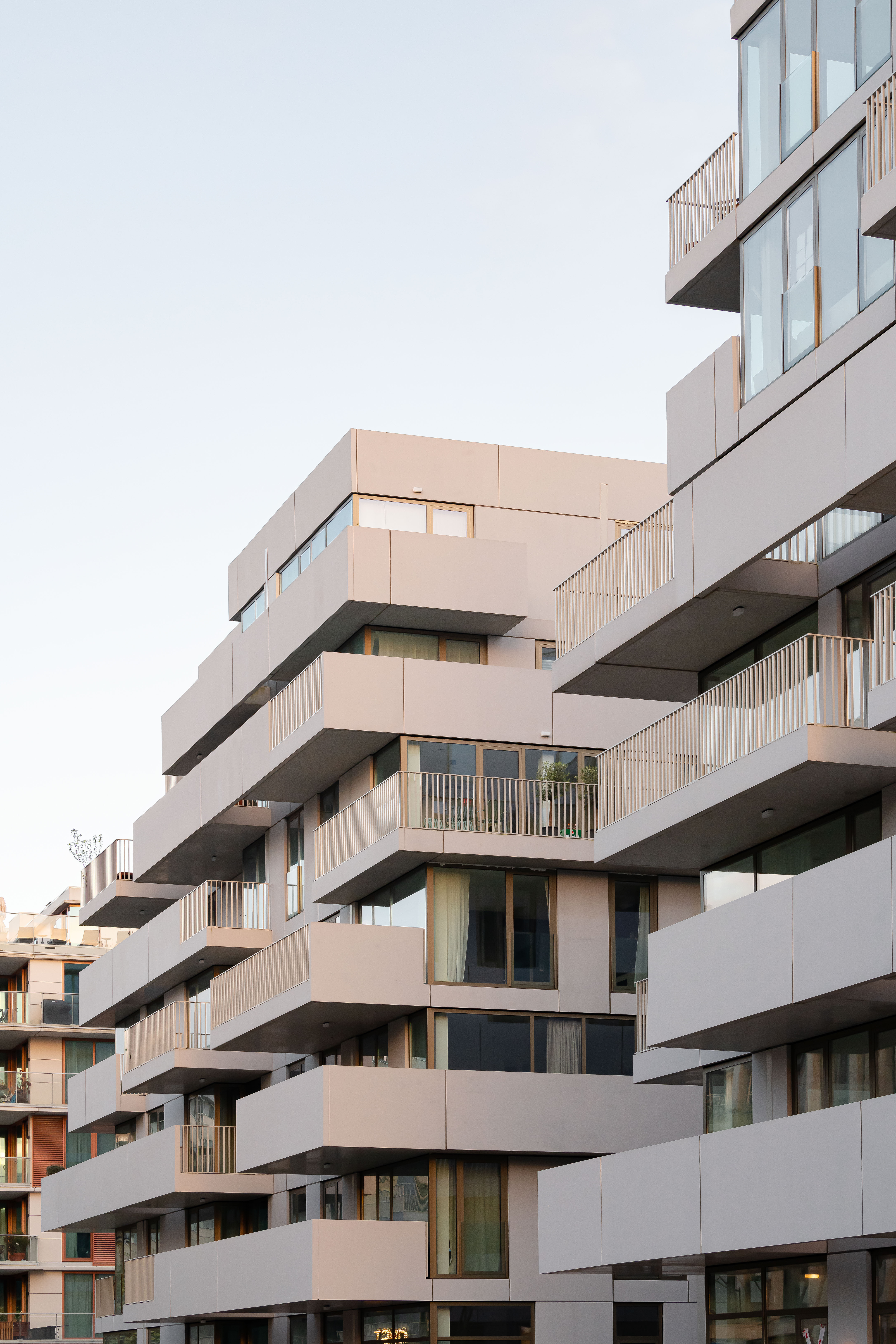Although different, both blocks share a coherent visual identity. Light grey concrete is the unifying element for the façade panels, balcony slabs and balustrades. Using the same colour palette for the metal railings at the openings contributes to the continuity and sophistication of the complex.