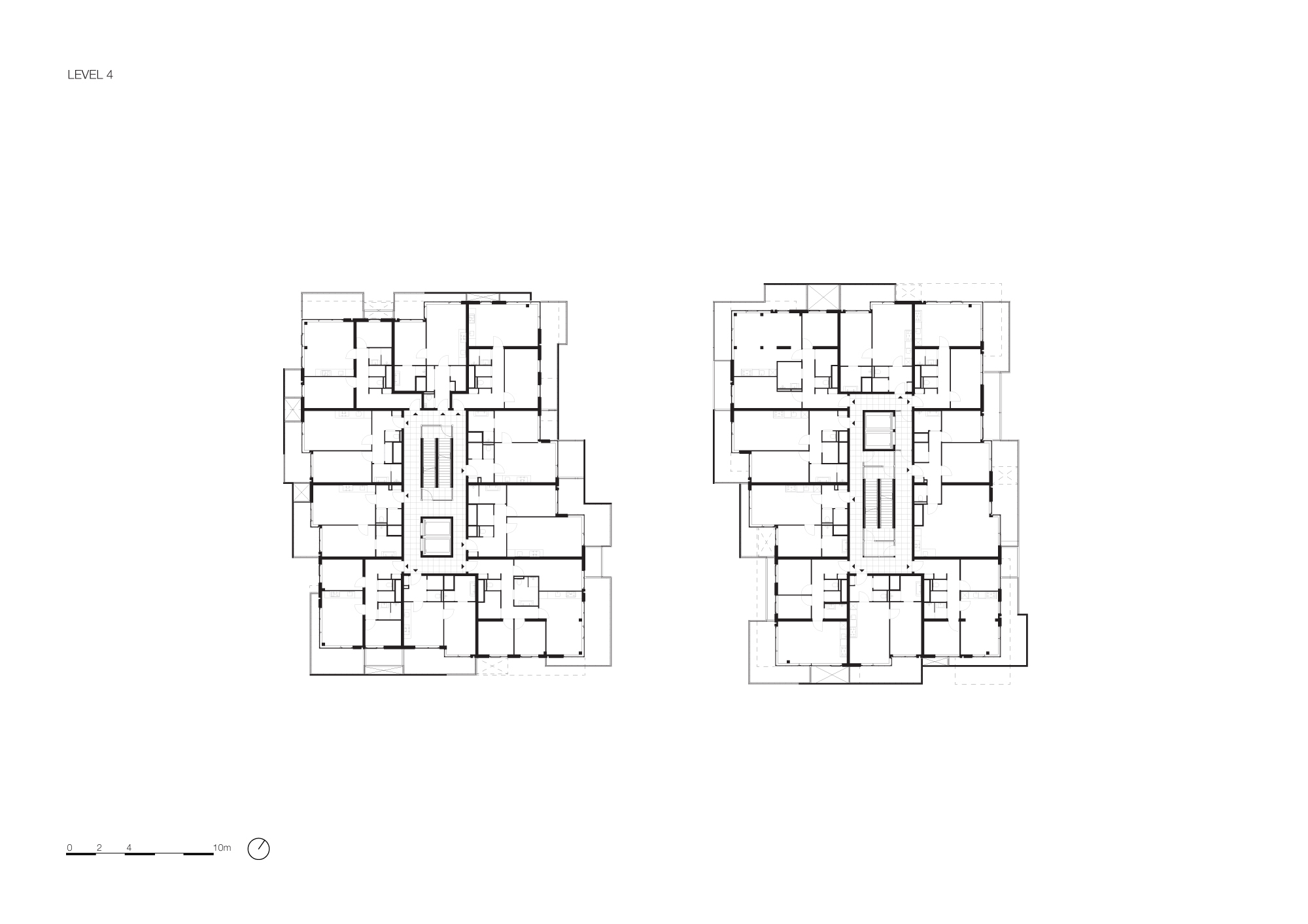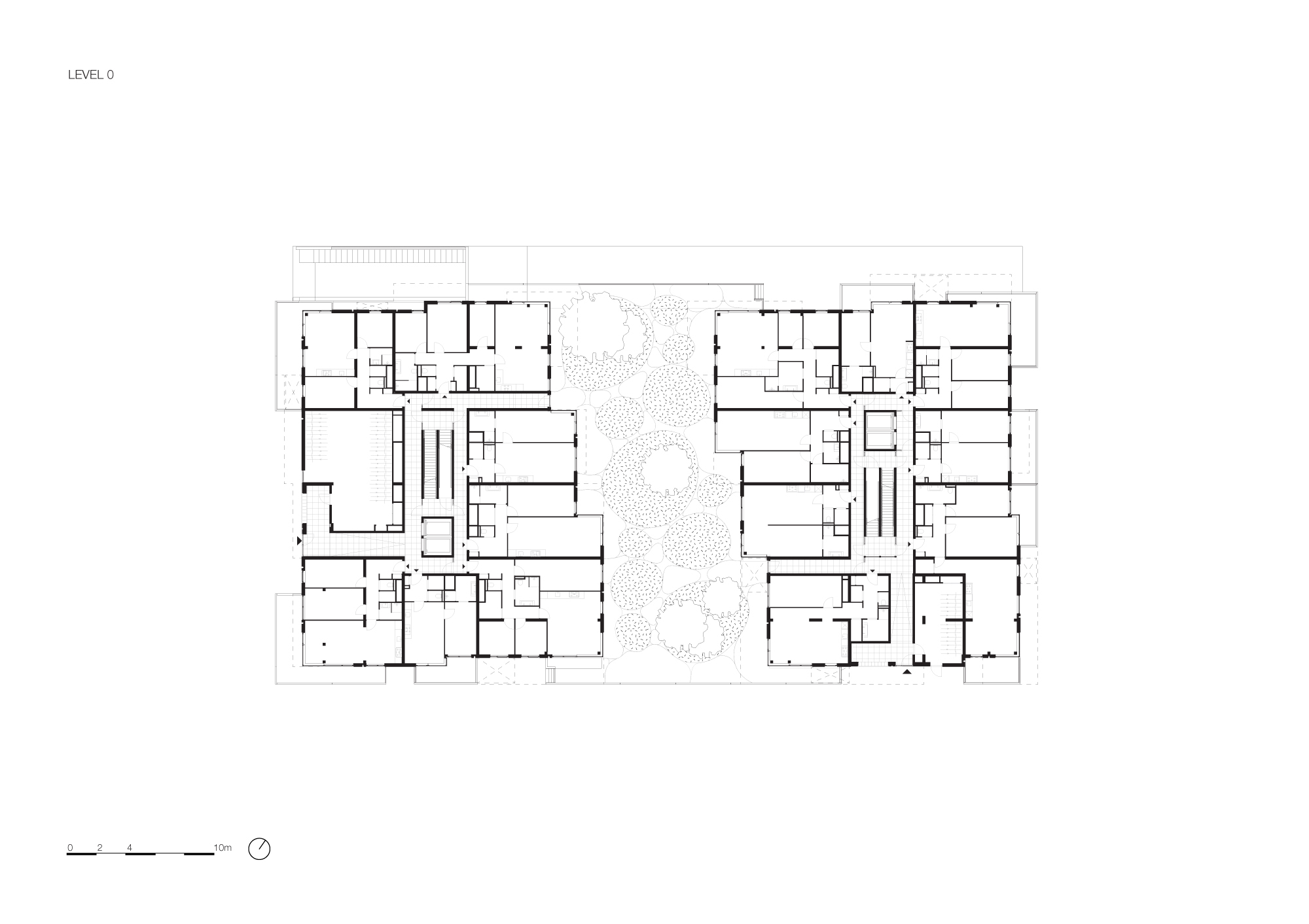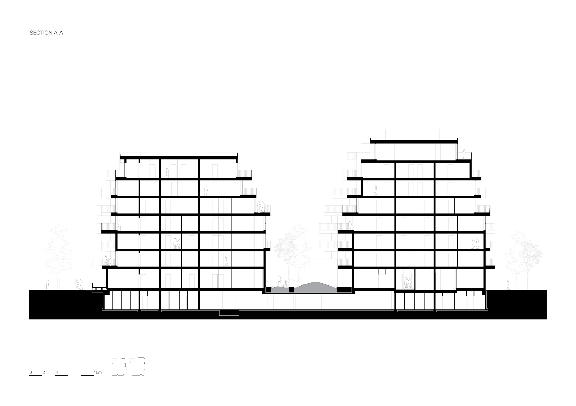 For this specific location, the urban plan prescribed two smaller separated buildings with a communal garden in between. The eastern building, with seven floors, has its entrance along the Spadinalaan, and the western building has eight floors along the Sausolitolaan, giving both villas a clear address. The natural stone-clad entrances lead to the central core with clearly visible stairs. On the ground floor, the entrance also gives access to the communal garden situated in between more private terraces.