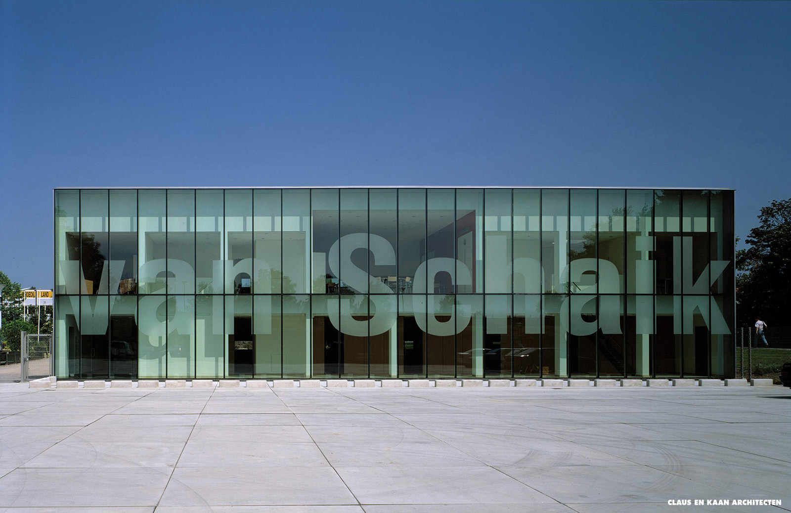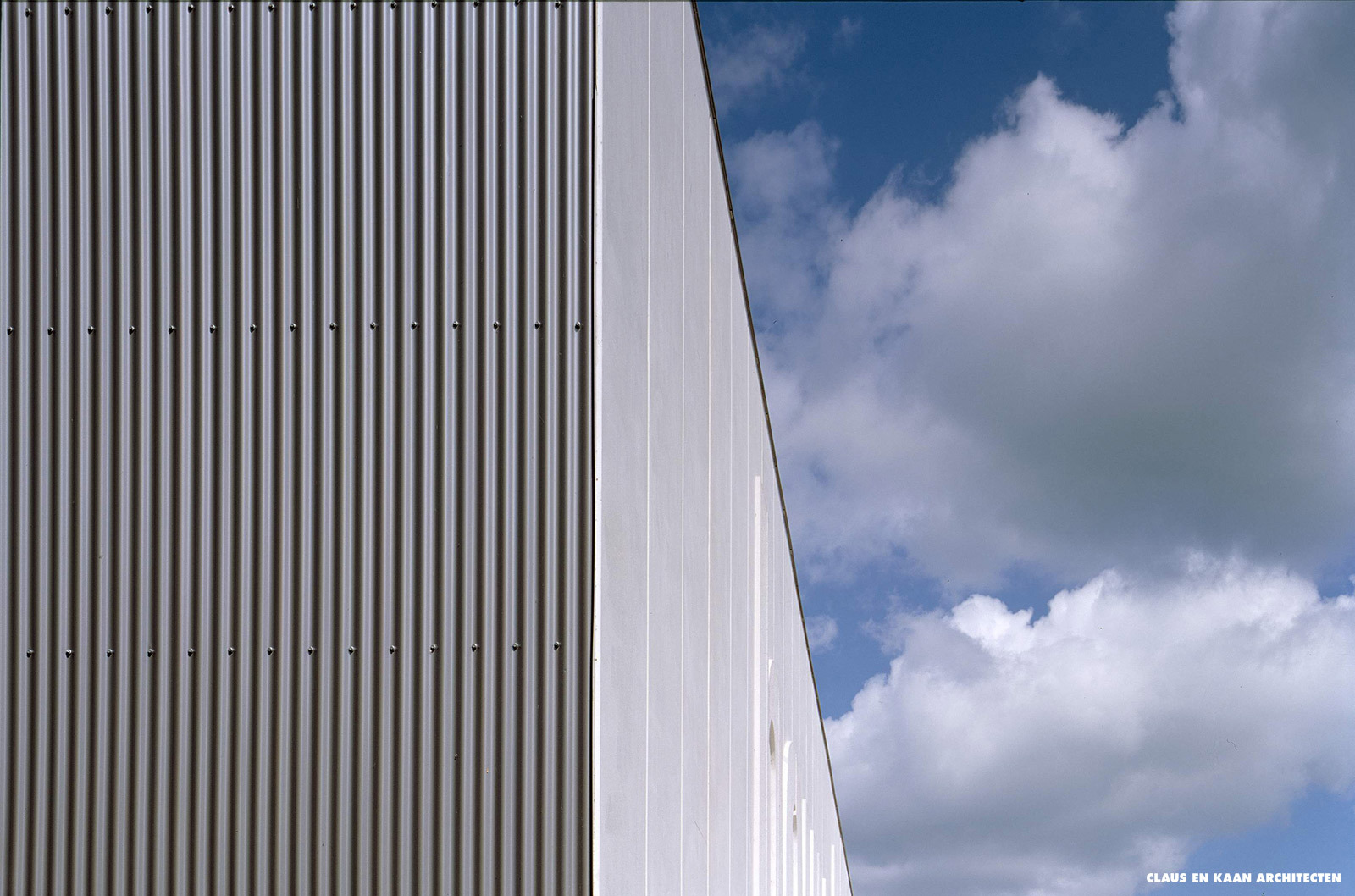 The Van Schaik Company Premises consists of two orthogonal volumes that turn their backs on a clutter of outlying sheds. One volume is for storage and the other is for offices. The latter has two facades: a closed one that faces onto the car park and a glazed south-facing façade that overlooks the work yard. Behind this glass screen is a double-height gallery that gives access to the offices.