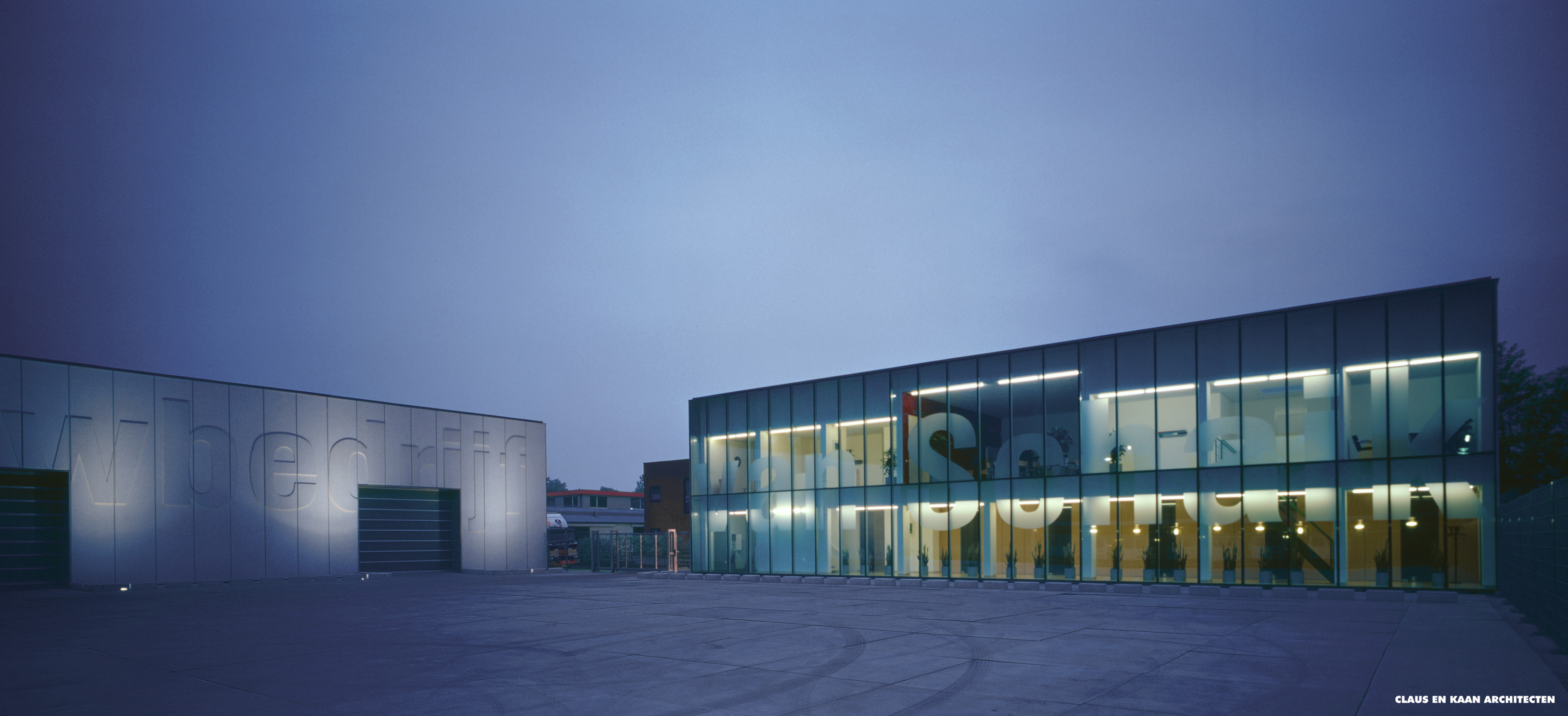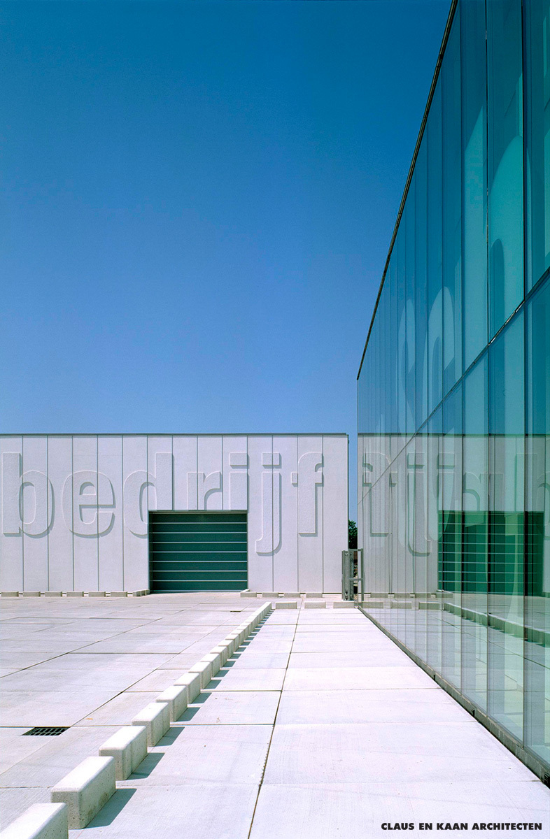 The car park is a clean and open service space. The two buildings of the premises are a linguistic and compositional ensemble: the glazed façade of the office is imprinted with the company’s name, while its field of operation – bouwbedrijf – is in relief on the concrete wall of the warehouse. The lettering, incorporated into the façade, ensures that no illuminated signs or neon letters disrupt the architectural order. The design effectively represents the company through its volumes rather than through iconic formalism.