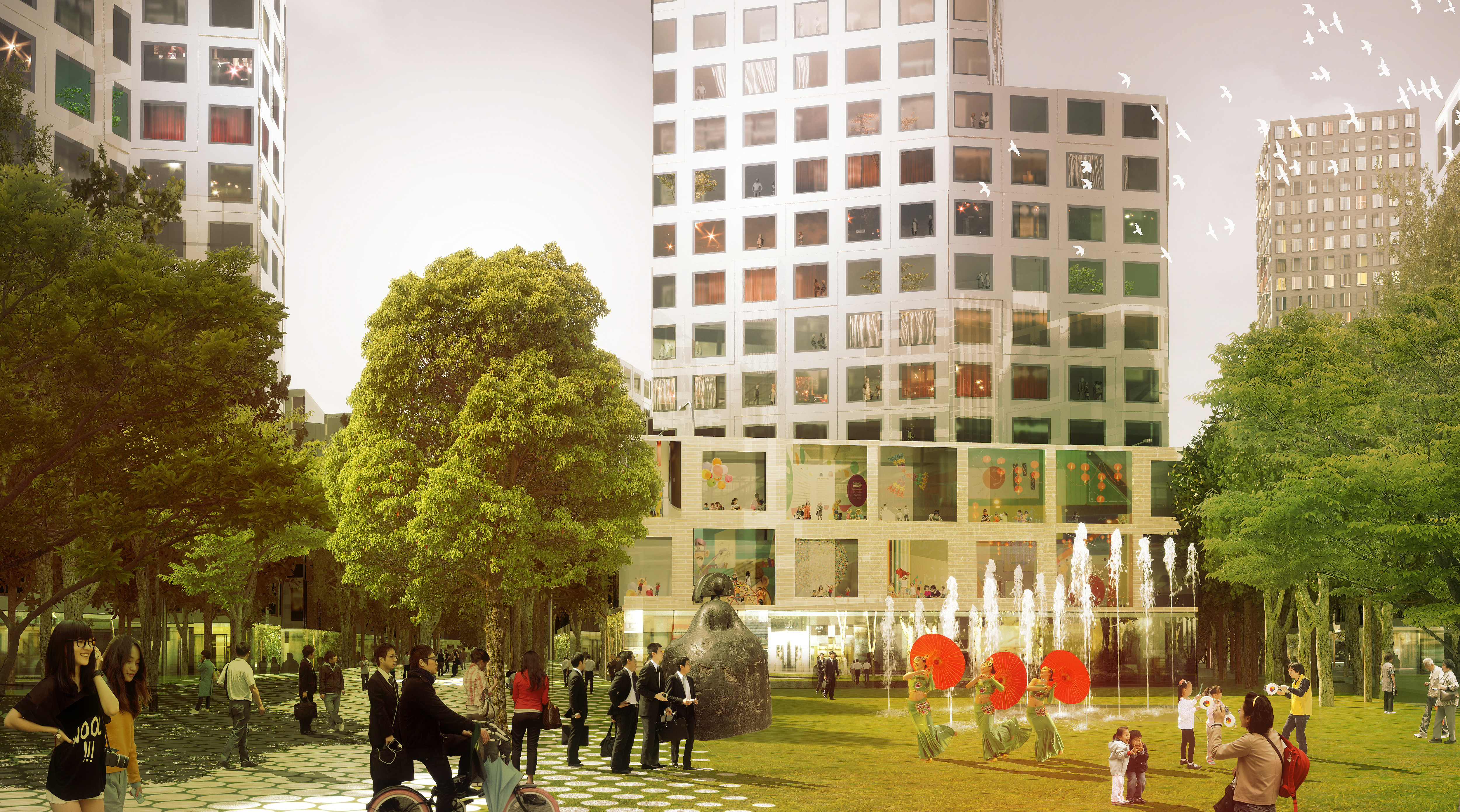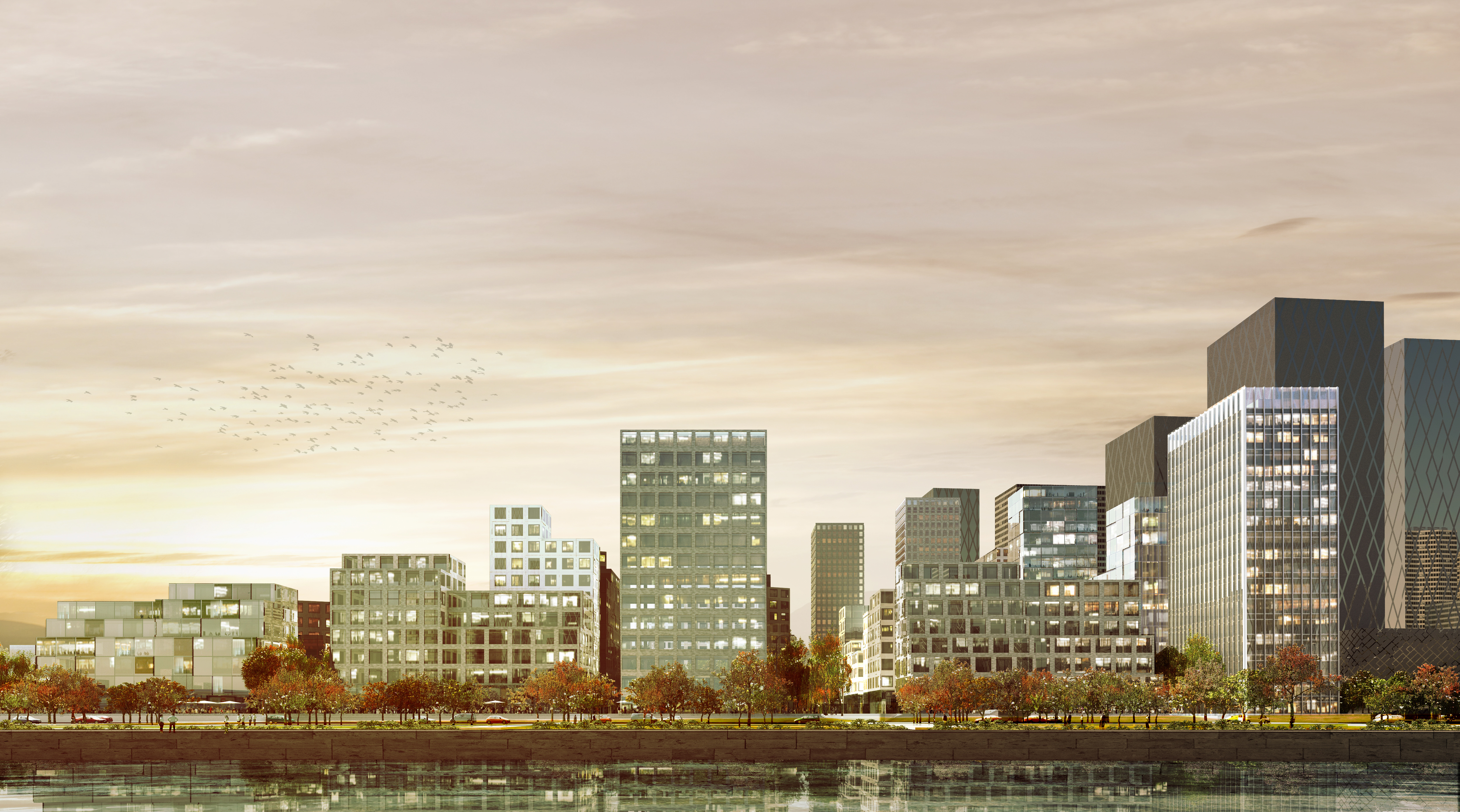 The 350 x 300-meter plot is half-covered by towers, residential, and retail buildings, with 20% of this space devoted to green areas. The height of the new development slopes from 100 to 6 meters to optimize the number of south-facing South spaces and to give the buildings views of the highest tower of the CBD. The landscape is composed of a large green cross connecting North-South and East-West and a series of boardwalks, private courtyards, and a sport area located along the navigable river.