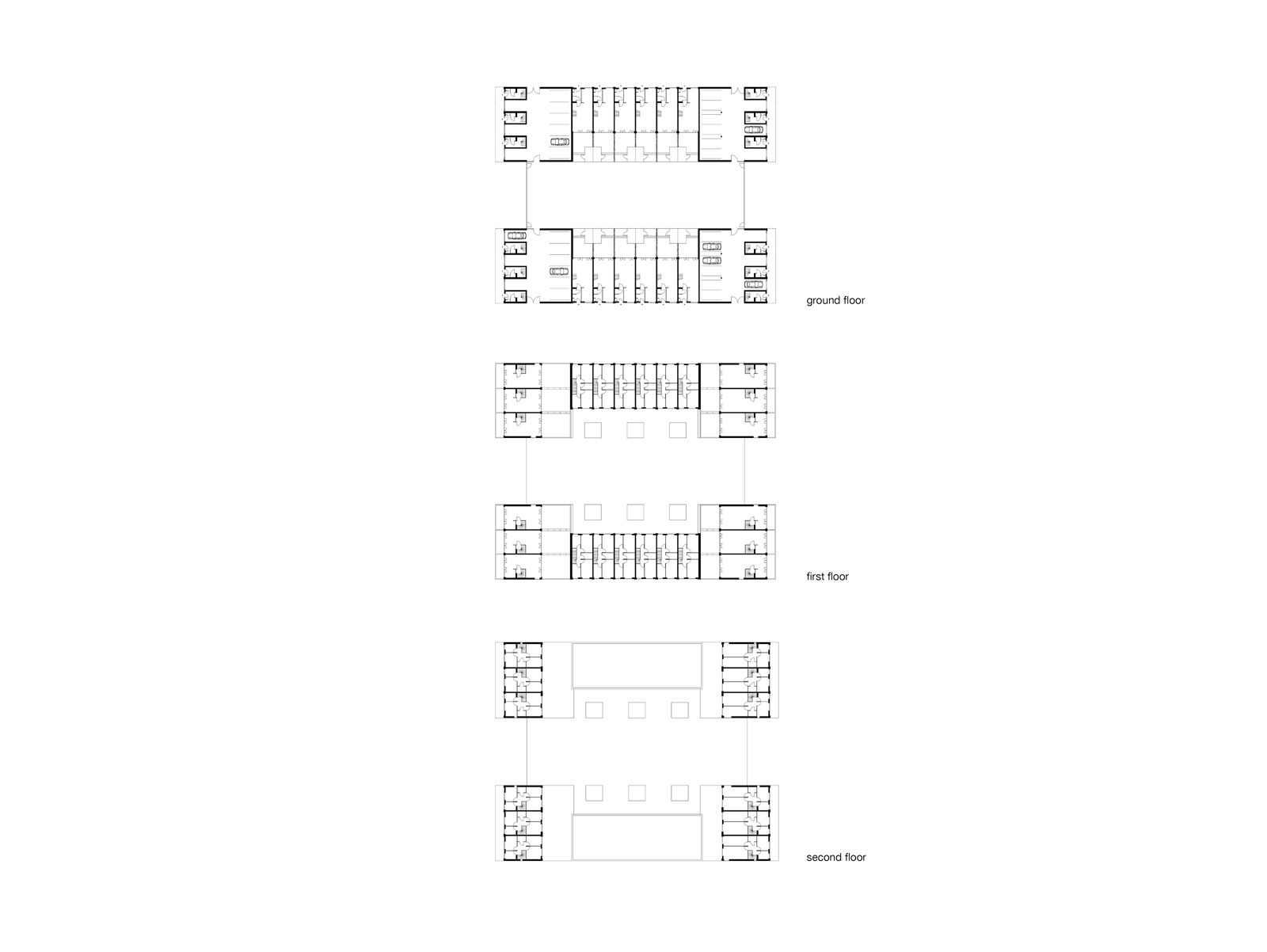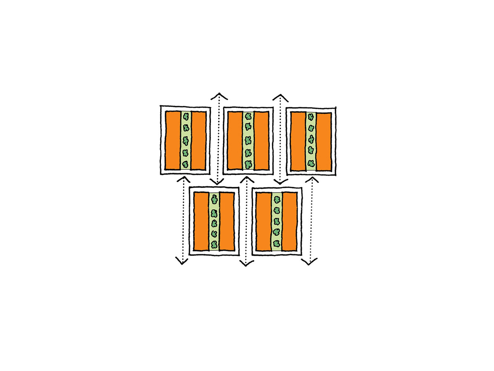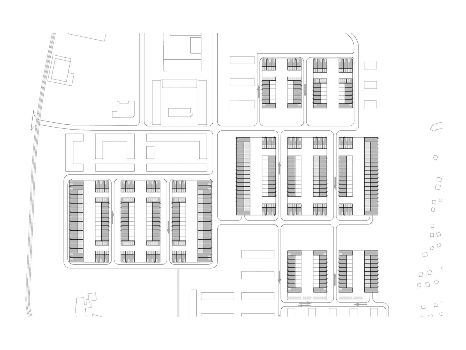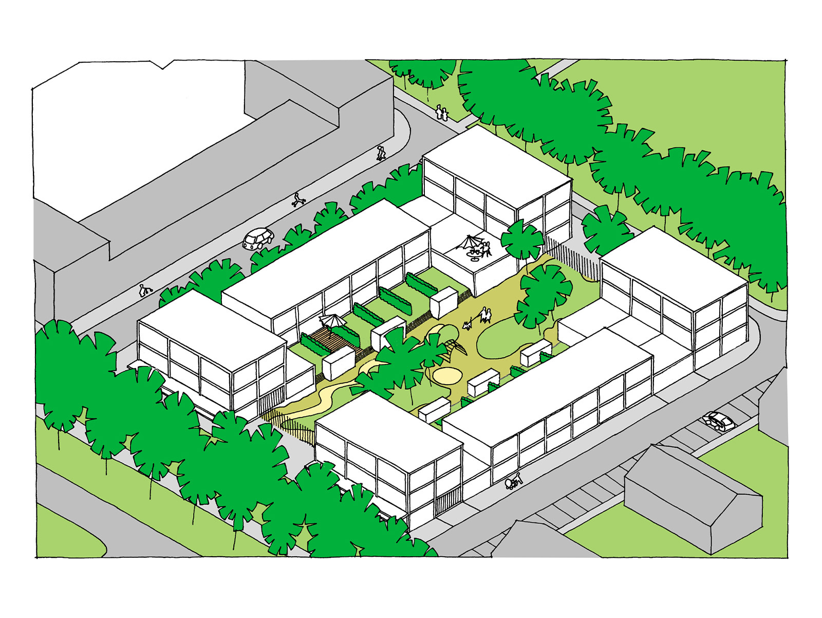 With a realistic parking ratio of two cars per dwelling, the resulting neighbourhood has an increased building density and a 50% reduction in the number of inhabitants. The design focuses on retaining and reinforcing the abundant natural green spaces and original structures characteristic of post-war districts. This was achieved by maintaining the footprints of the old buildings but inserting a different typology: single family dwellings with collective gardens.